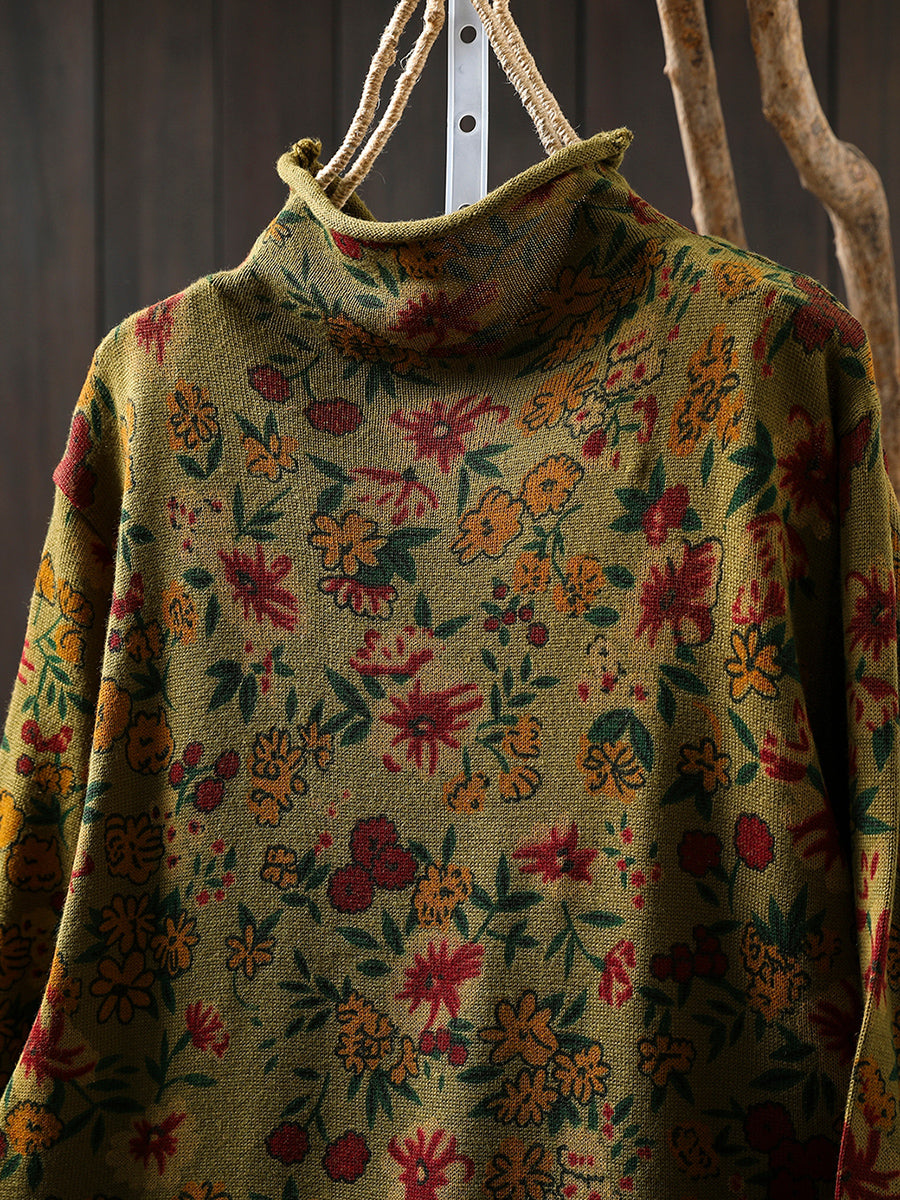 Women Vintage Autumn Flower Half-Turtleneck Sweater