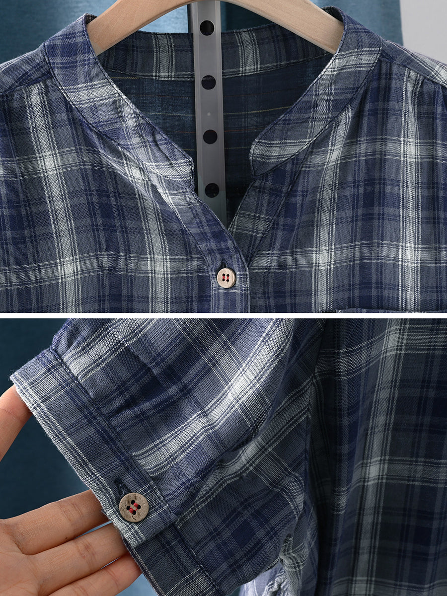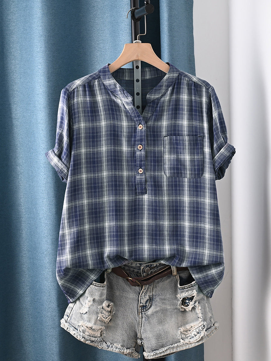 Women Summer Vintage Plaid O-Neck 100%Cotton Shirt