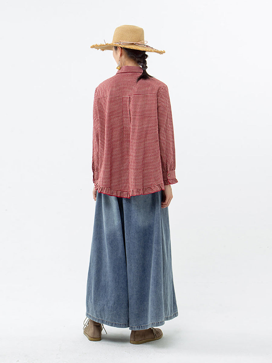 Plus Size Women Plaid Hand-Made Linen Cotton Loose Shirt