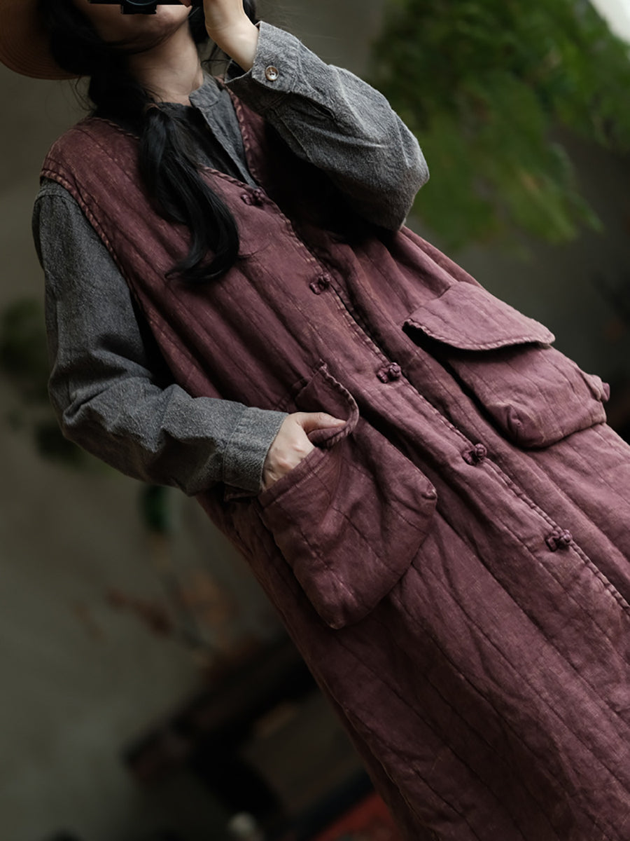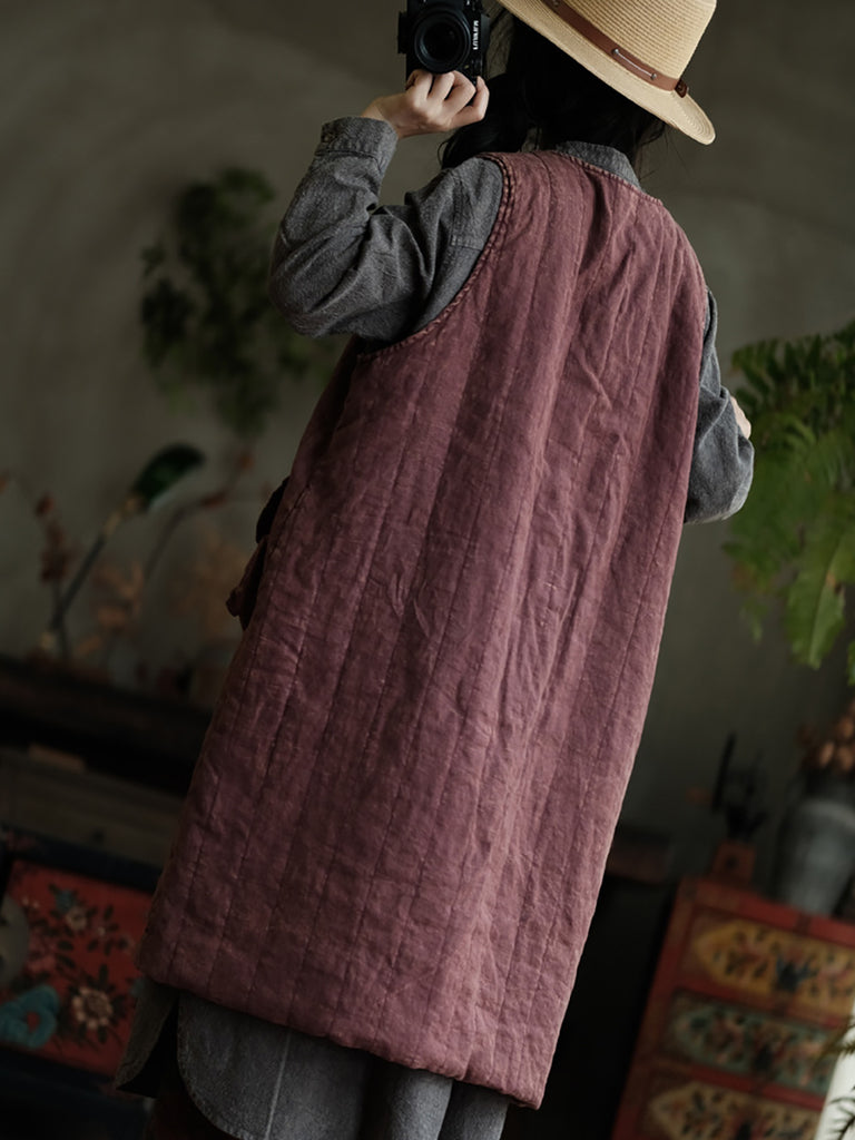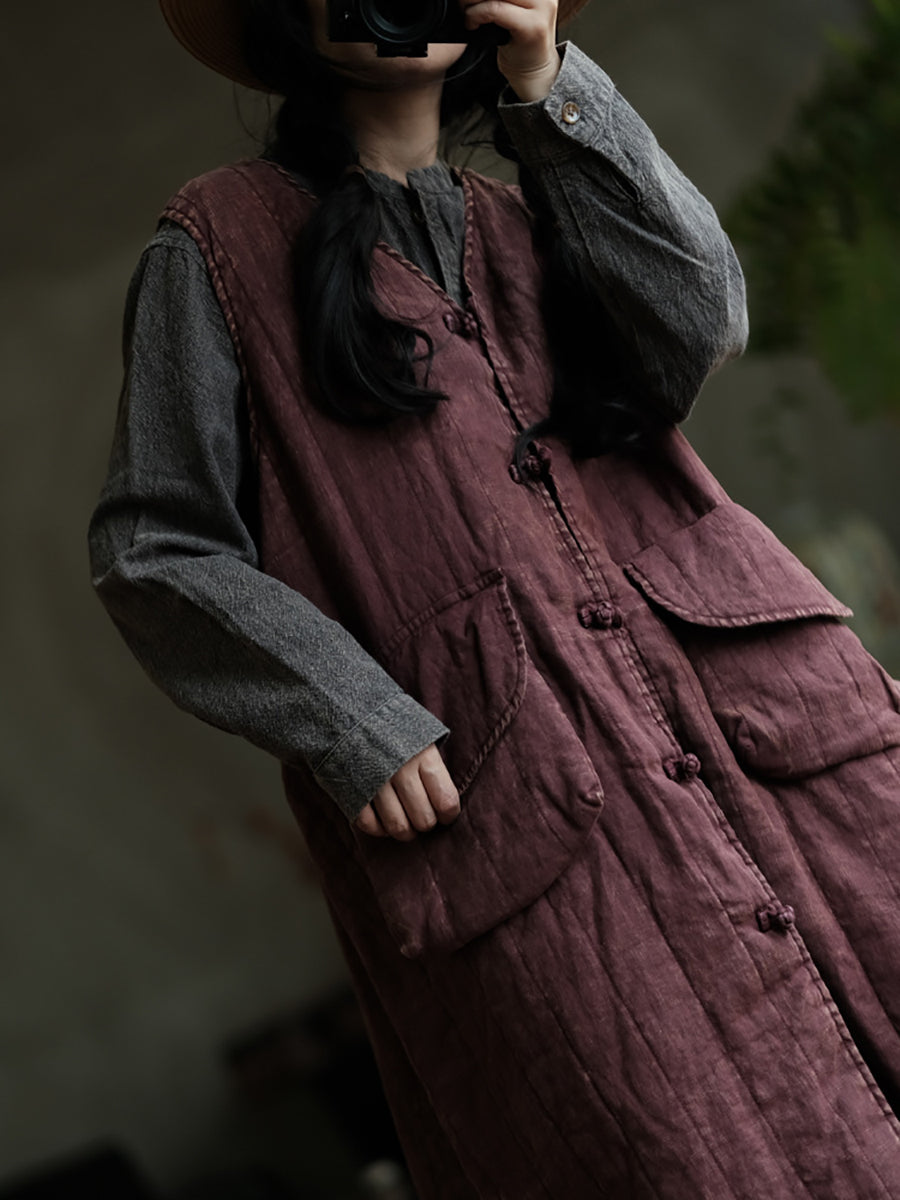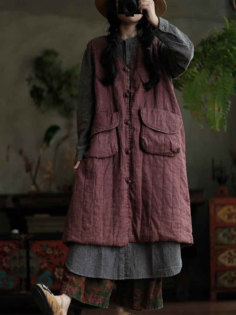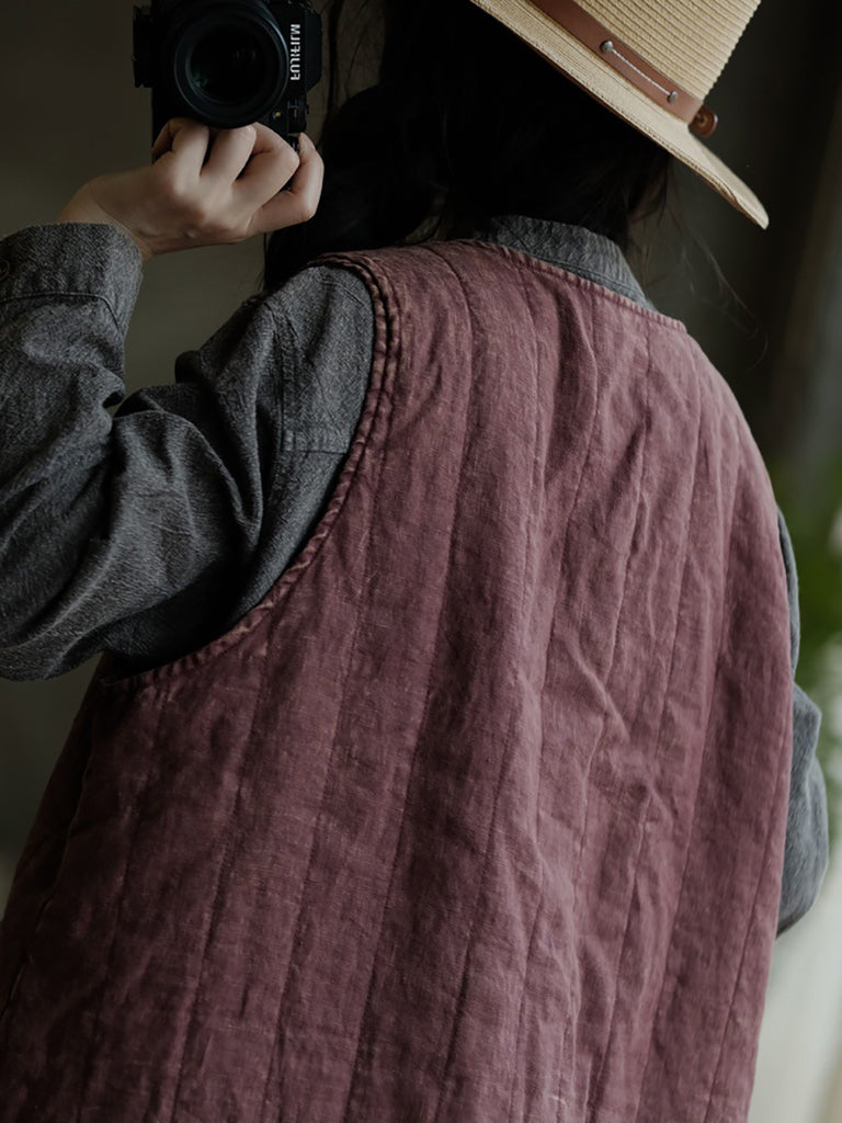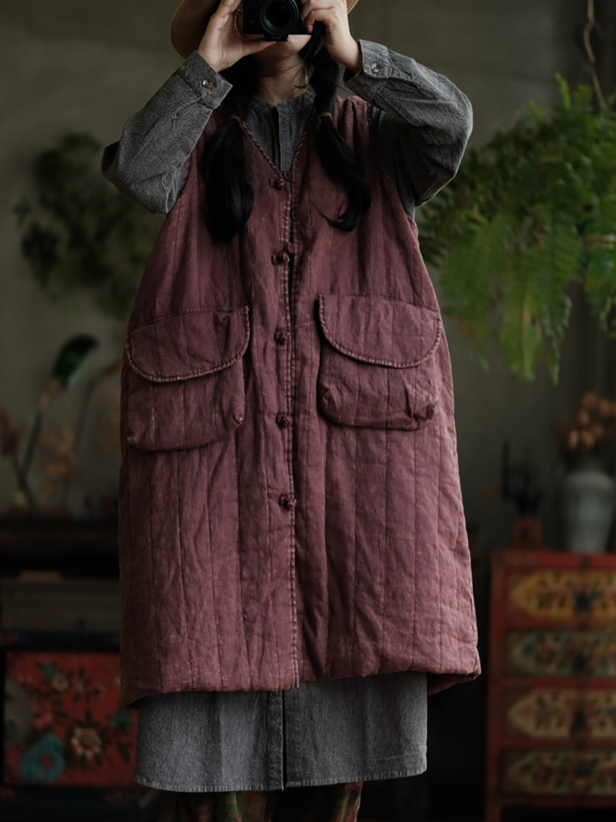 Women Retro Solid V-Neck Buttoned Cotton Vest Coat