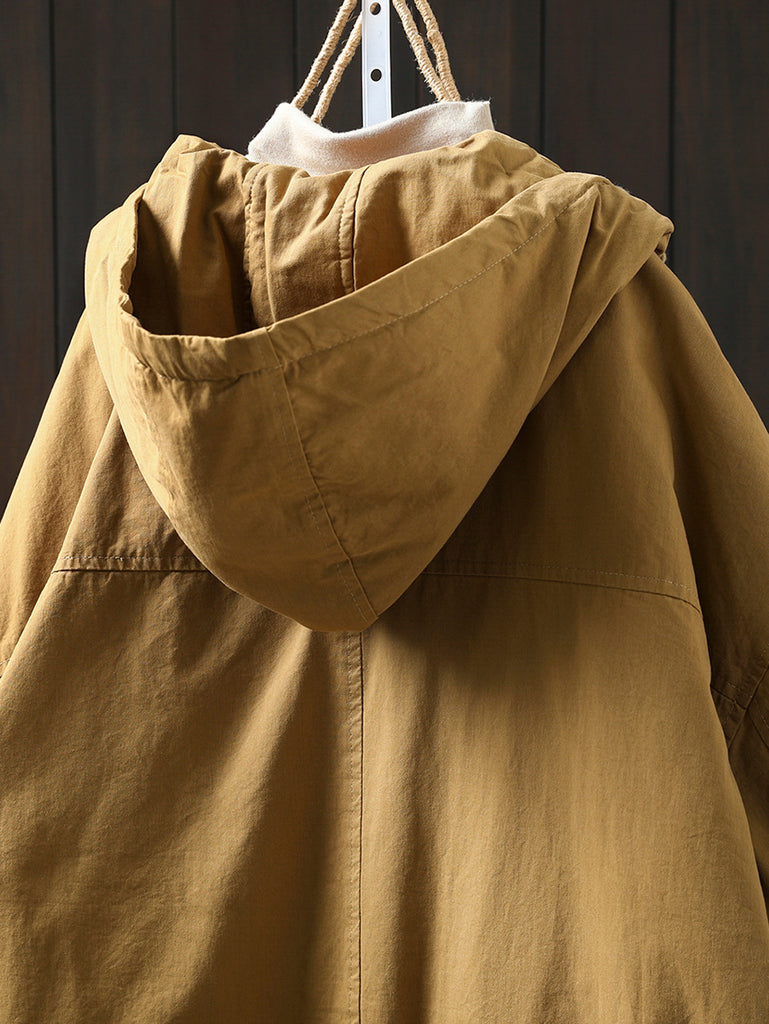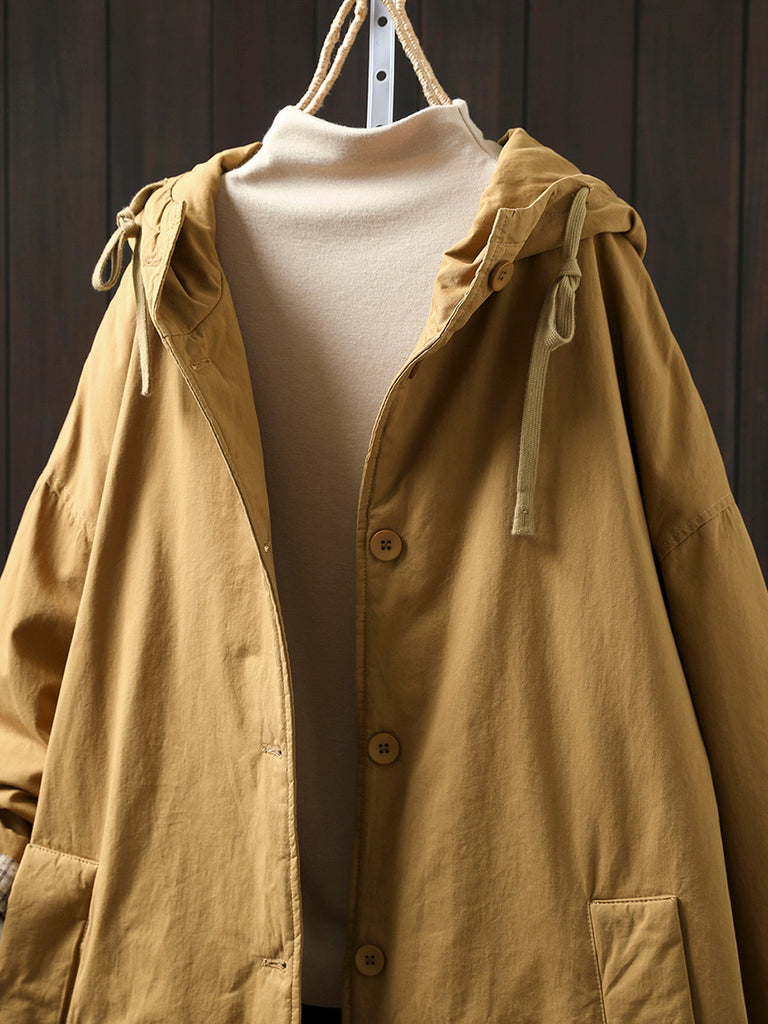 This coat features a solid color design with a hooded collar. It has full-length raglan sleeves with a vintage-inspired style, ideal for autumn and winter seasons.