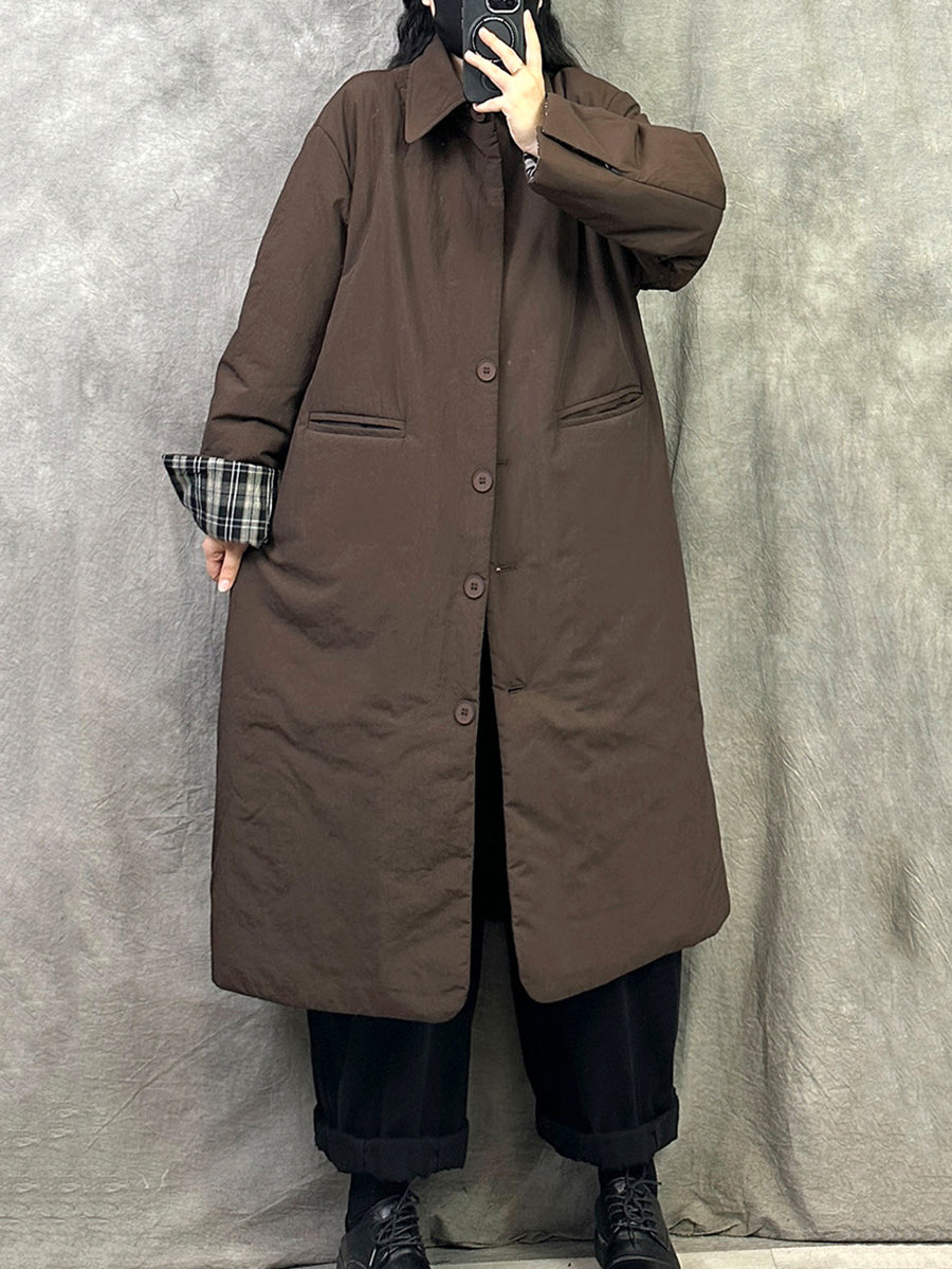 Crafted from cotton, this women's long coat features a solid color design and a classic turn-down collar. It offers full-length sleeves with a casual, regular fit, making it an ideal choice for autumn and winter seasons.