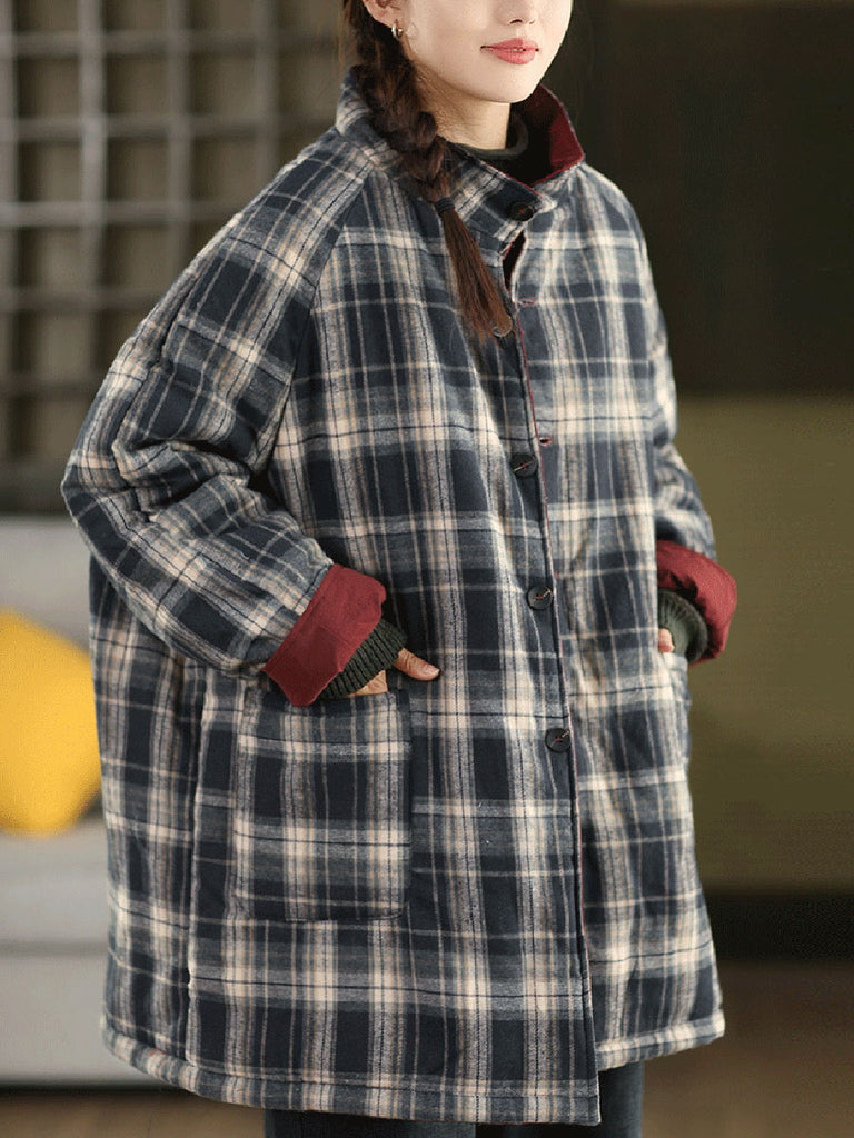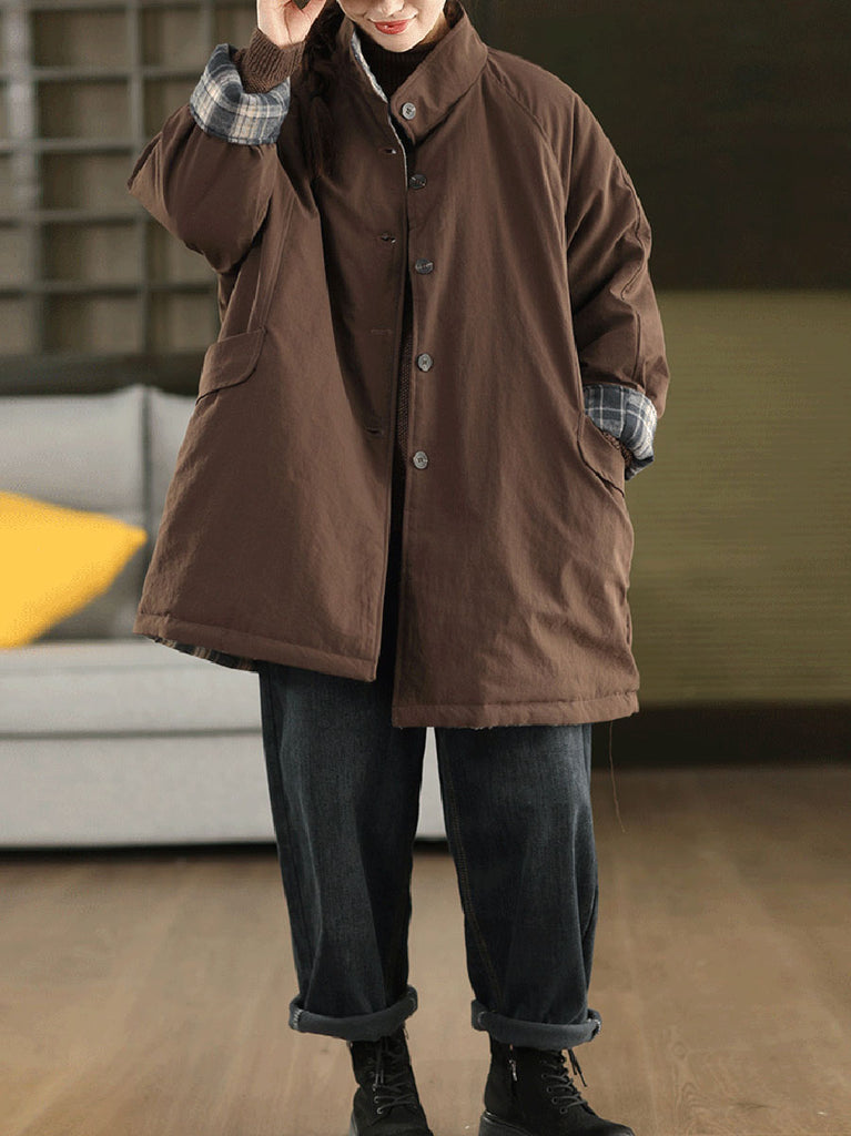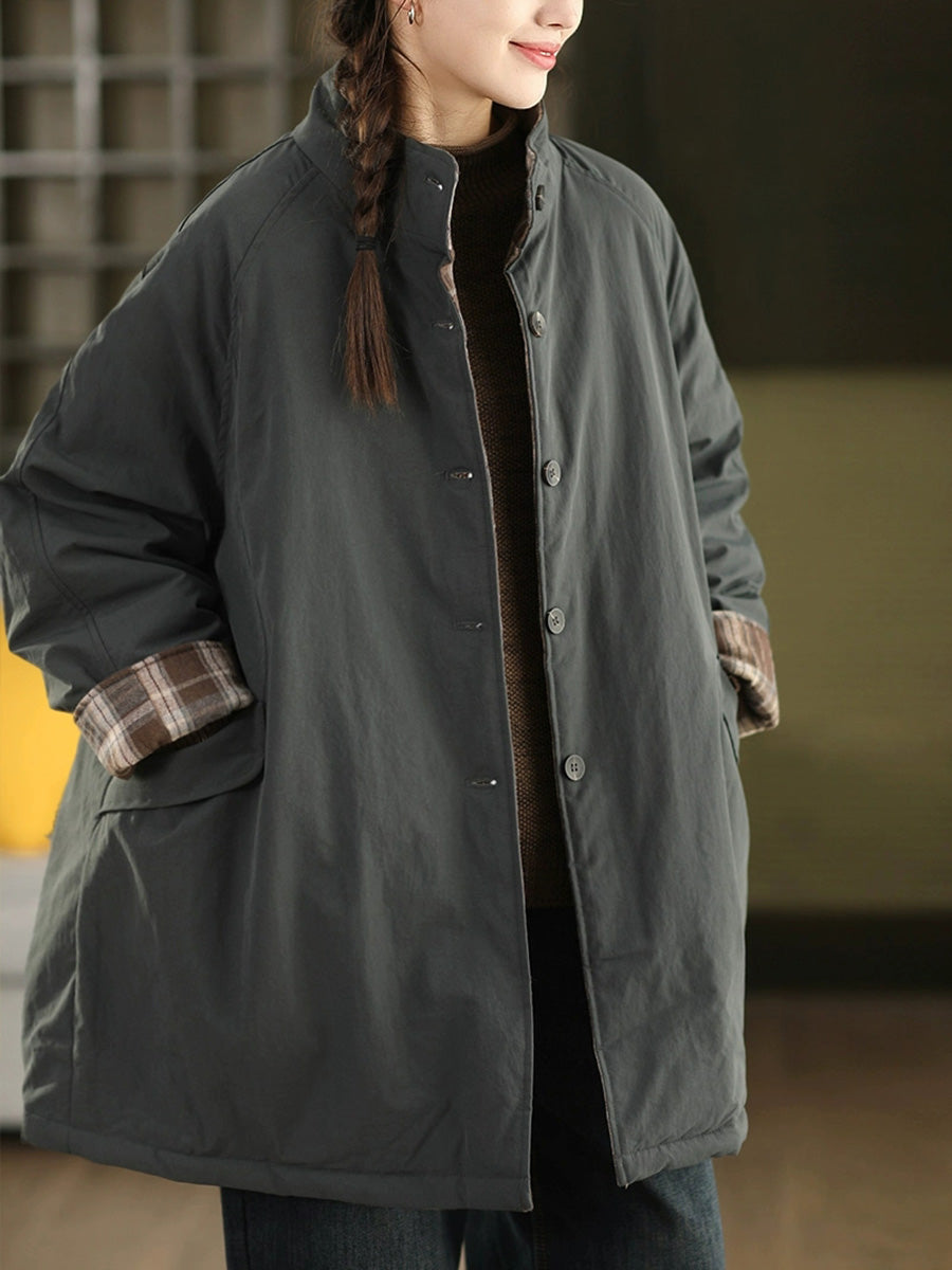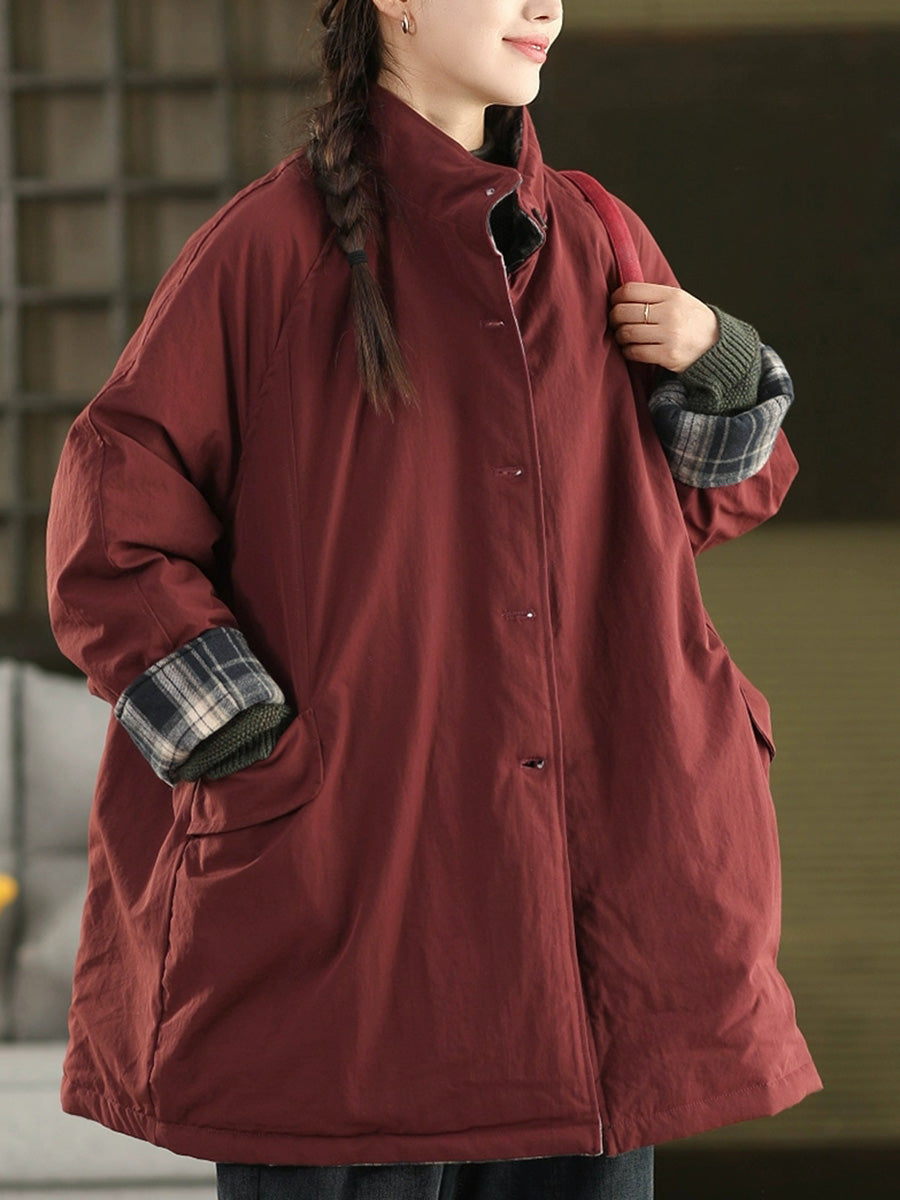 Crafted from cotton, this padded coat features a classic pure color design and a turn-down collar. Designed with full raglan sleeves offering a retro style, it is ideal for both