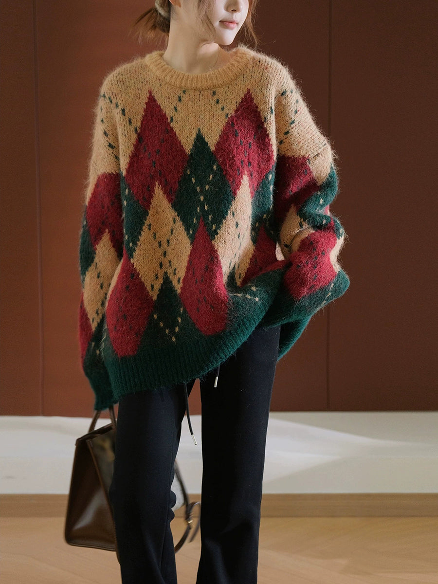Women Autumn Retro Rhomboids Knitted O-Neck Sweater