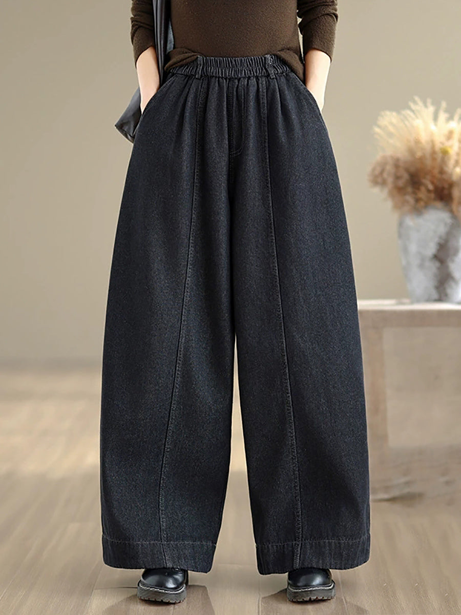 Women Autumn Retro Denim Fleece-lined Straight Pants
