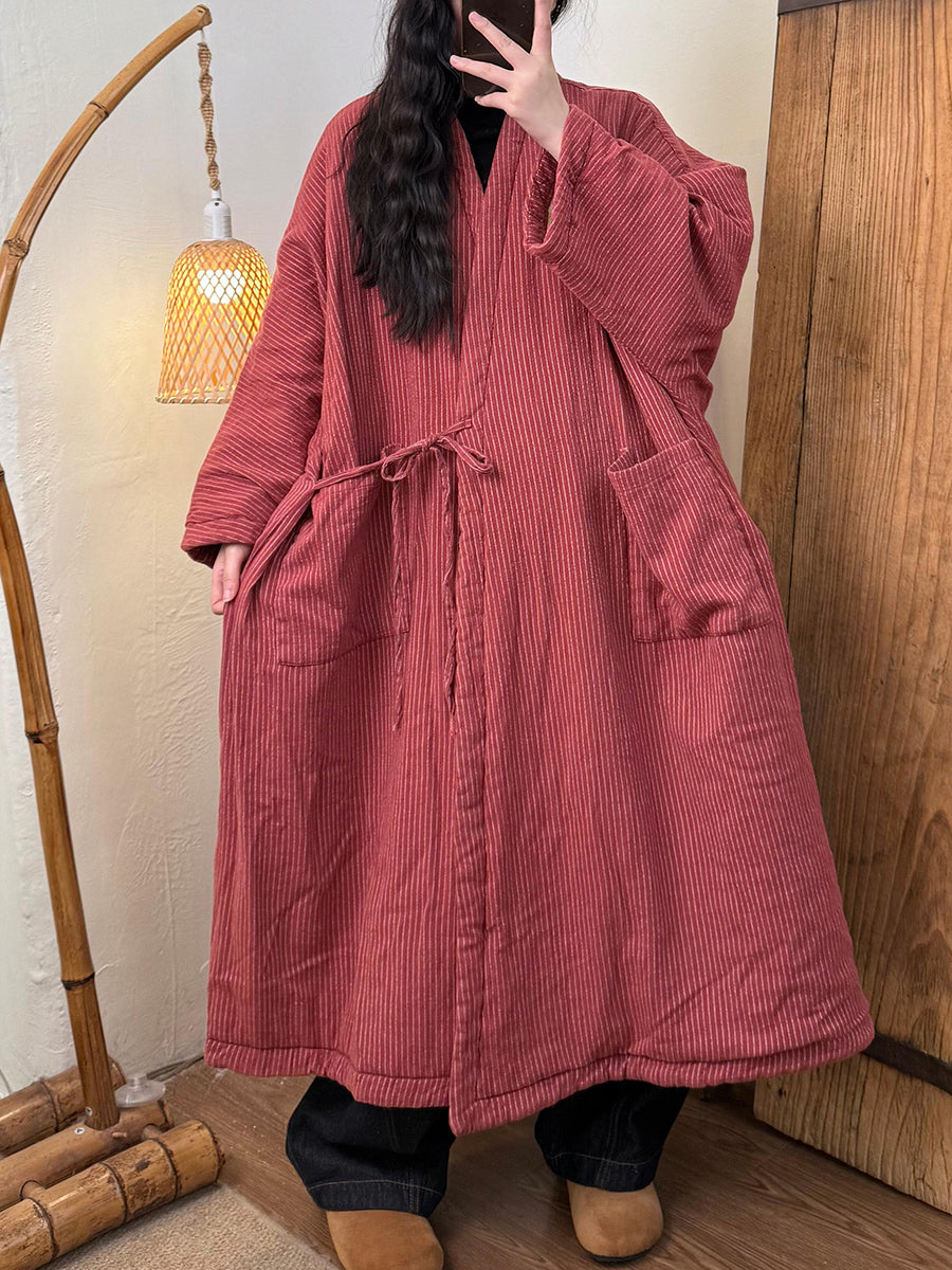 Women Winter Vintage Stripe Padded V-Neck Overcoat