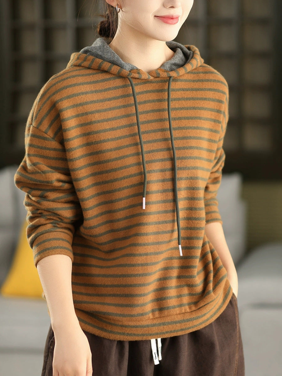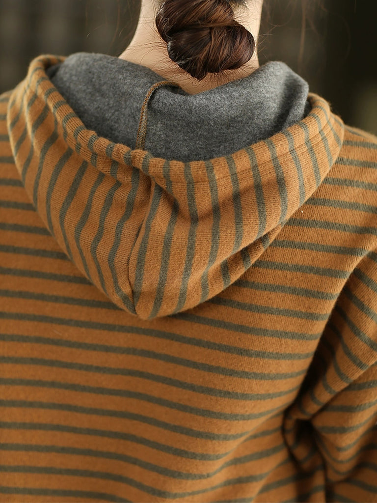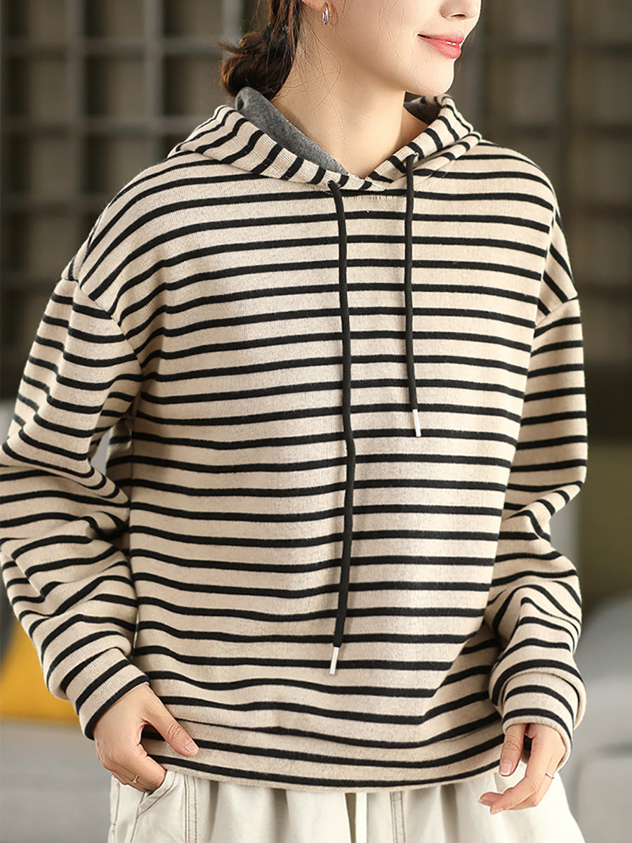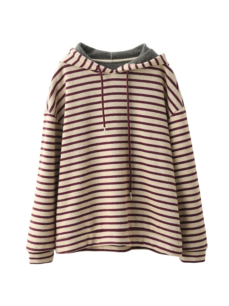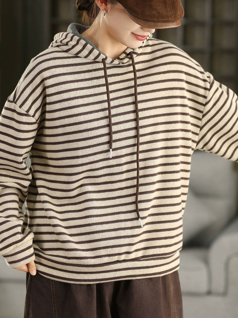 Women Vintage Autumn Stripe 100%Cotton Hoodie