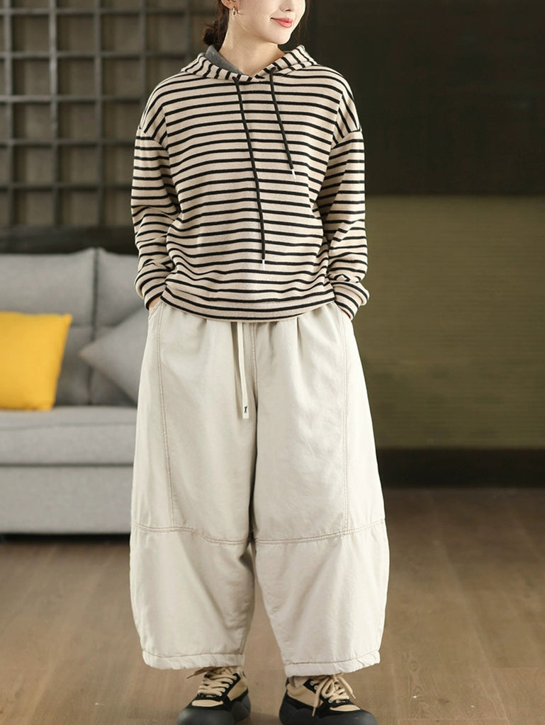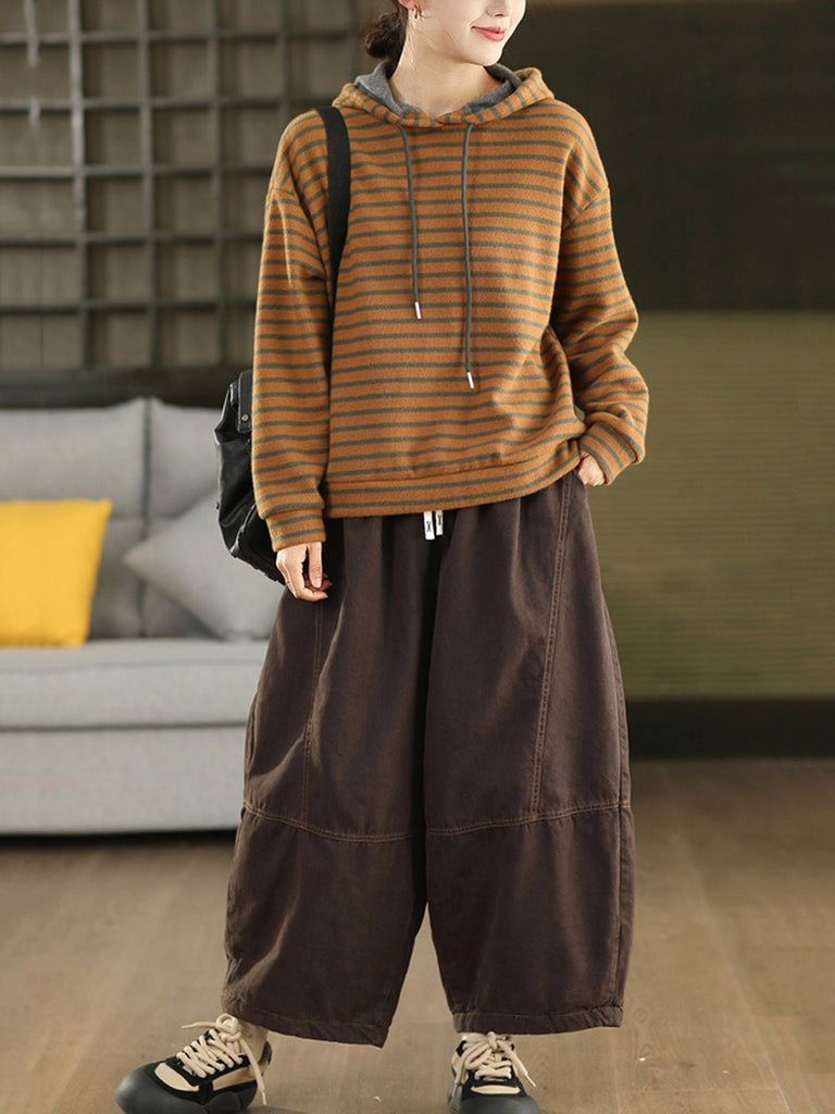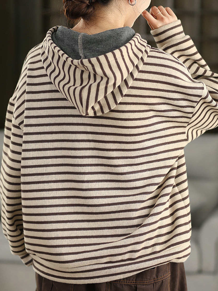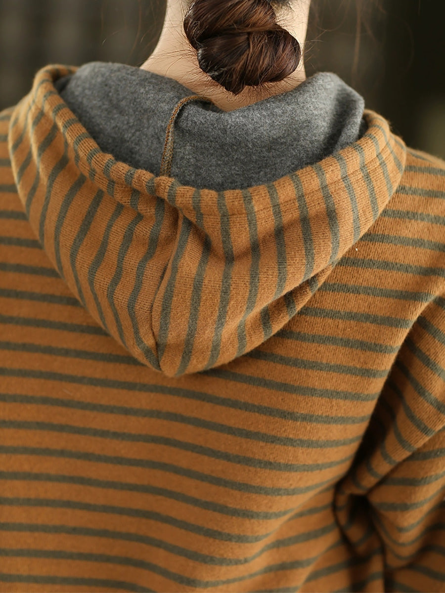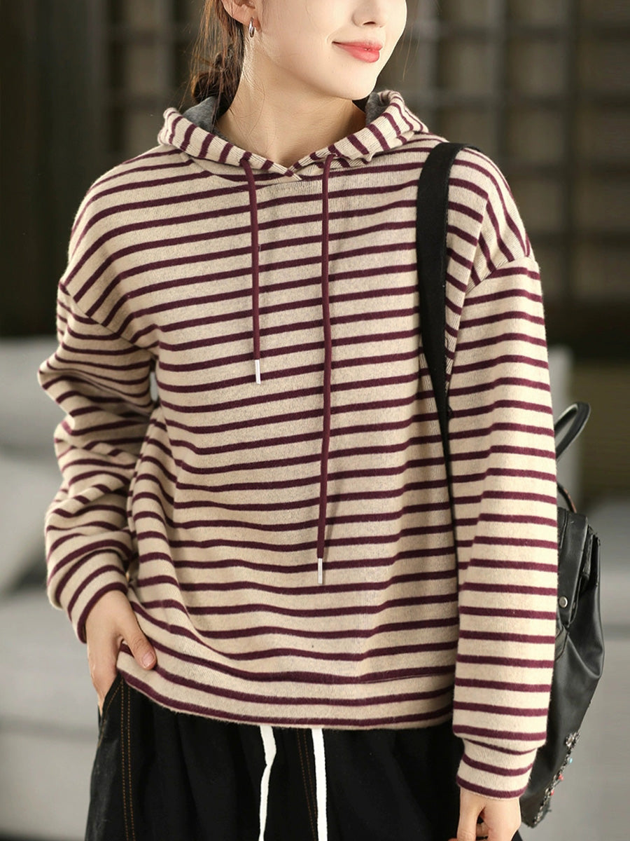 Women Vintage Autumn Stripe 100%Cotton Hoodie