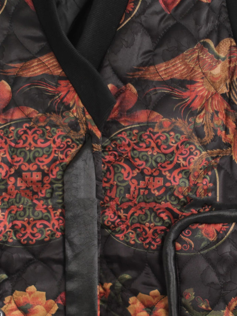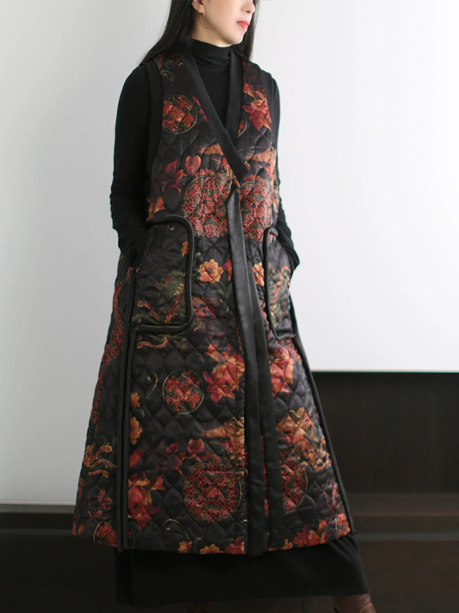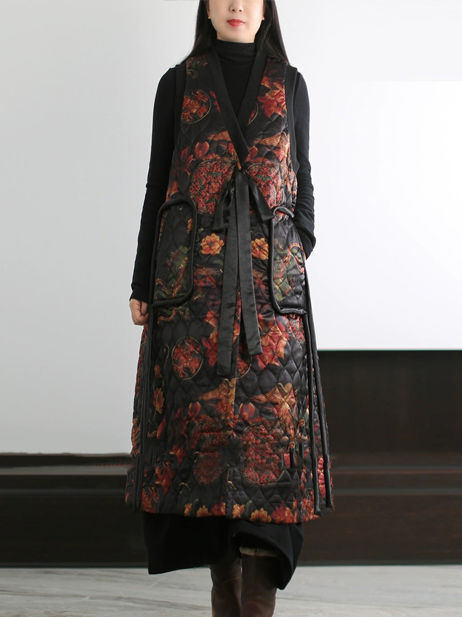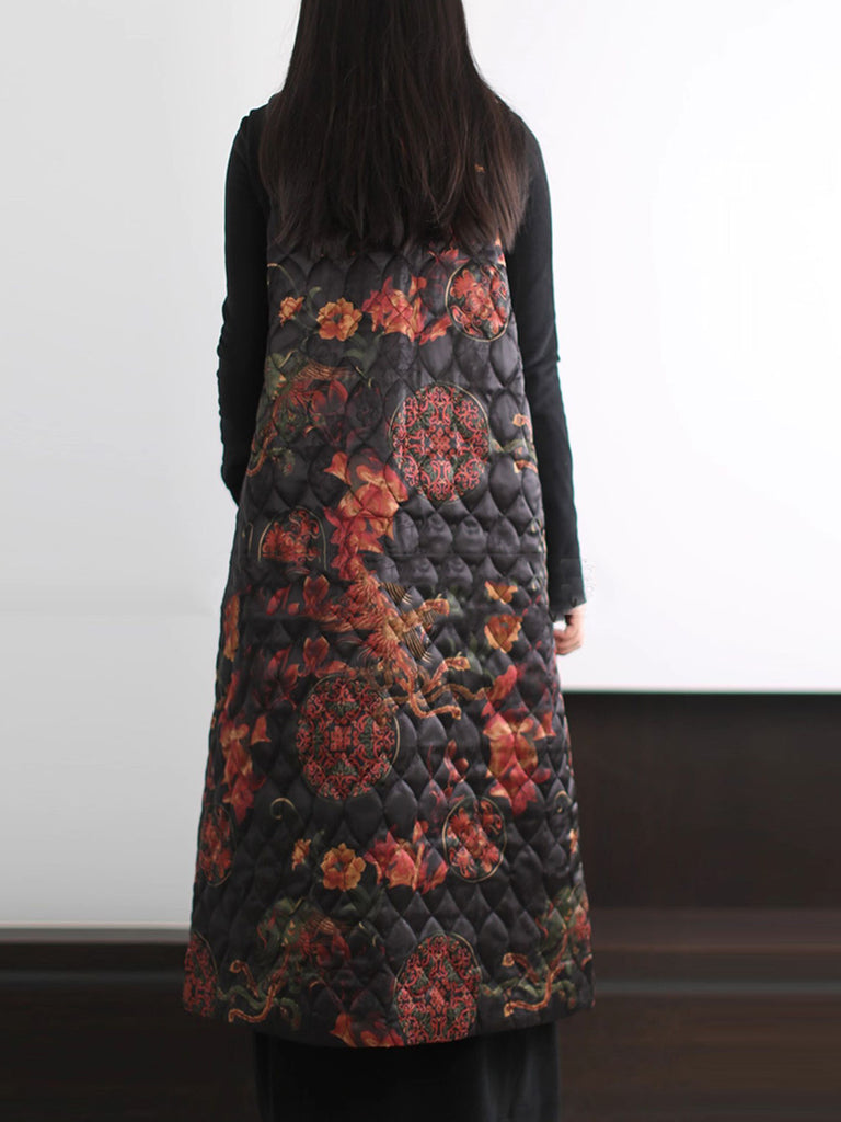 Women Winter Retro Flower V-Neck Cotton Vest Coat