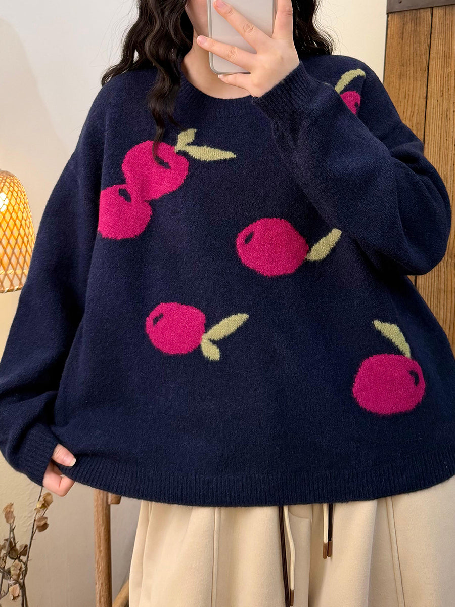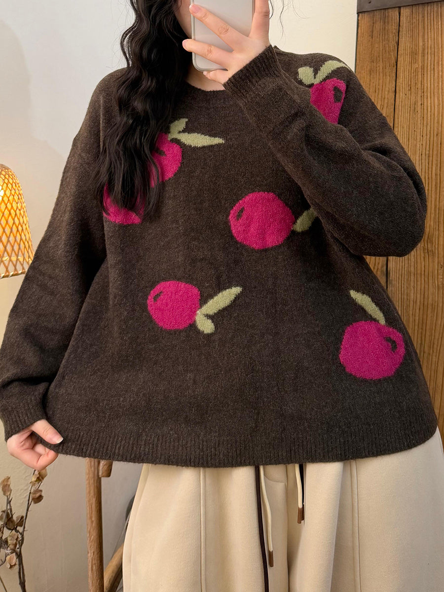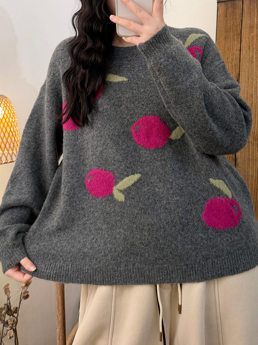 Women Autumn Artsy Apple O-Neck Knitted Sweater