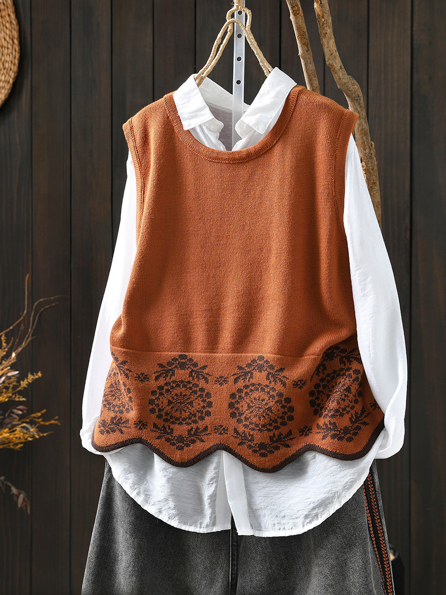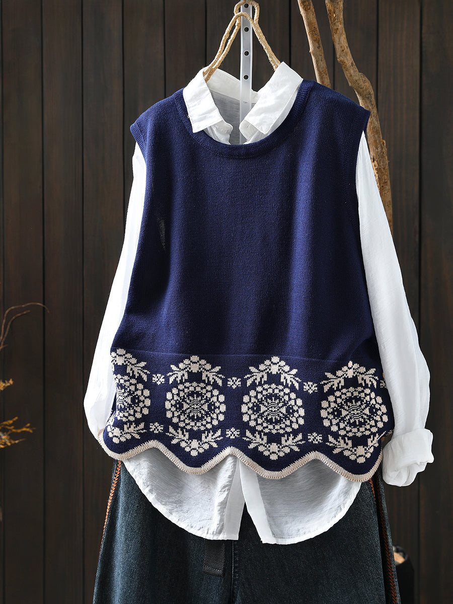Women Artsy Flower Wave Hem O-Neck Knitted Vest