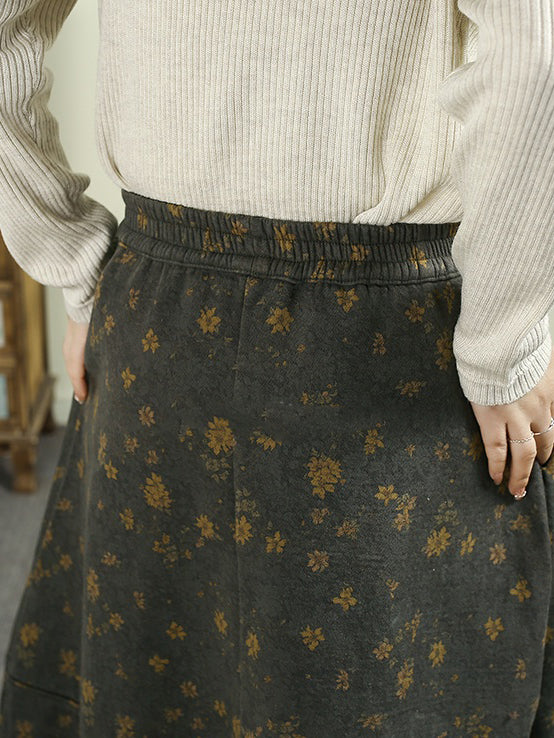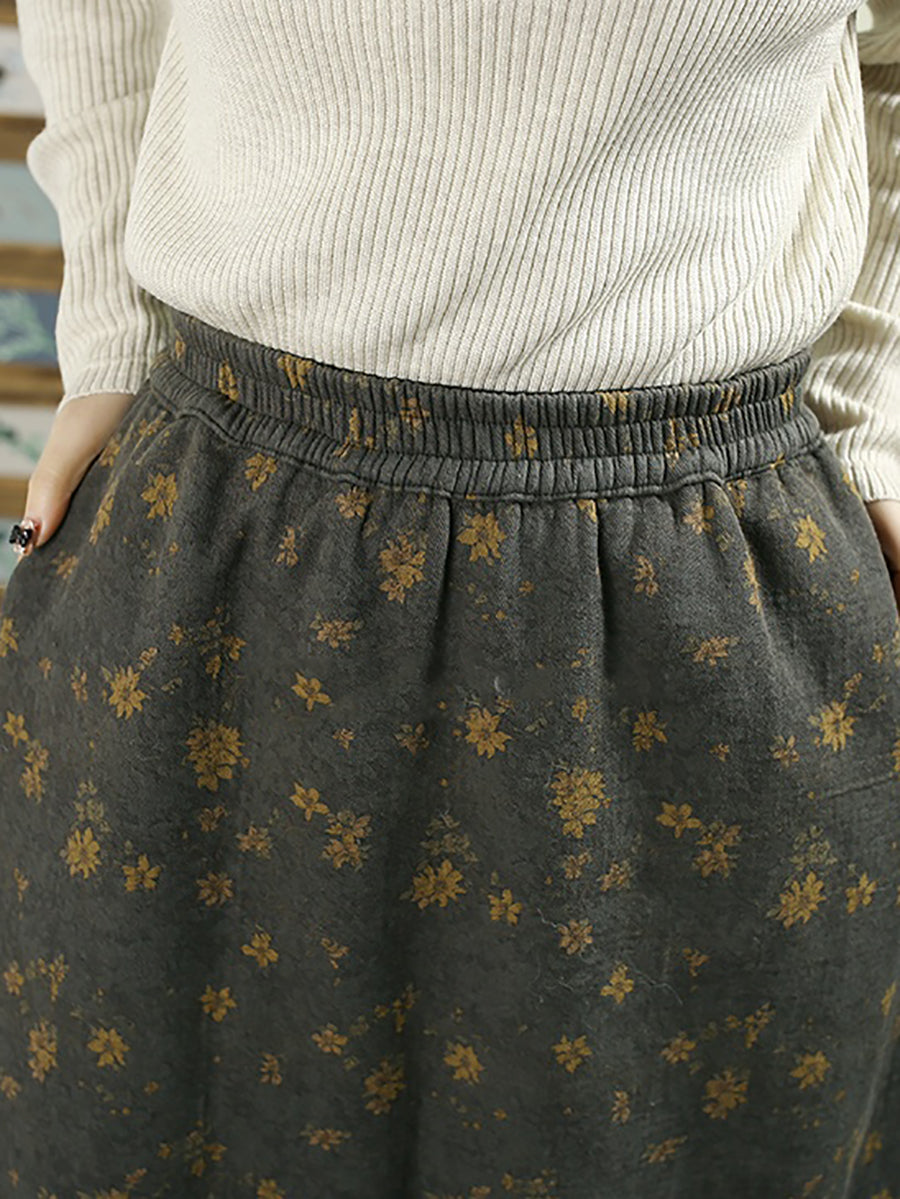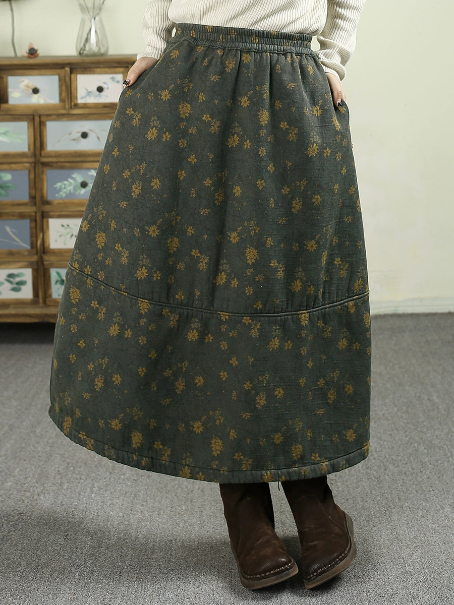 Women Winter Fleece-lined Floral 100%Cotton A-Shape Skirt