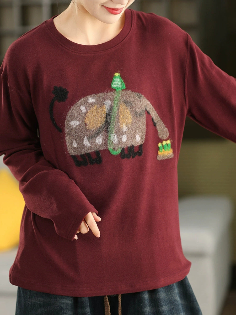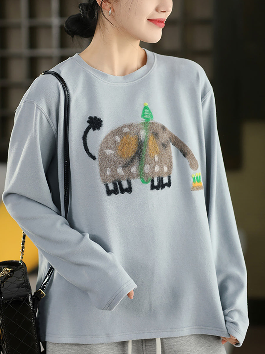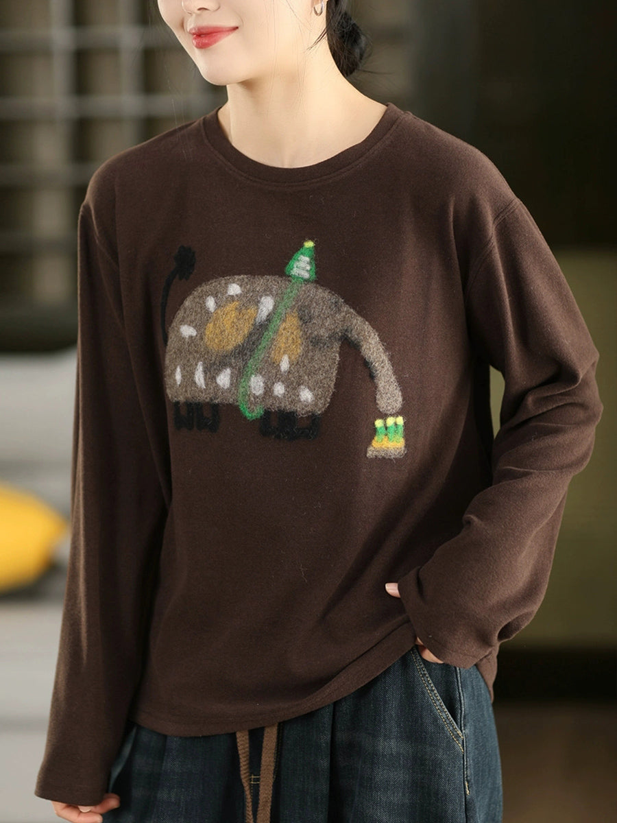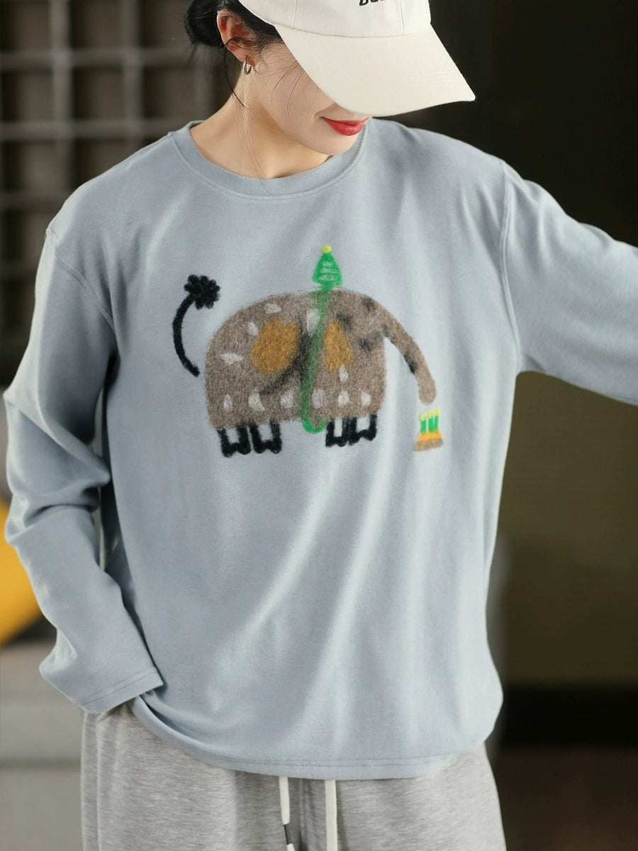 Women Winter Artsy Elephant Flocking O-Neck Blouse
