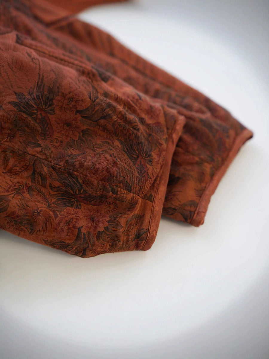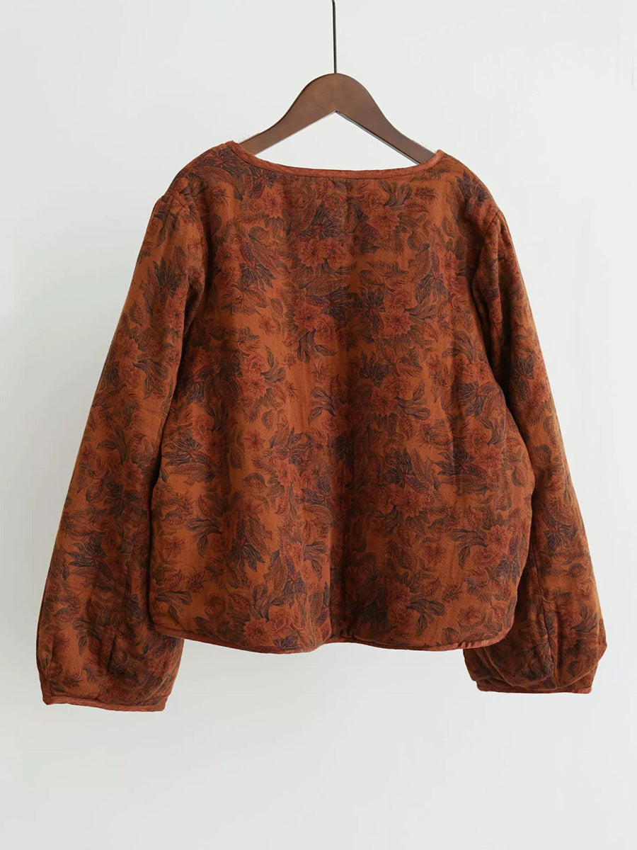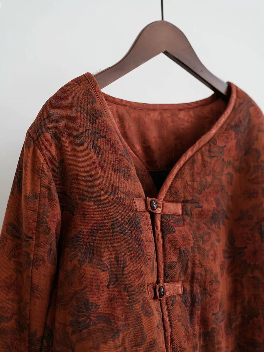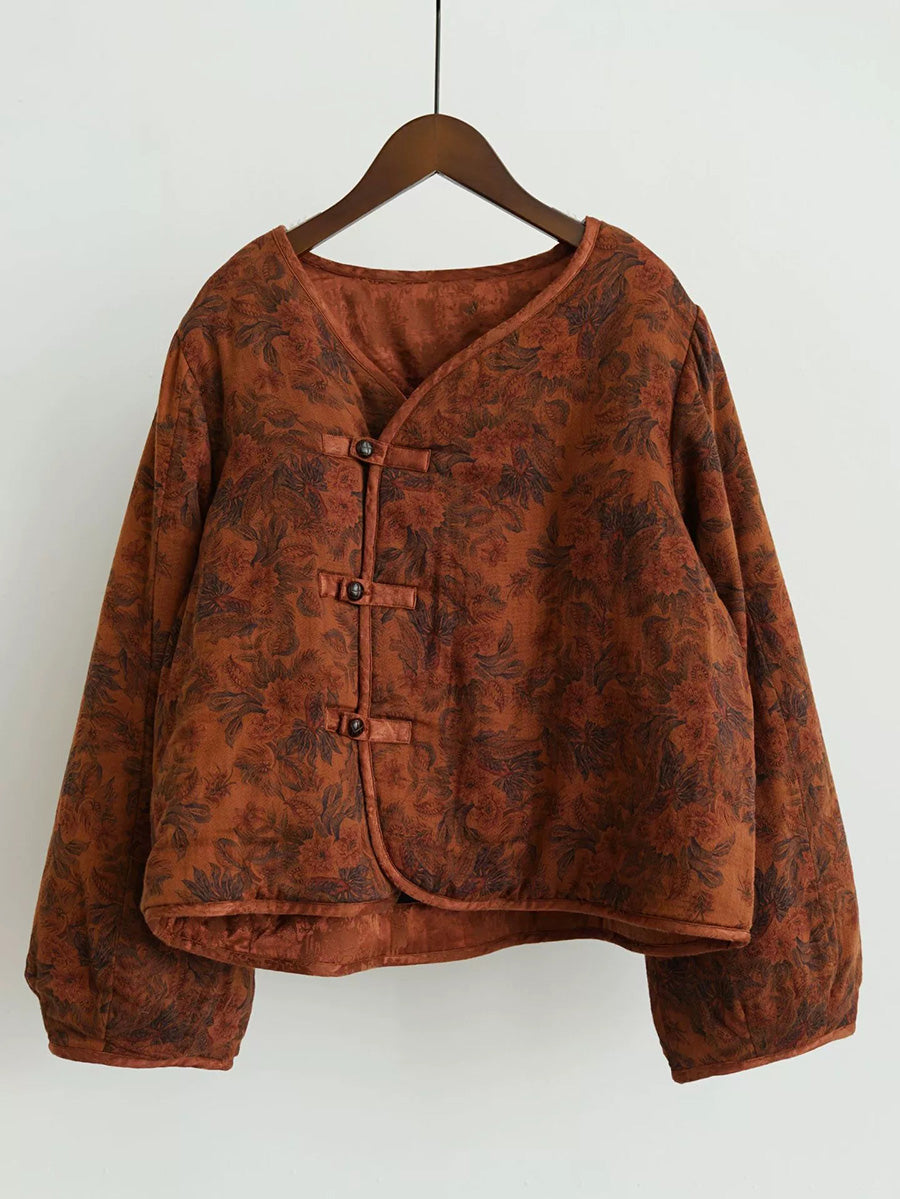 Women Retro Flower 100%Cotton V-Neck Padded Coat