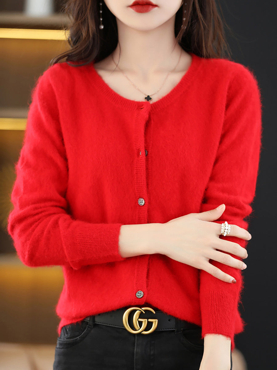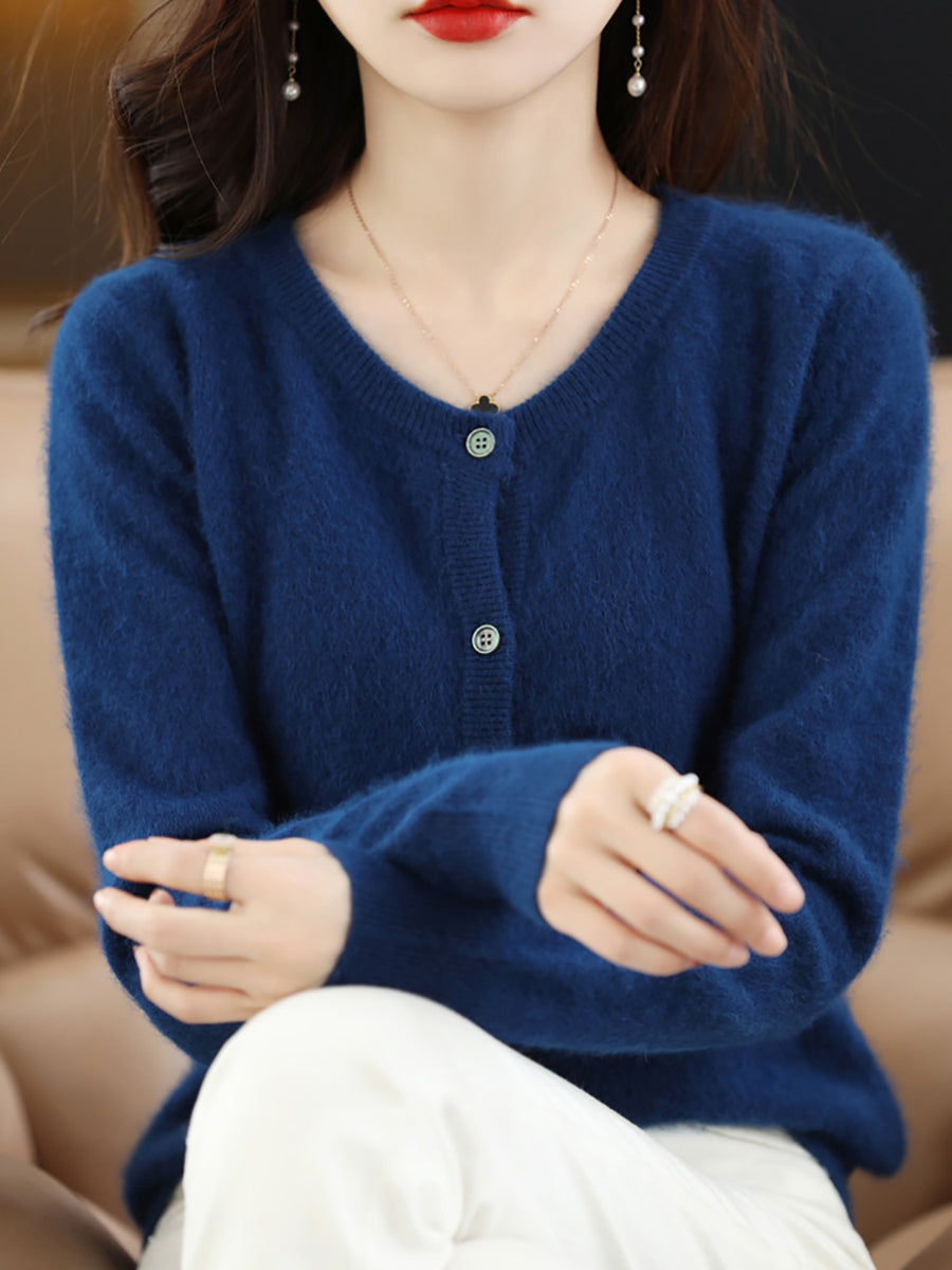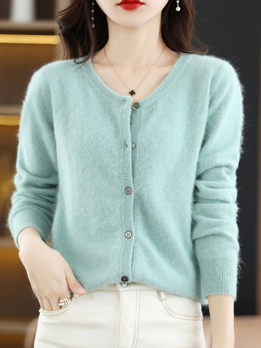 Women Autumn Artsy Pure Color O-Neck Cardigan Sweater