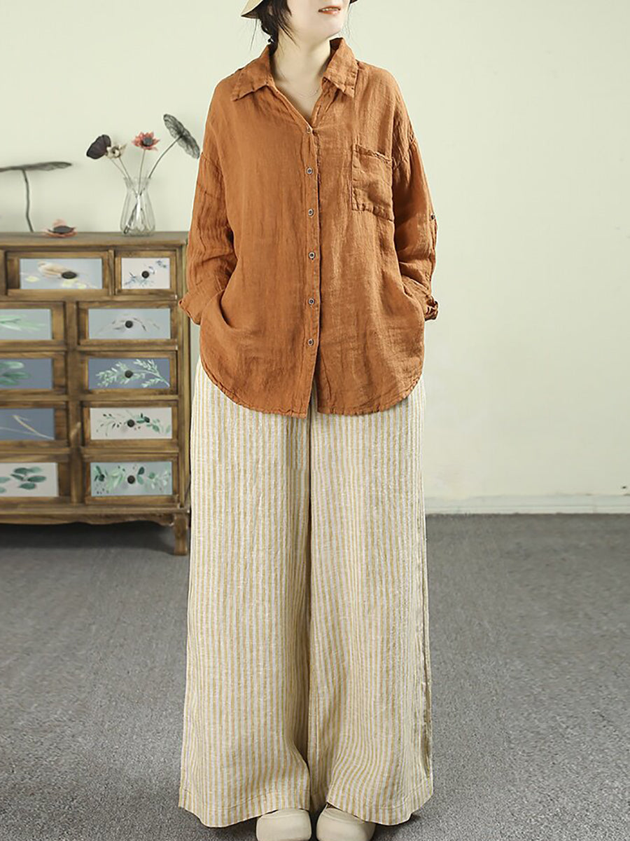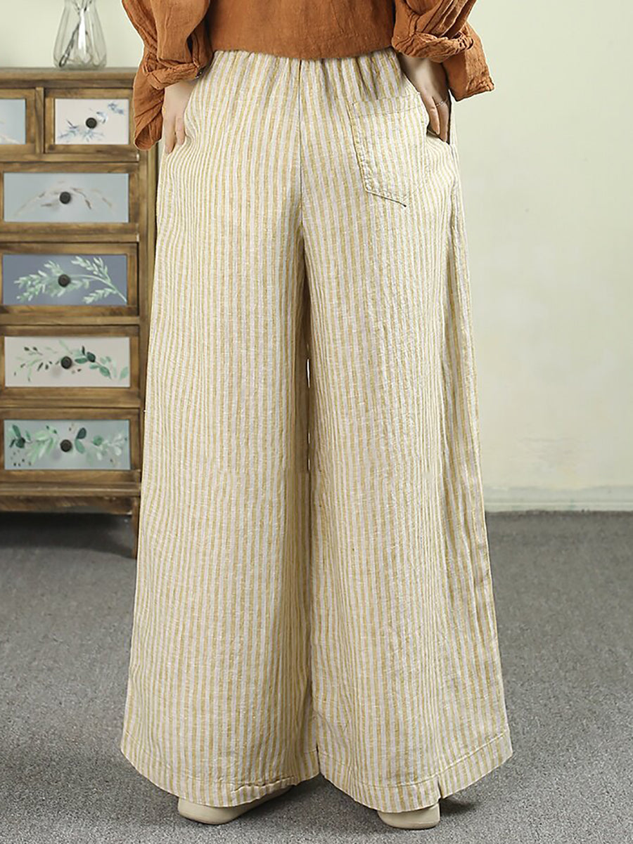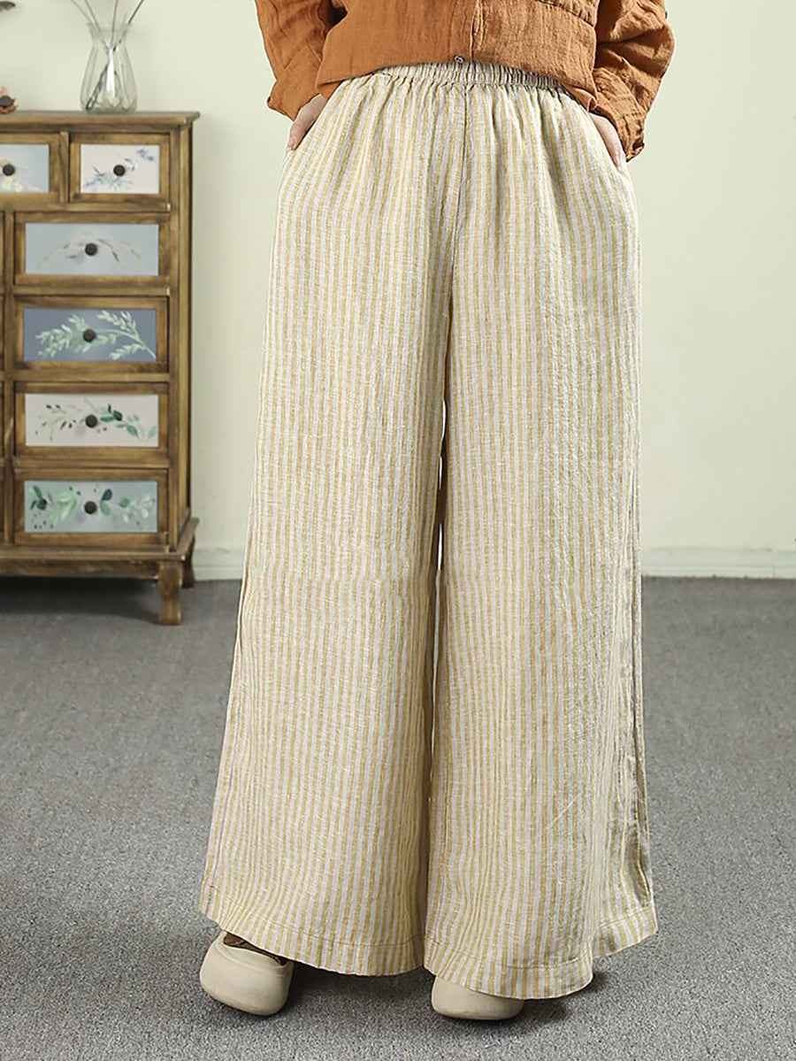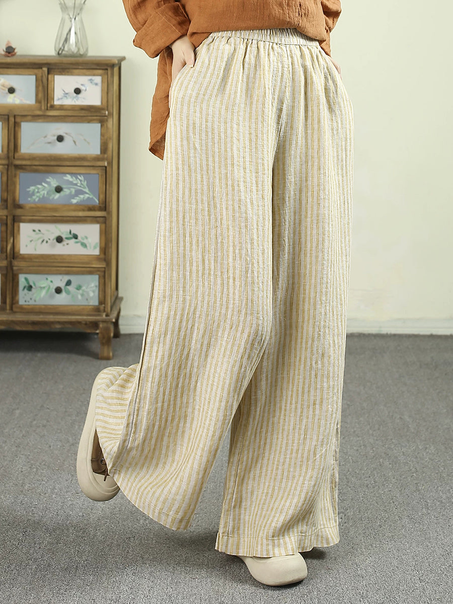 Women Spring Vintage Stripe 100%Linen Wide-leg Pants