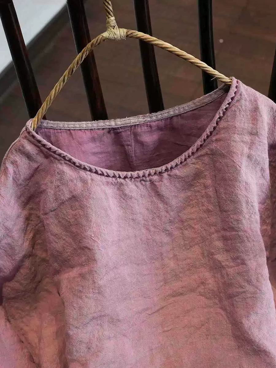 Women Spring Artsy Pure Color O-Neck Linen Blouse