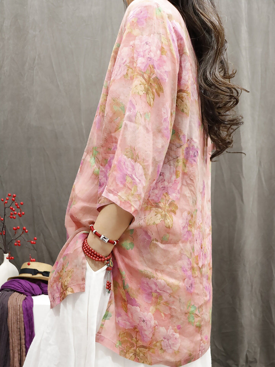 Women Summer Ethnic Flower O-Neck 100%Ramie Shirt