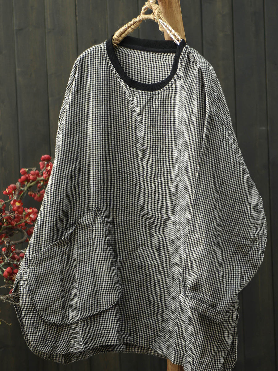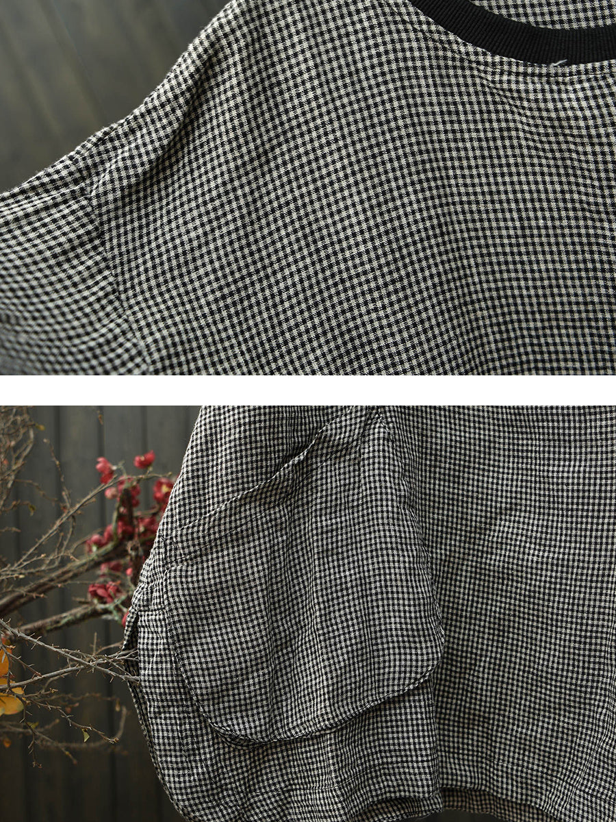 Women Spring Retro Lattice O-Neck Linen Shirt