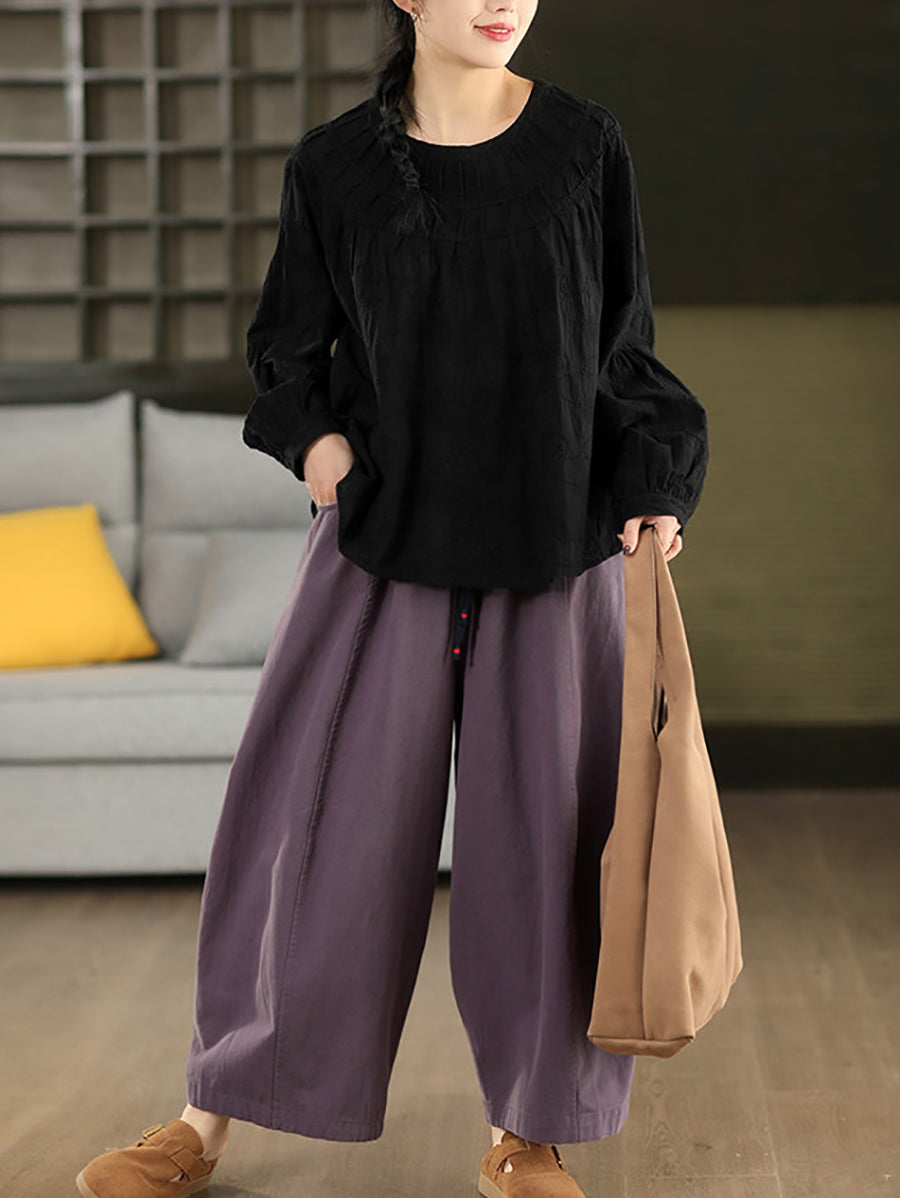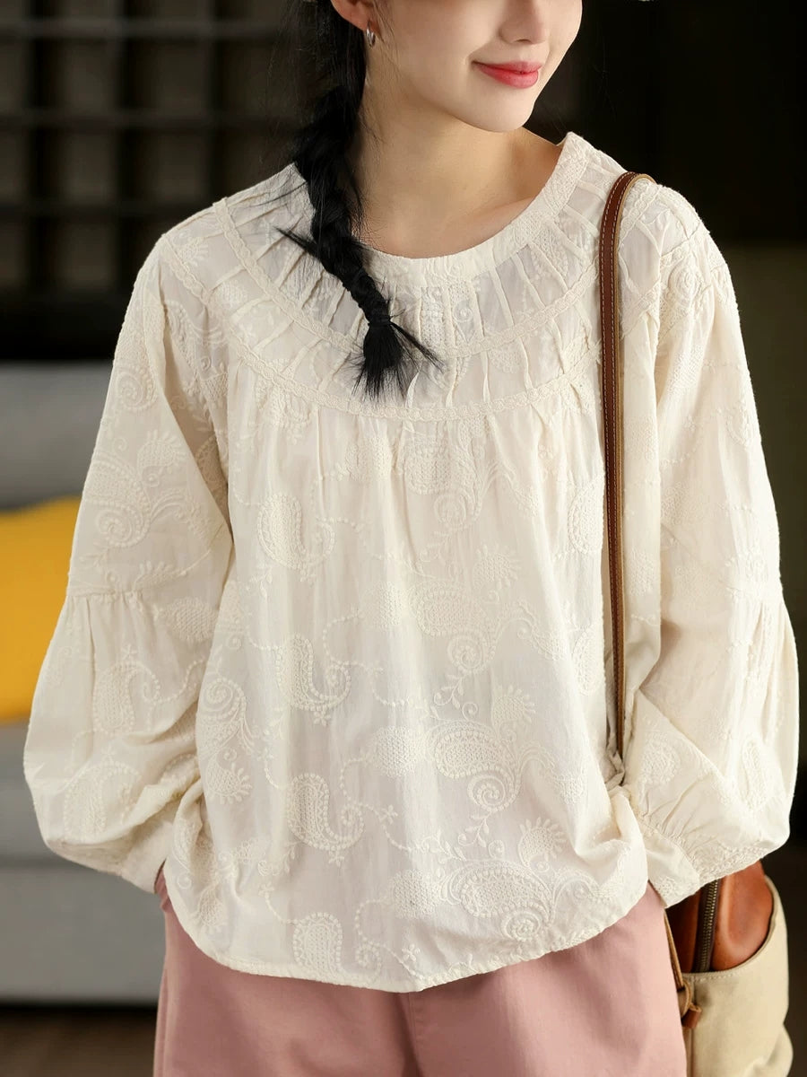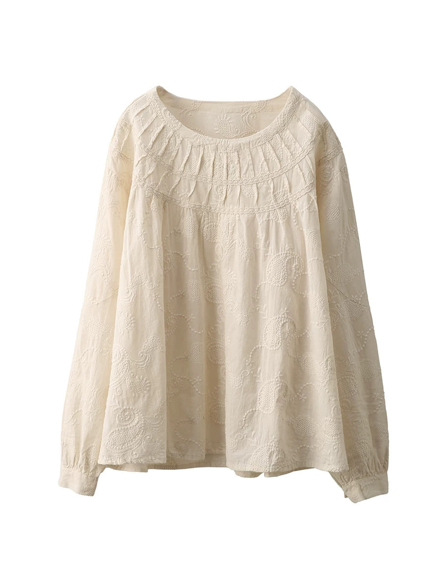 Women Spring Artsy Embroidery 100%Cotton O-Neck Shirt