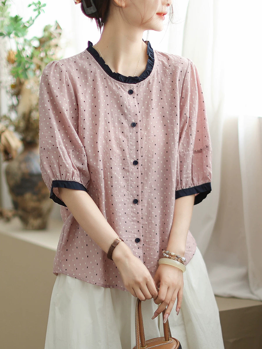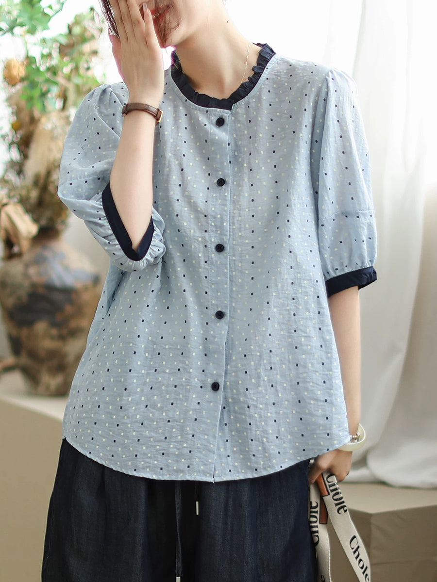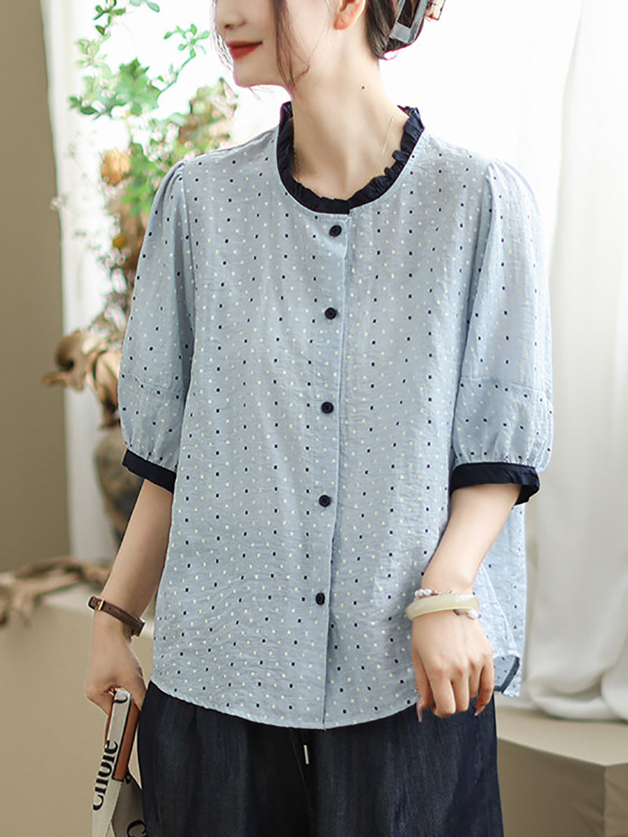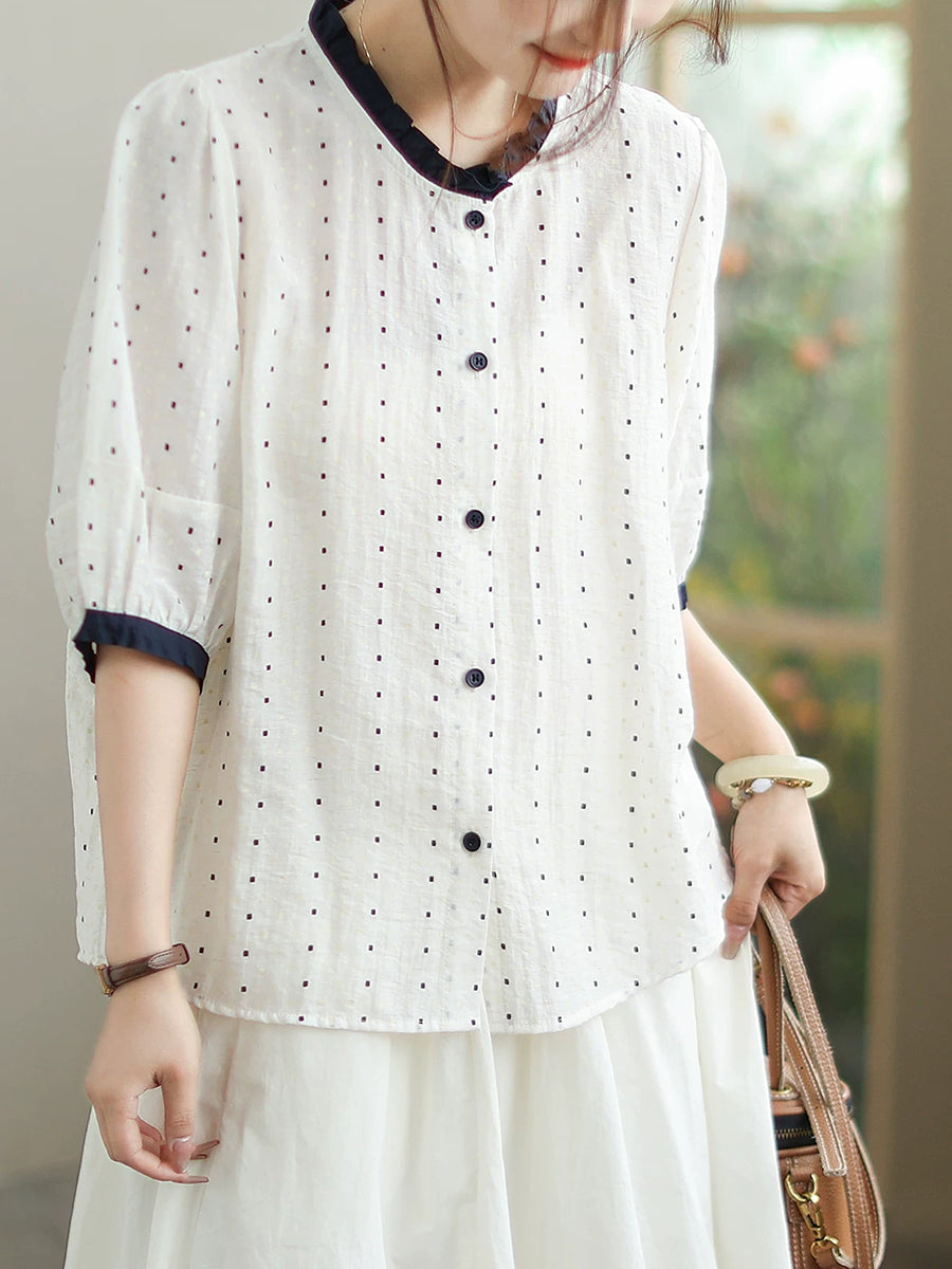 Women Summer Artsy Dot Colorblock Cotton Linen Shirt