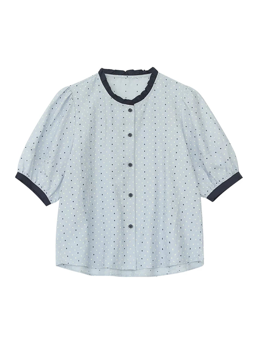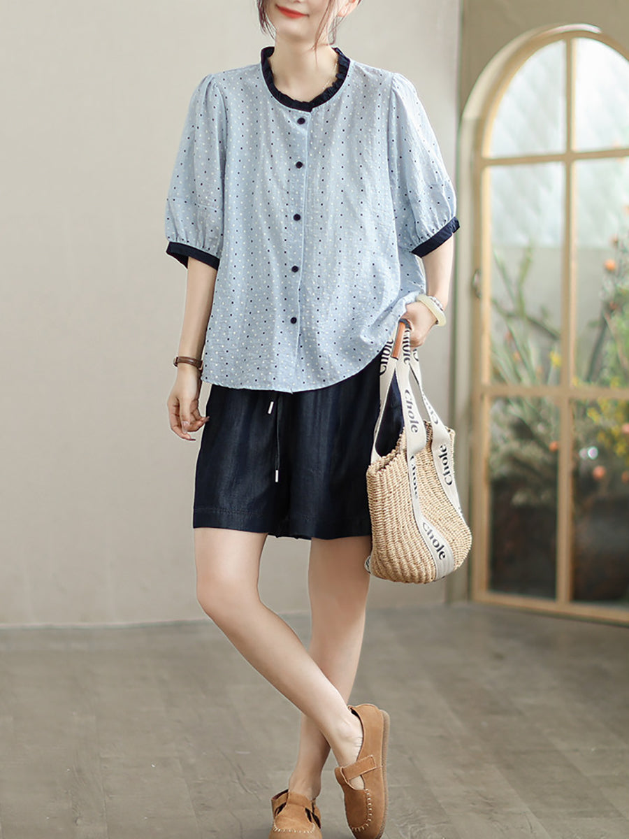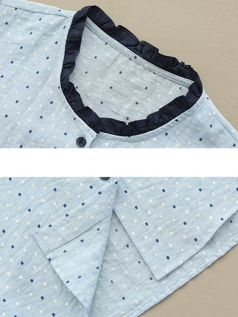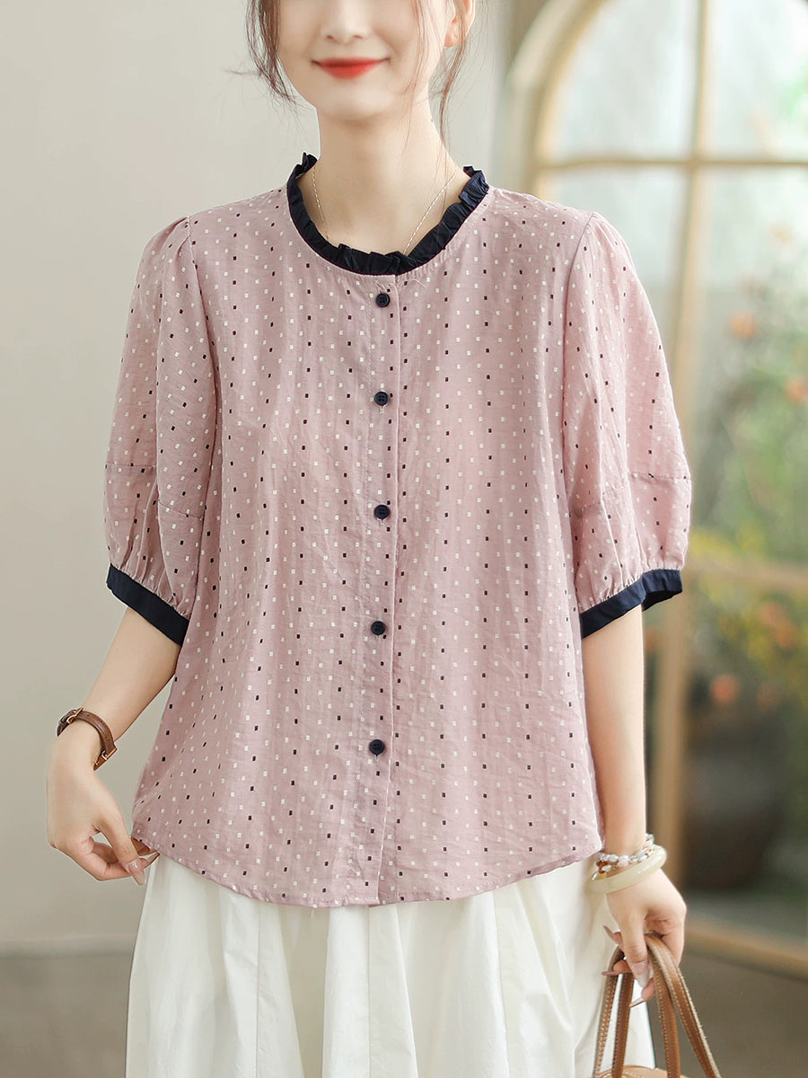 Women Summer Artsy Dot Colorblock Cotton Linen Shirt