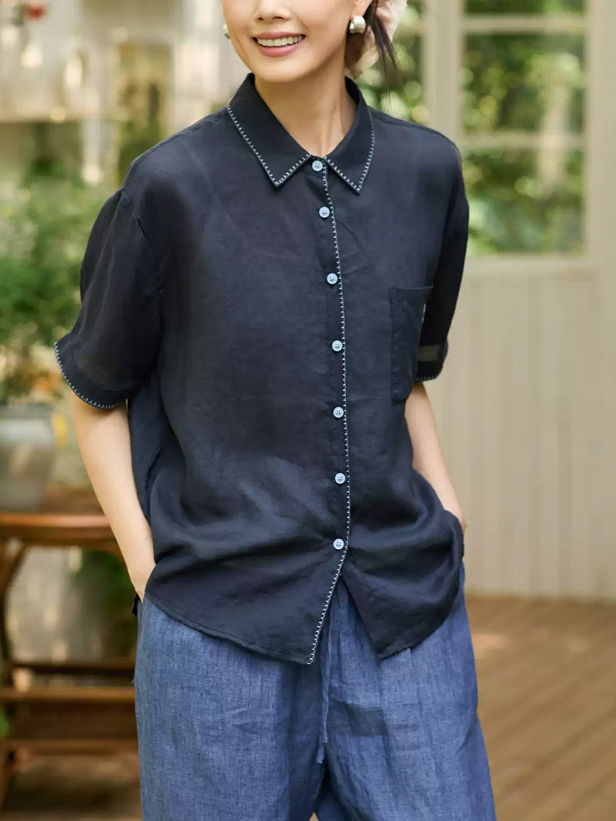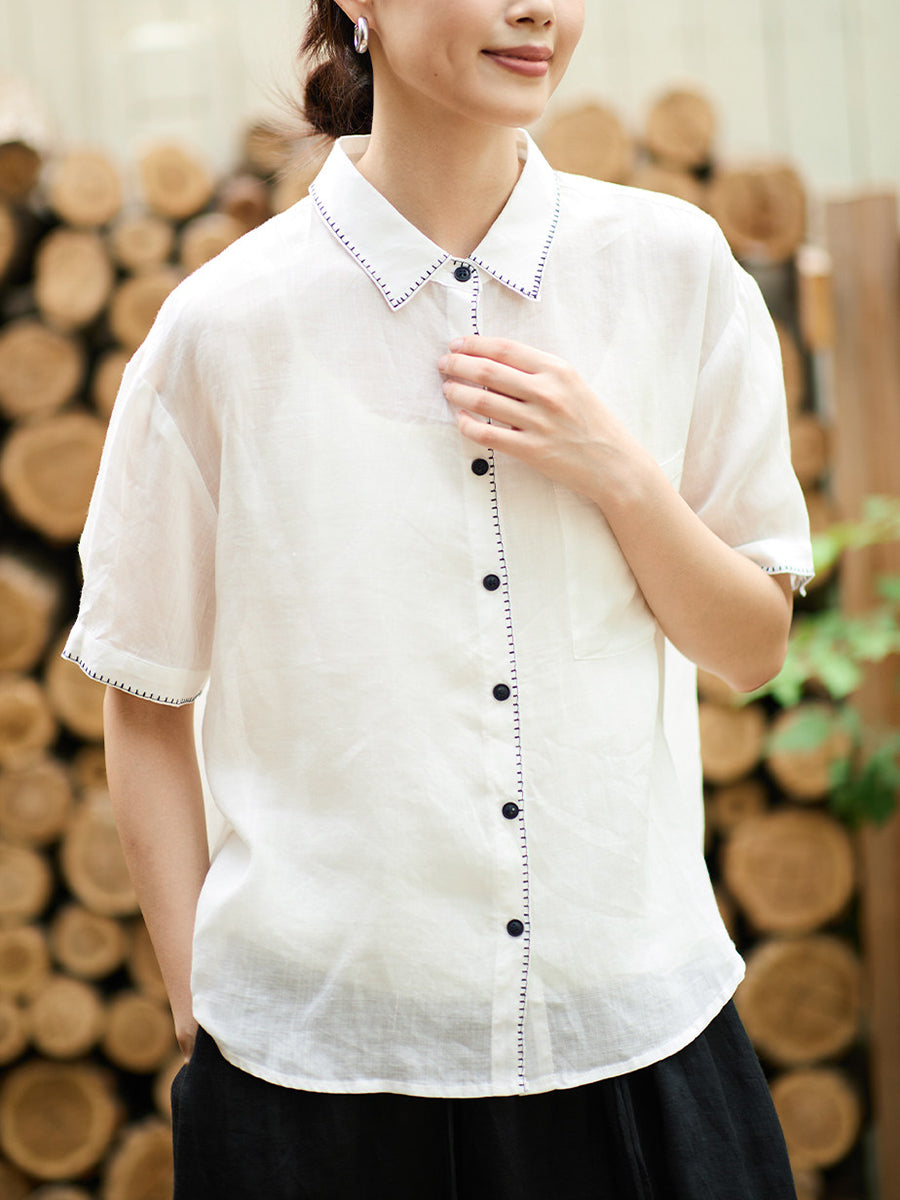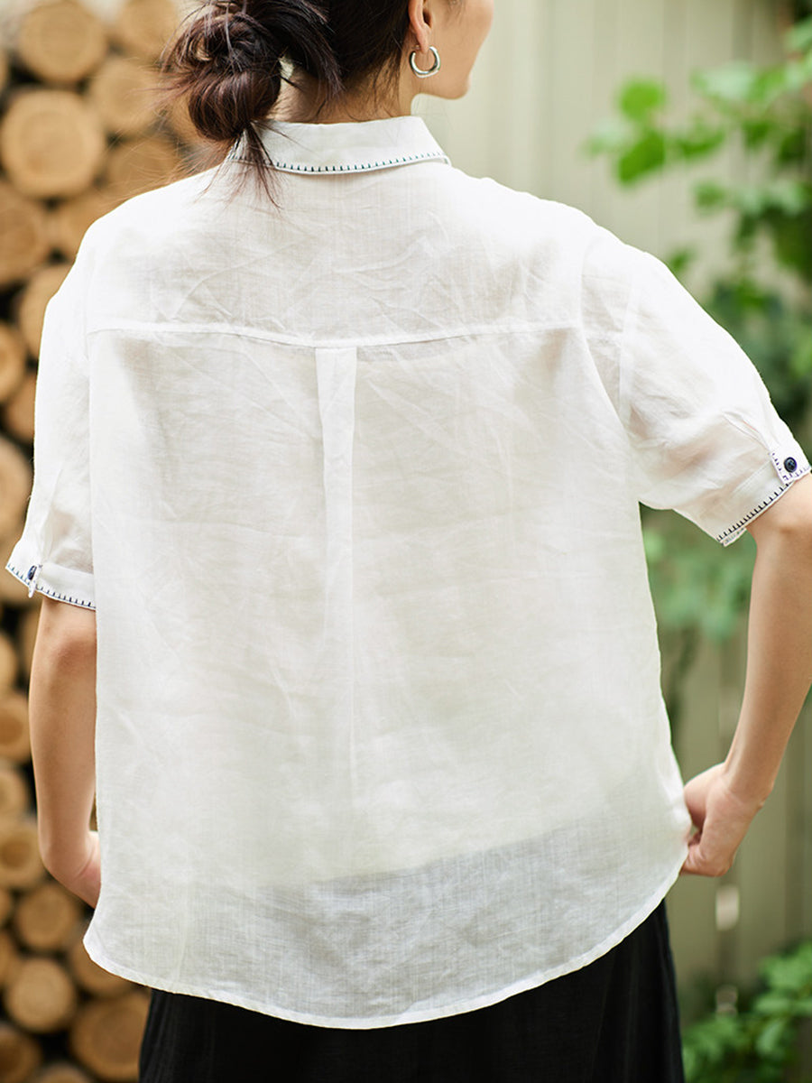 Women Summer Artsy Ramie Turn-down Collar Shirt