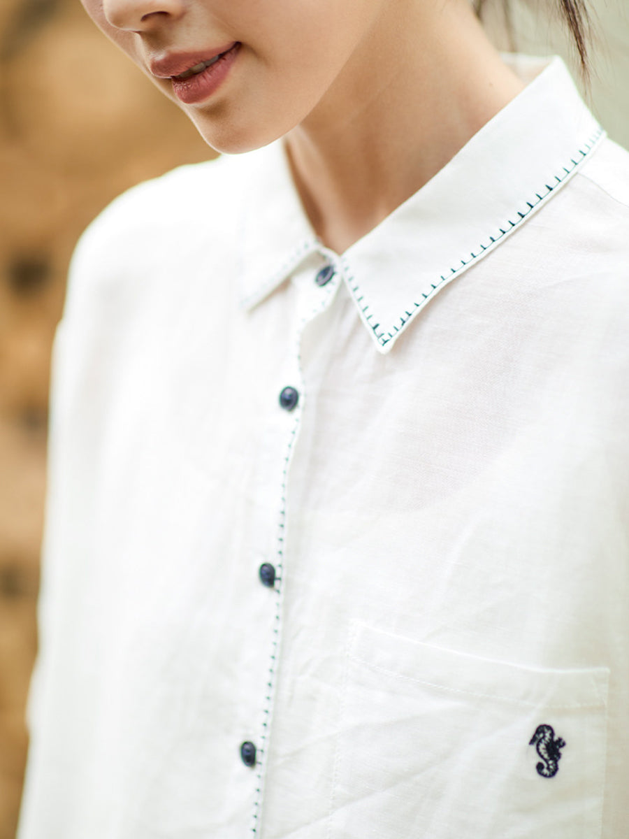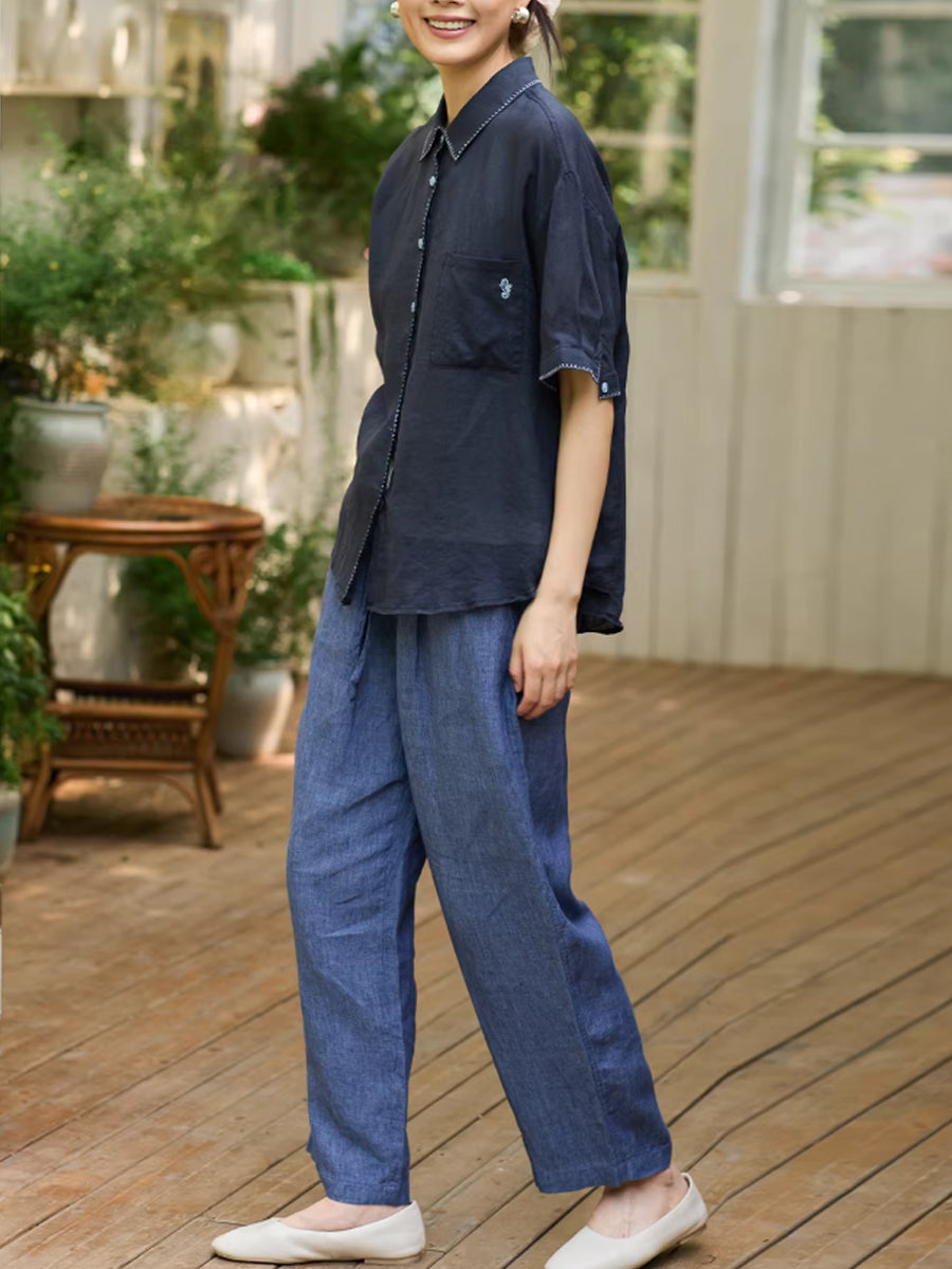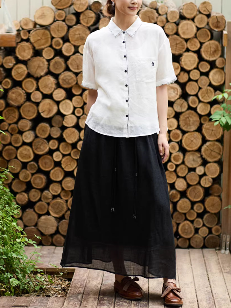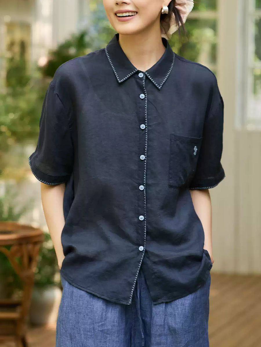 Women Summer Artsy Ramie Turn-down Collar Shirt