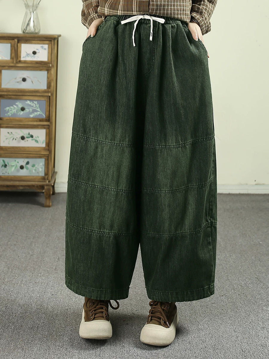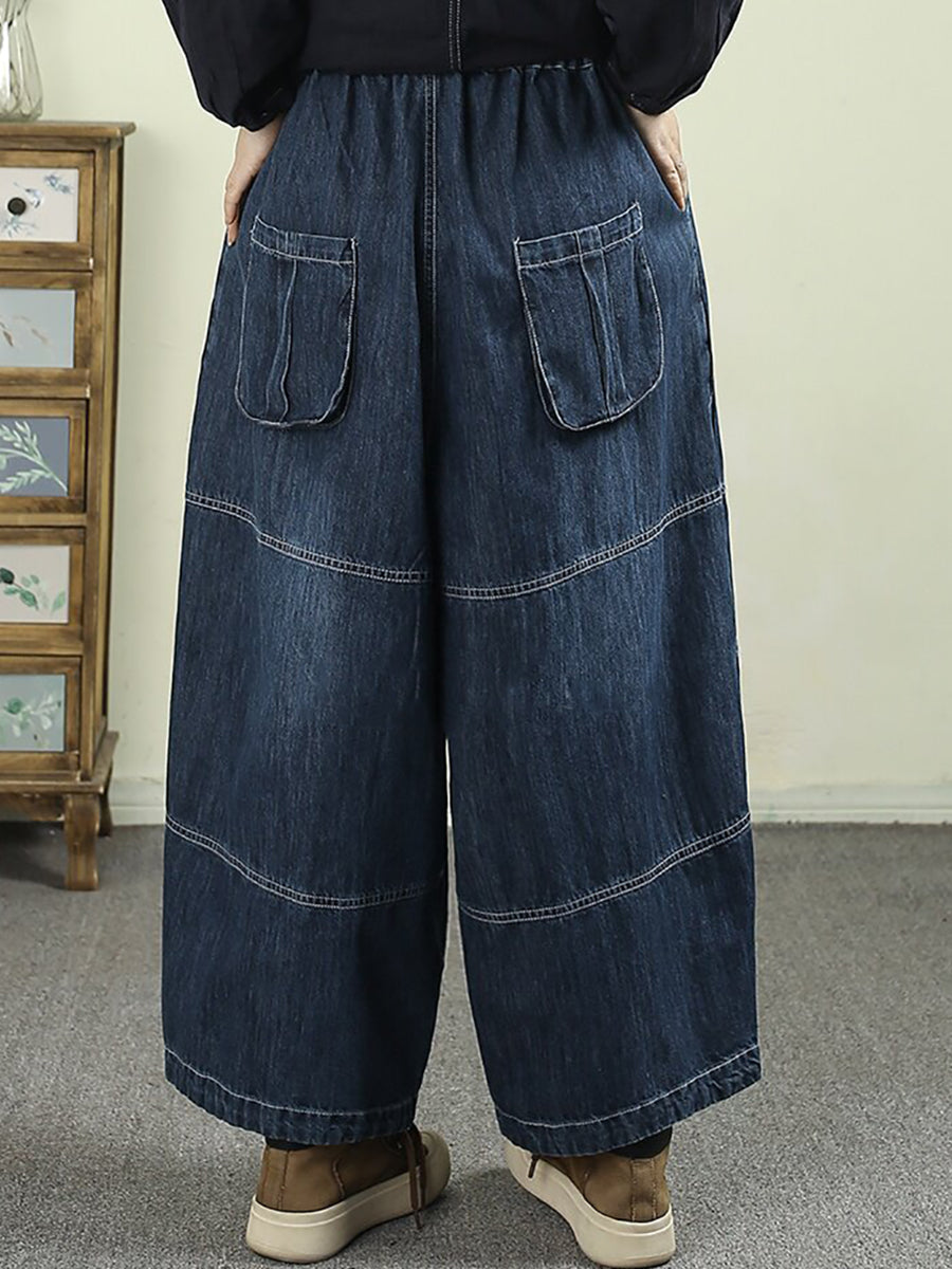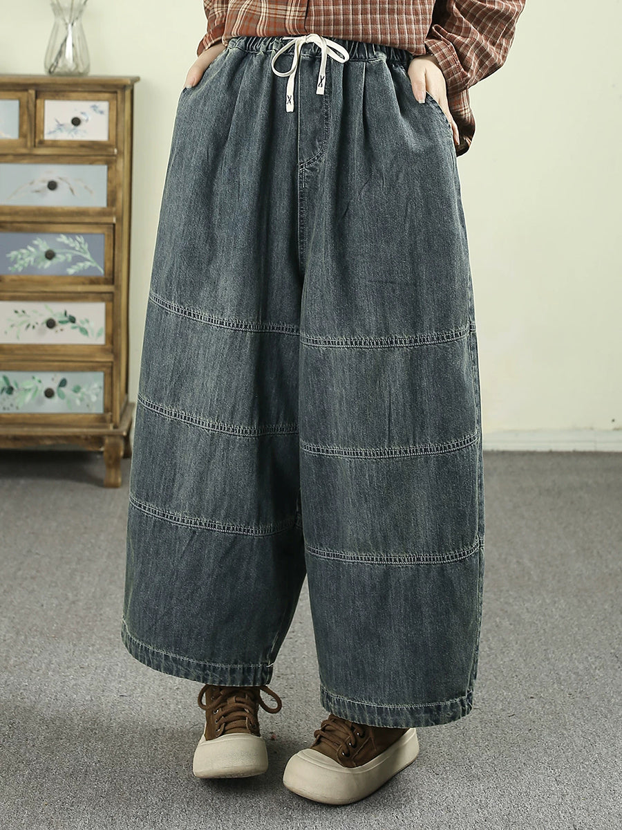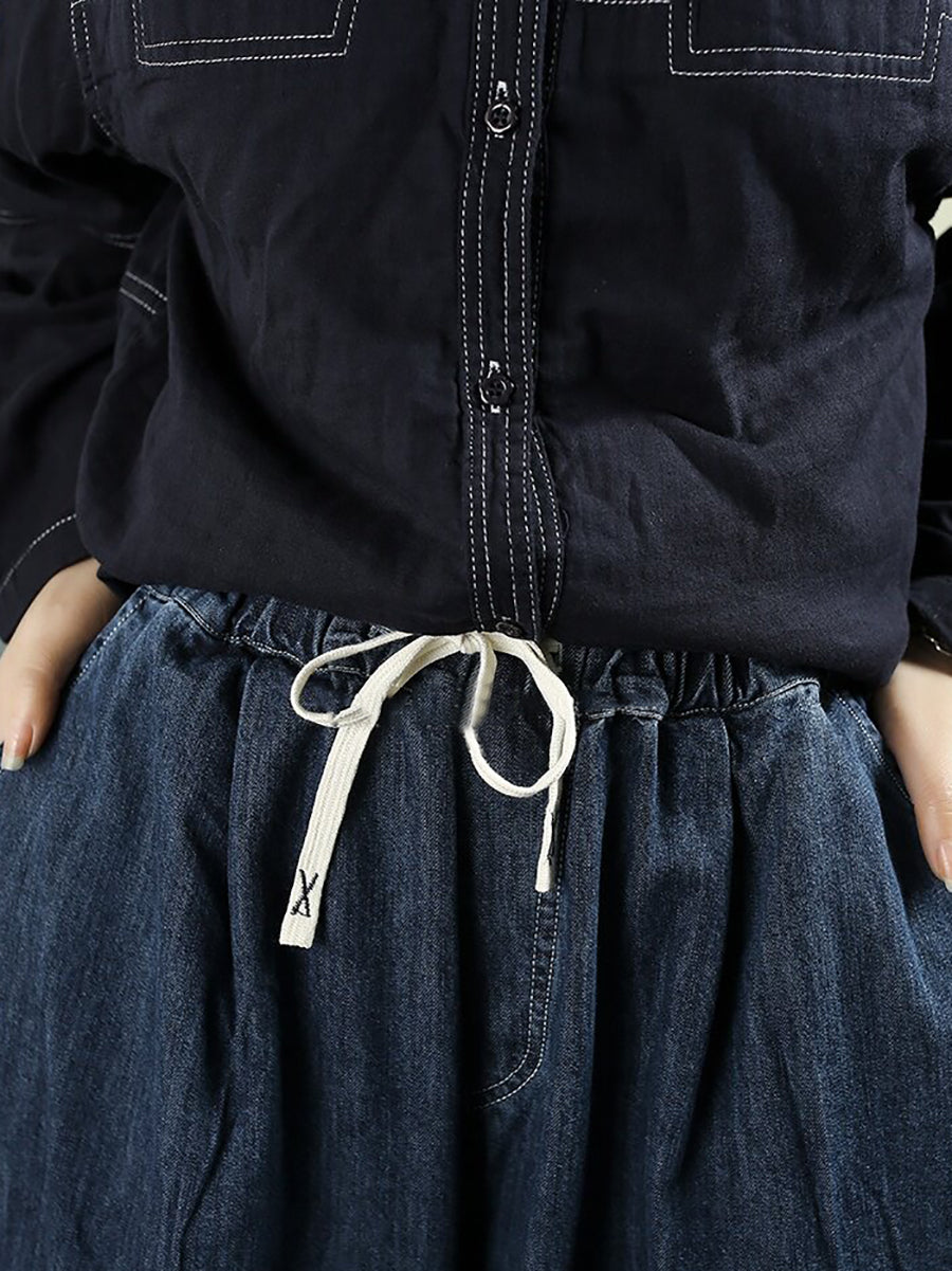 Women Summer Retro Pure Color Denim Wide-leg Pants
