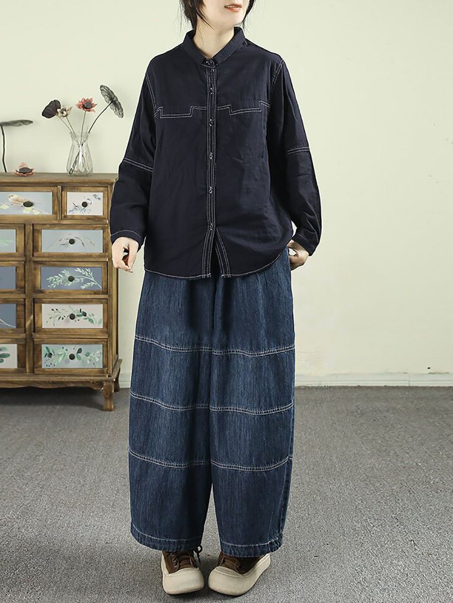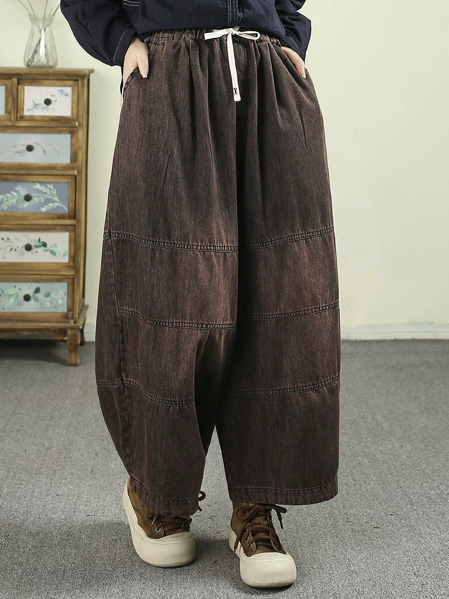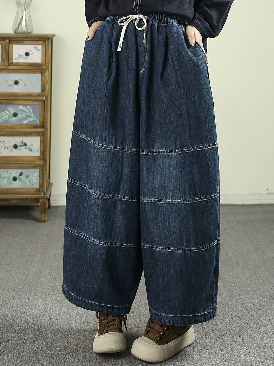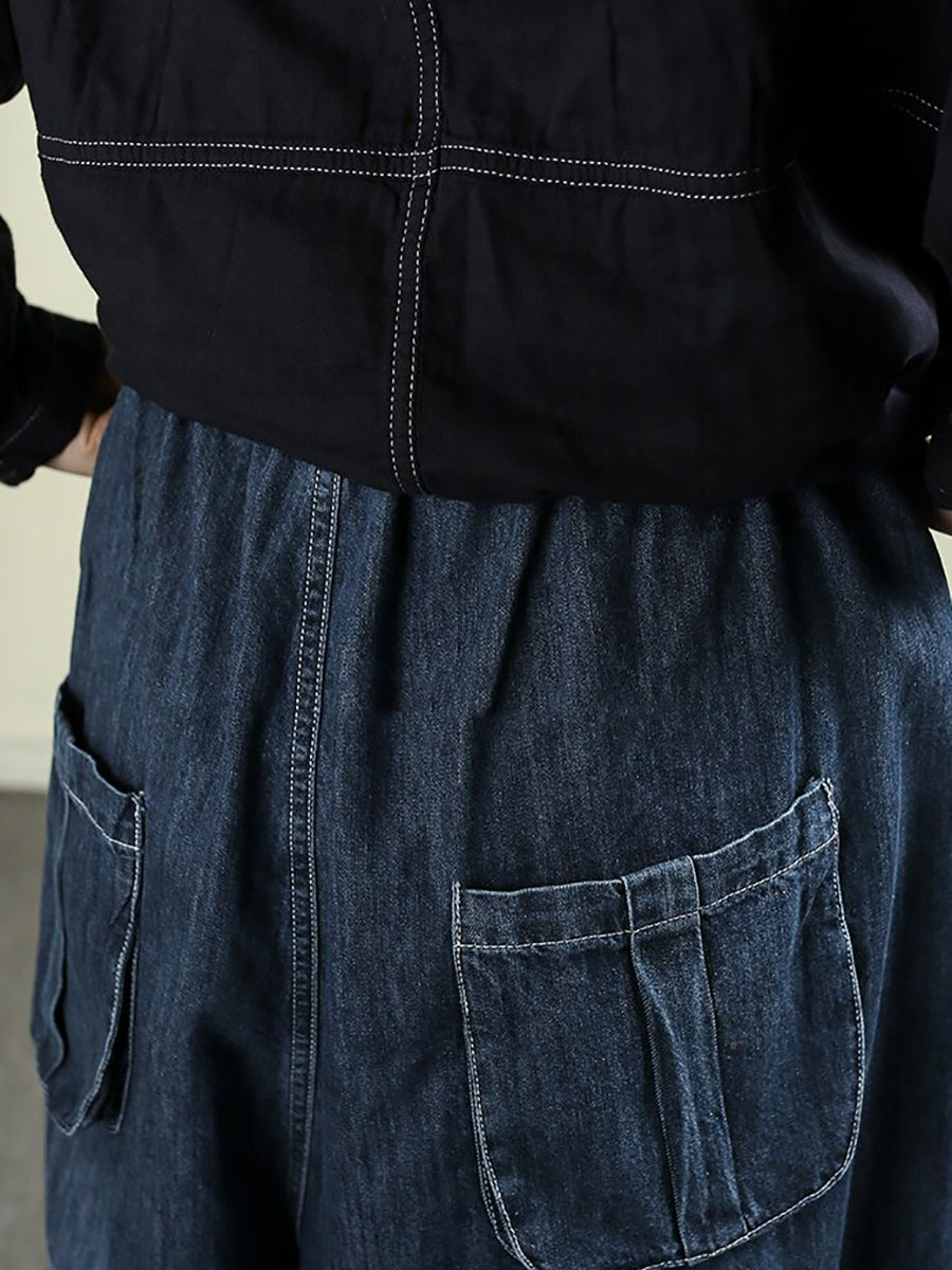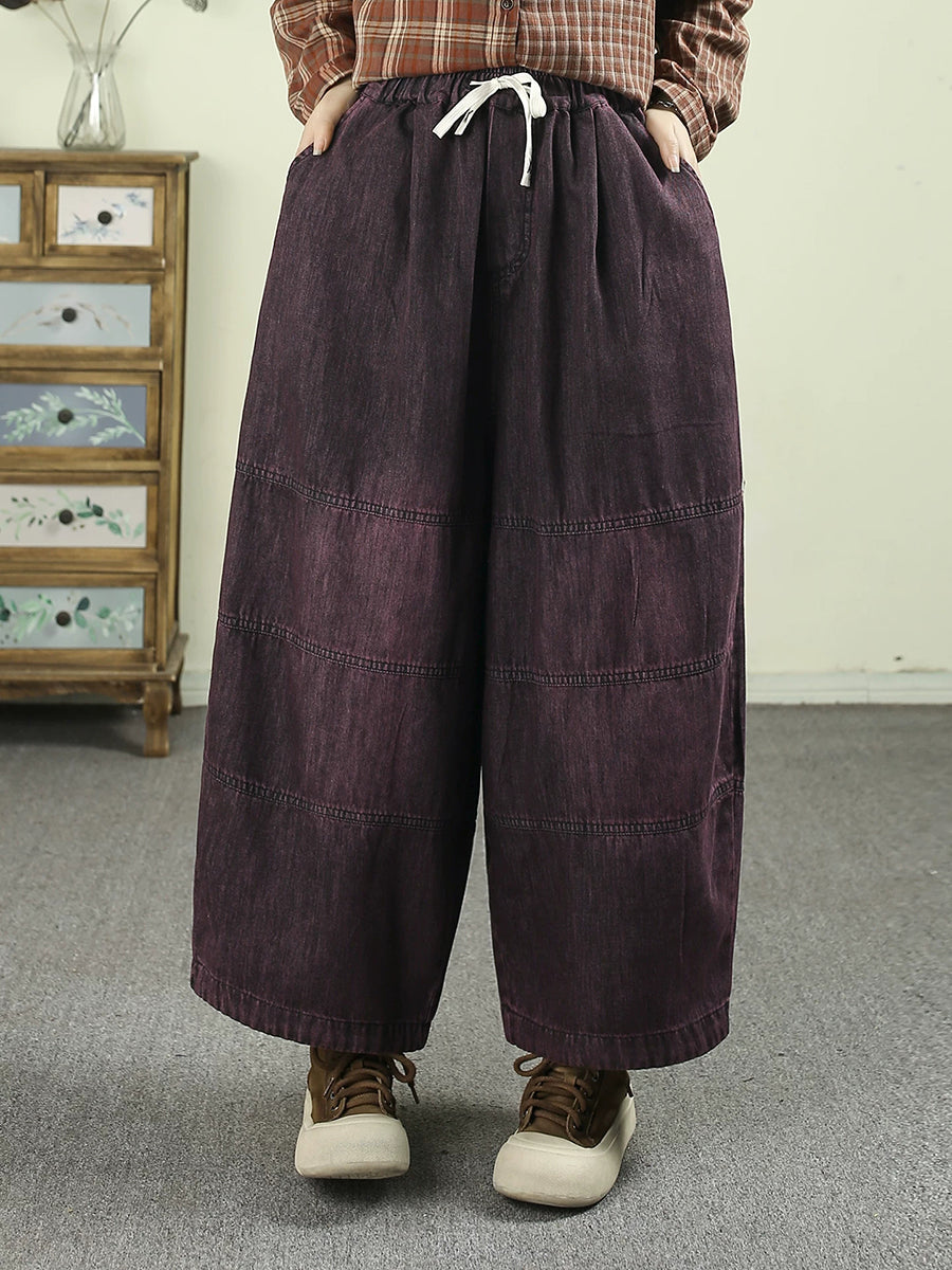 Women Summer Retro Pure Color Denim Wide-leg Pants