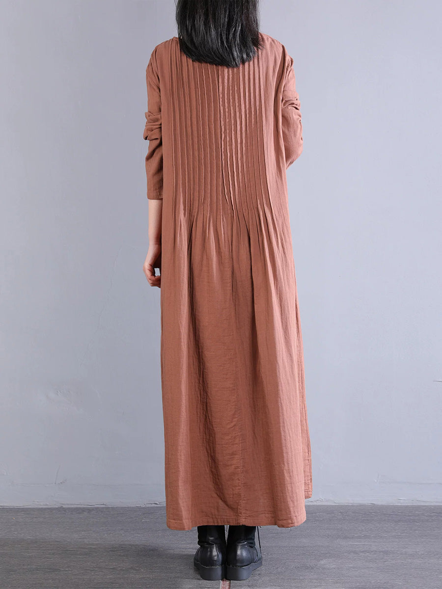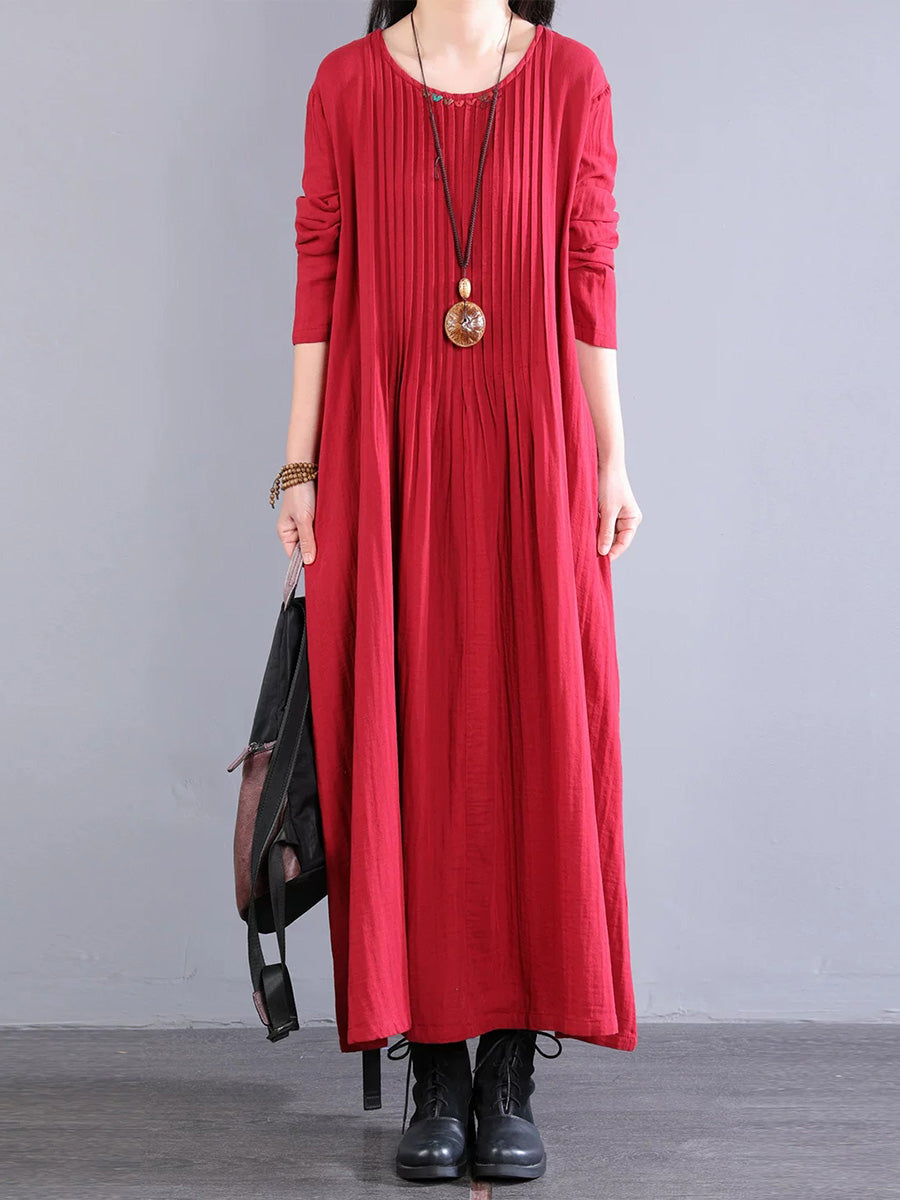 Women Artsy Pure Color Shirred 100%Cotton O-Neck Dress
