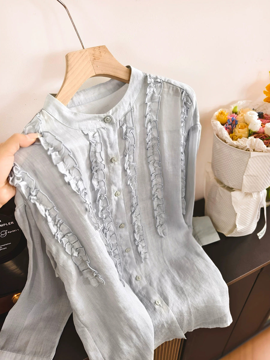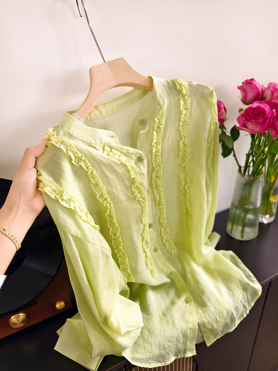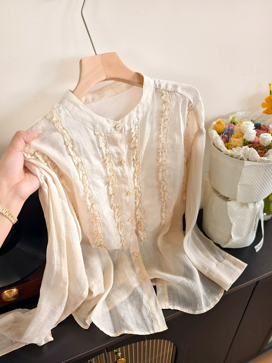 Women Spring Artsy Stand Collar 100%Ramie Shirt