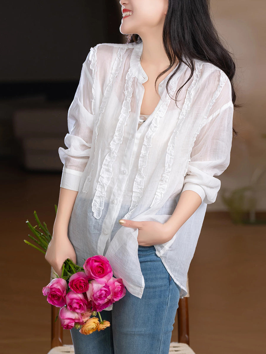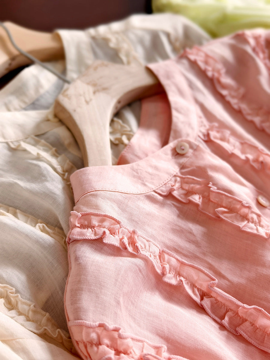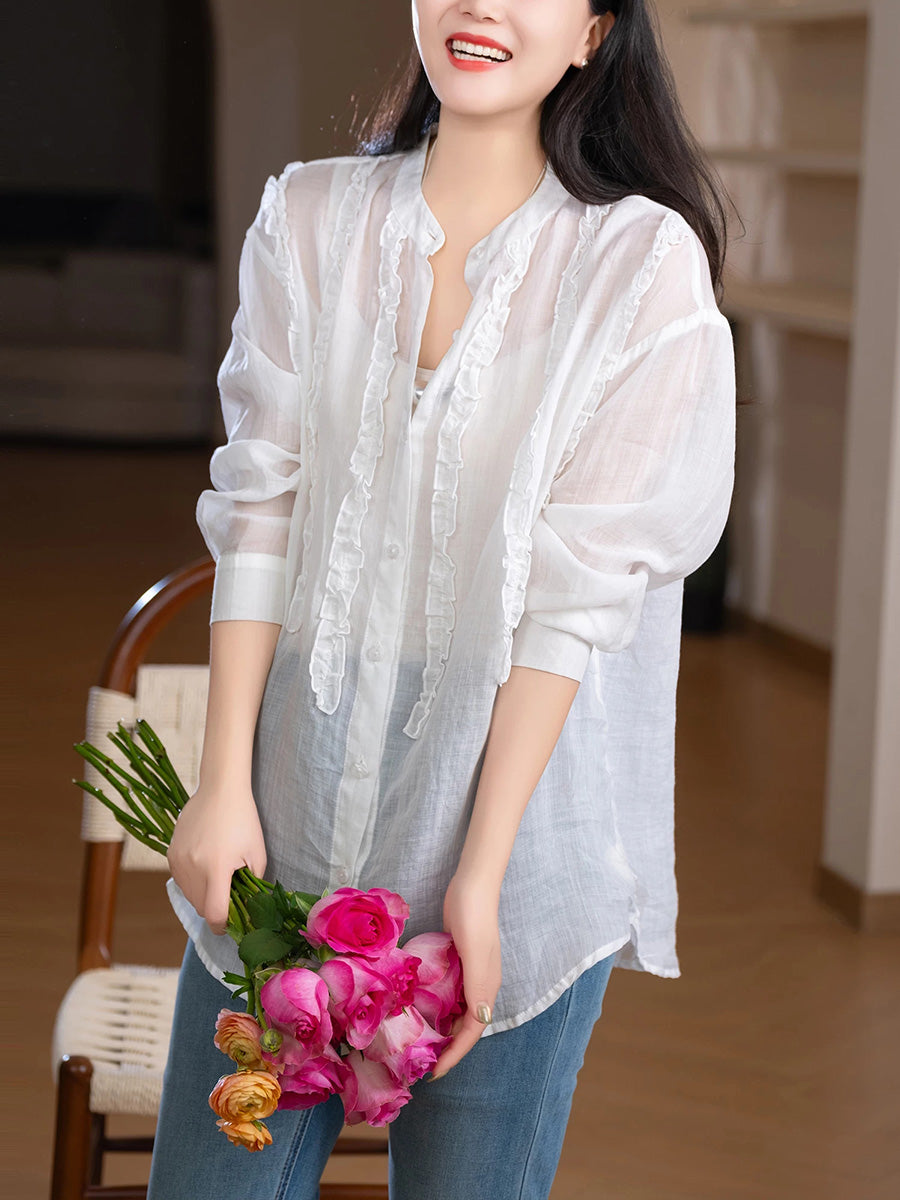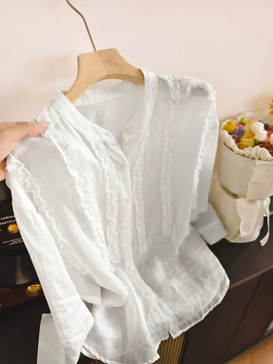 Women Spring Artsy Stand Collar 100%Ramie Shirt