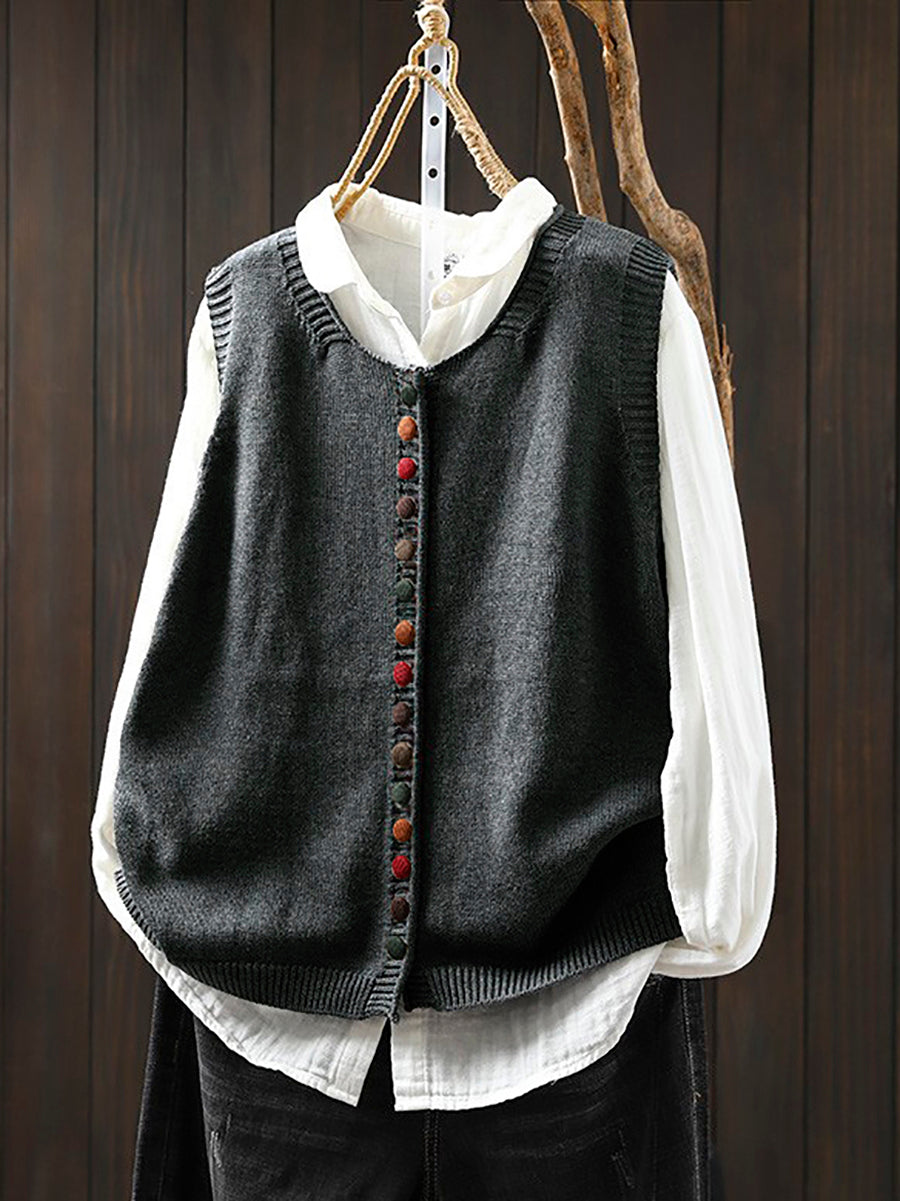 Women Casual Autumn Wool O-Neck Colorful Button Knit Vest
