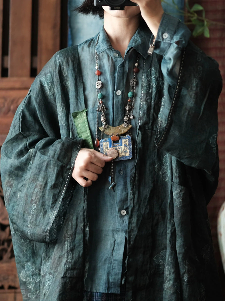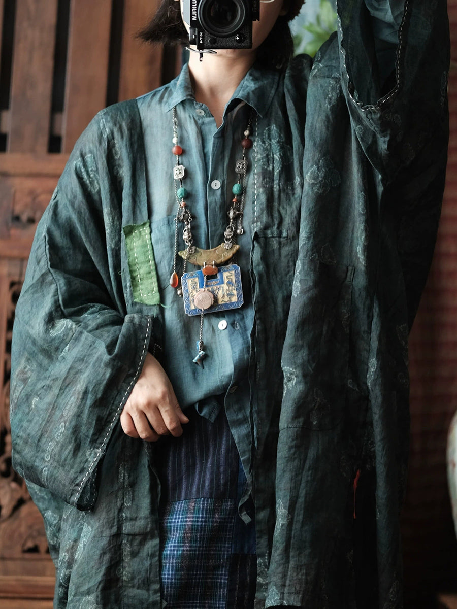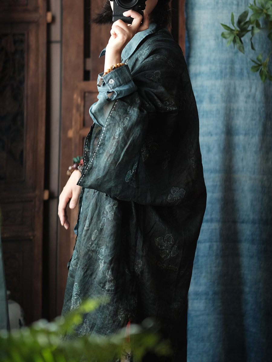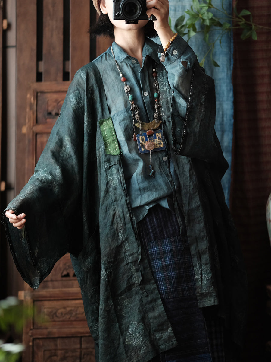 Women Spring Vintage Flower V-Neck Ramie Coat