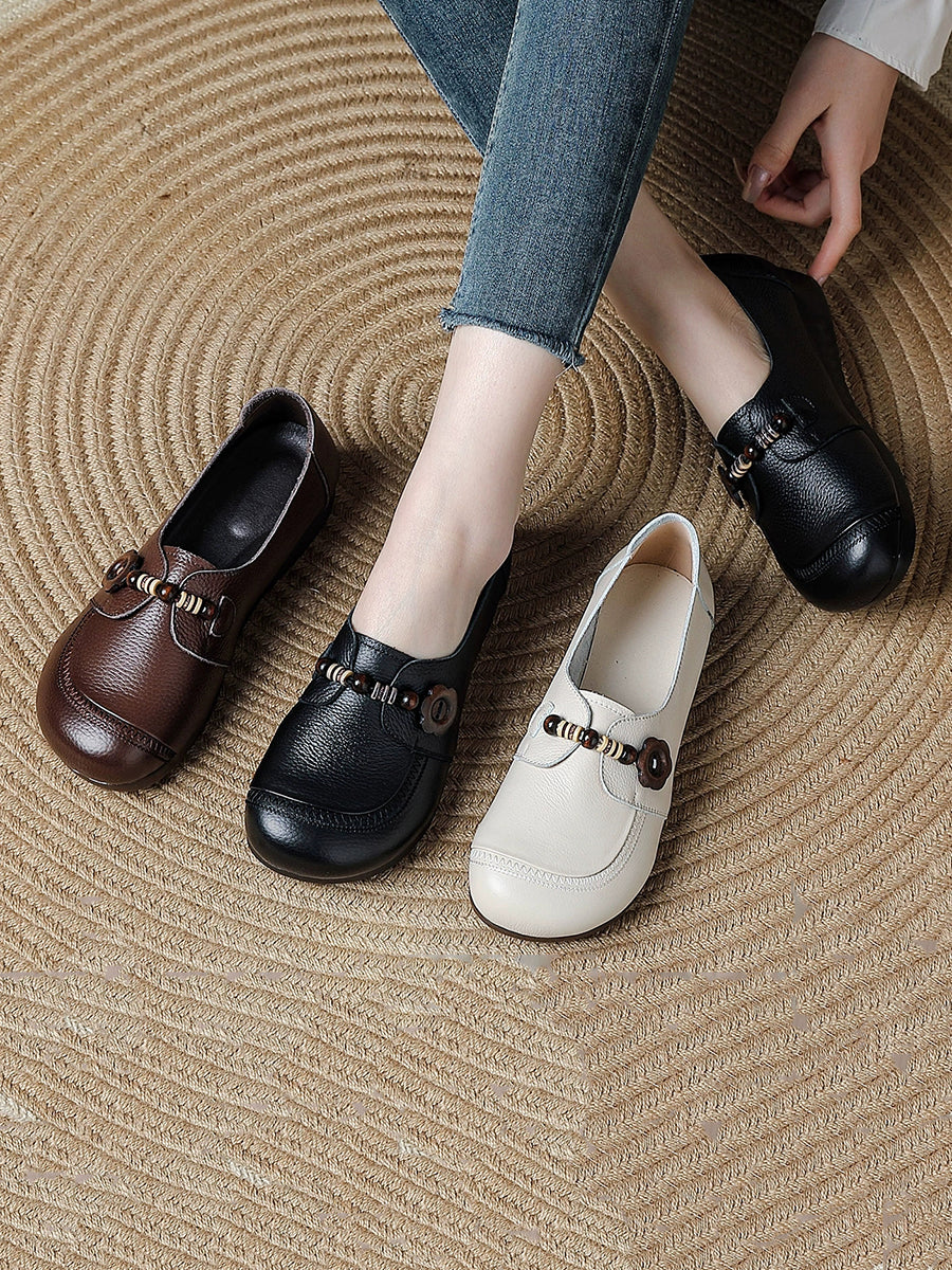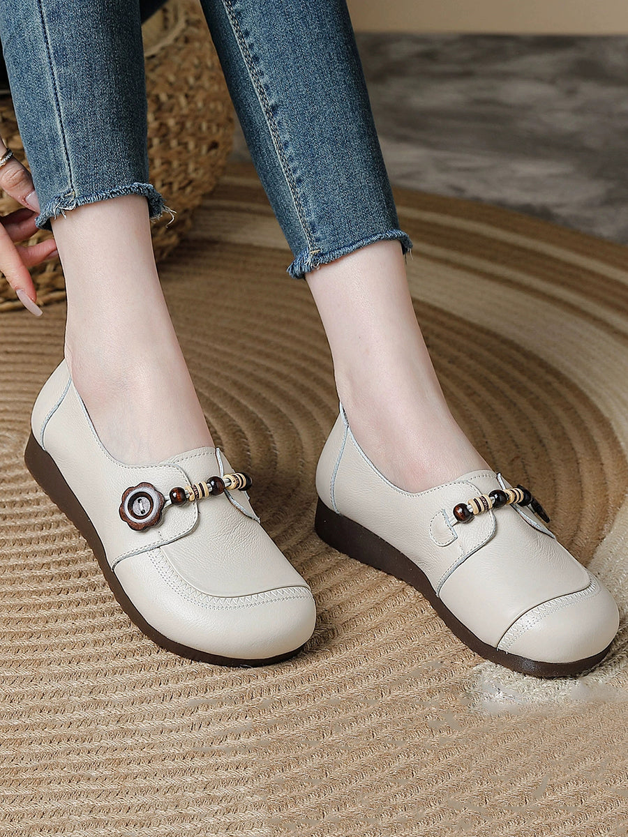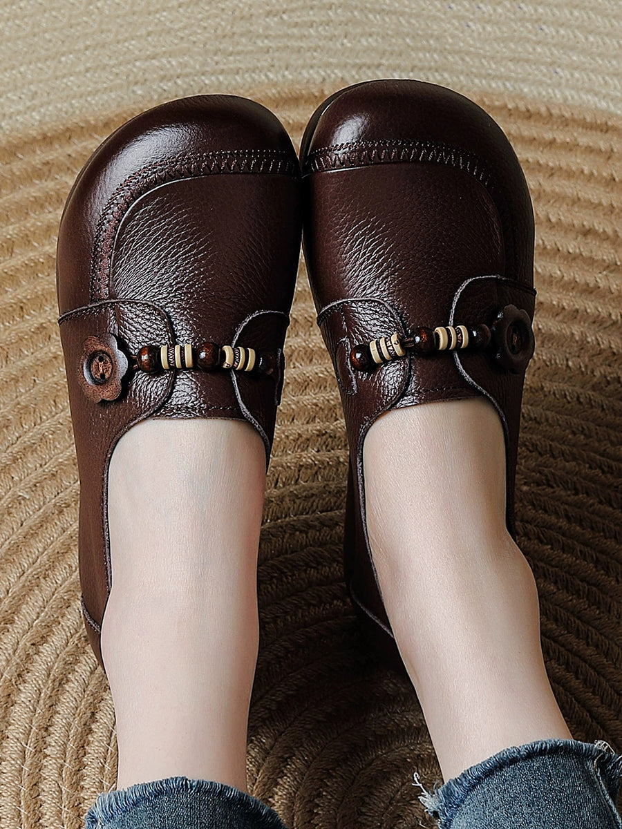 Women Vintage Genuine Leather Wooden Beads Shoes