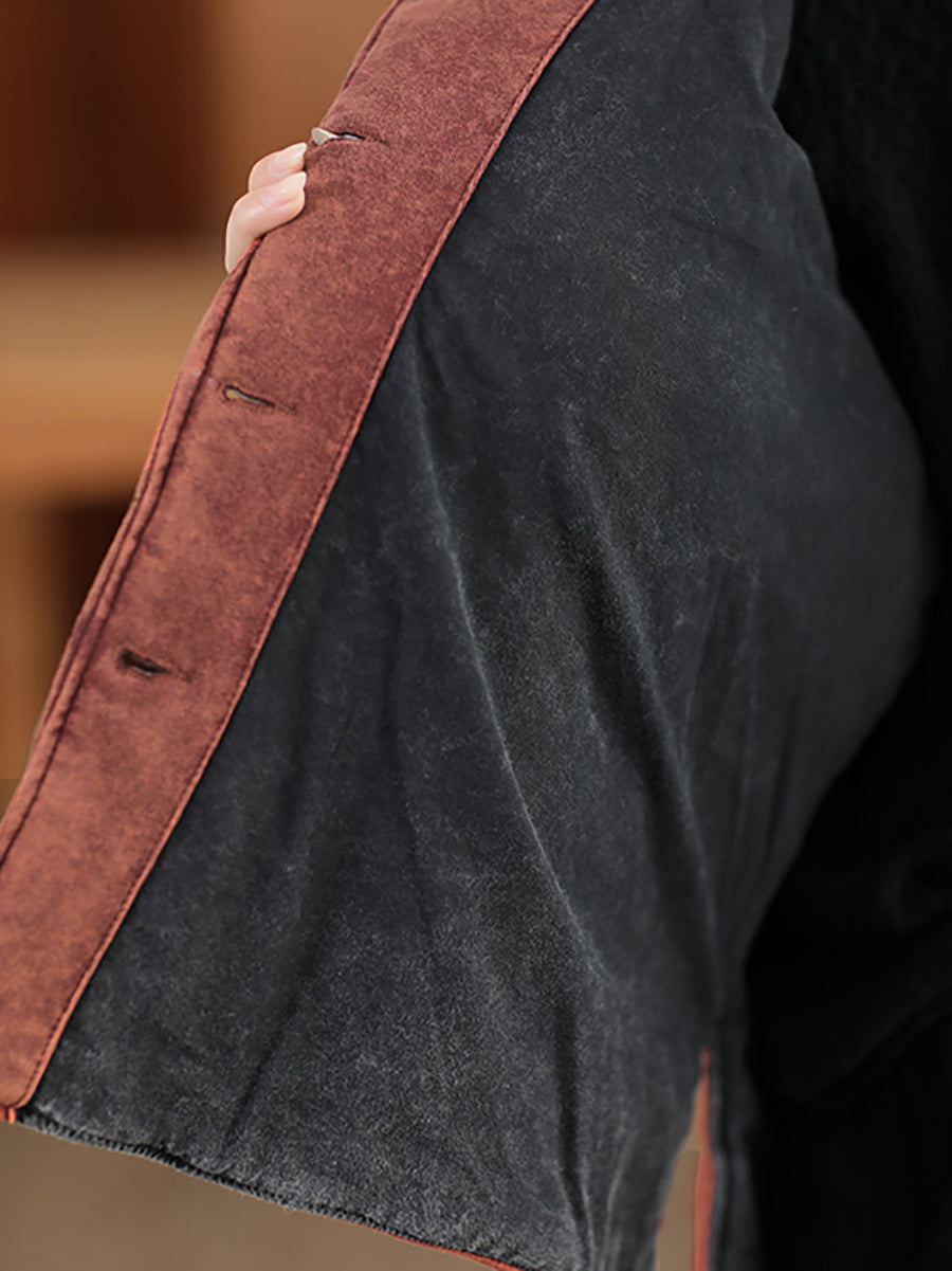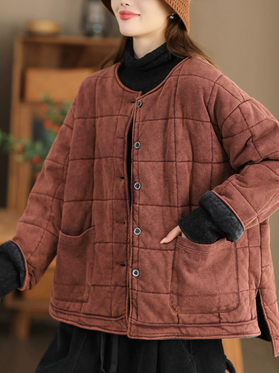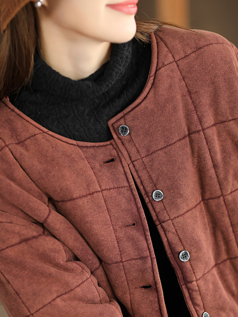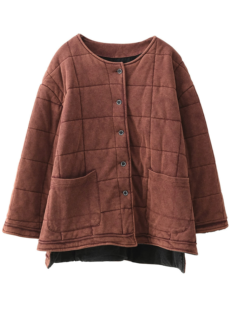 Plus Size Women Autumn Retro Pure Color O-Neck Padded Jacket