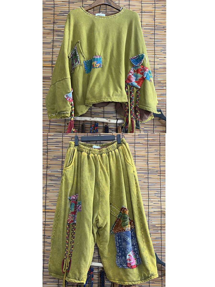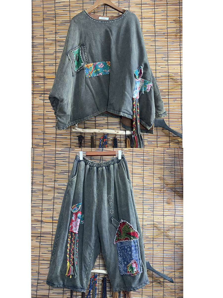 Women Winter Retro Patchwork O-Neck Tassel Suits