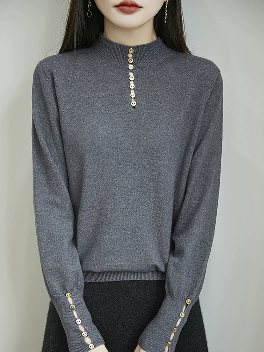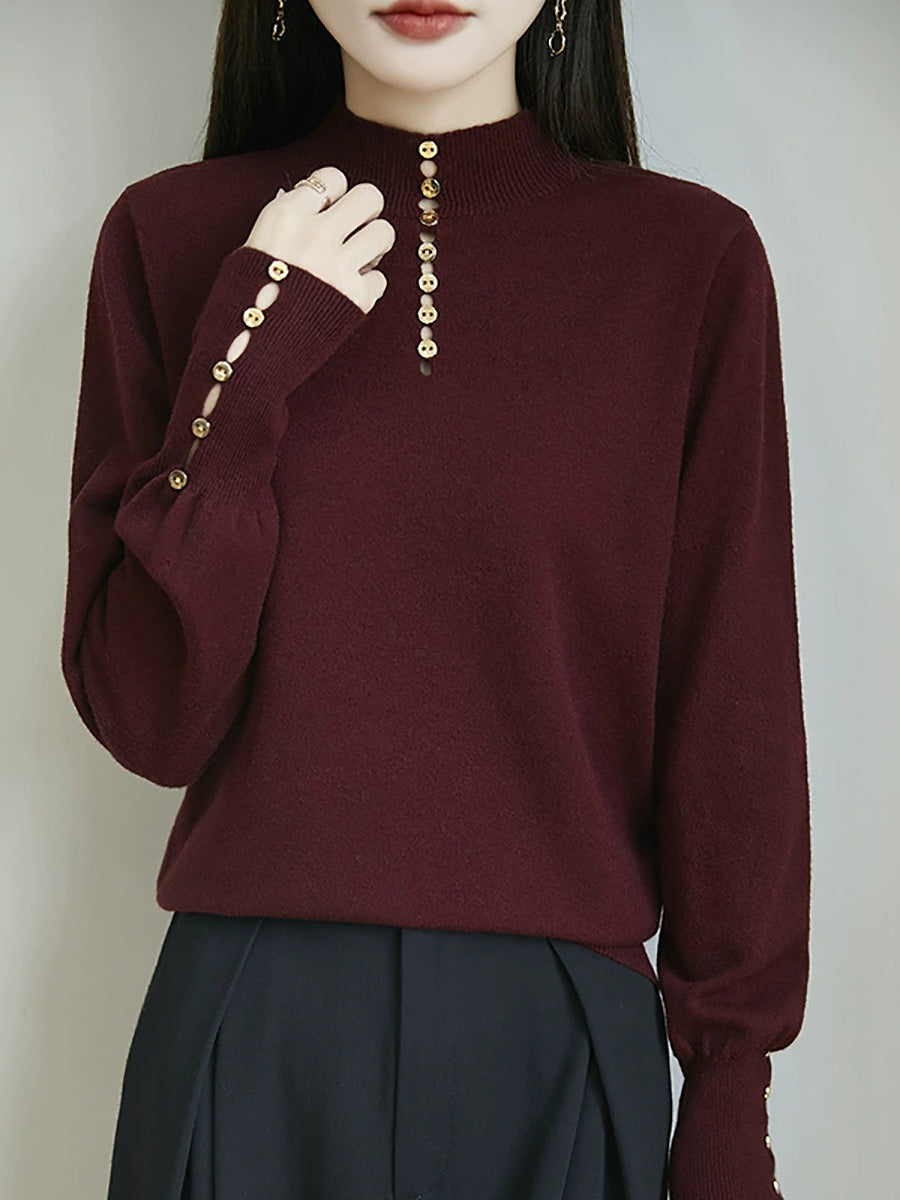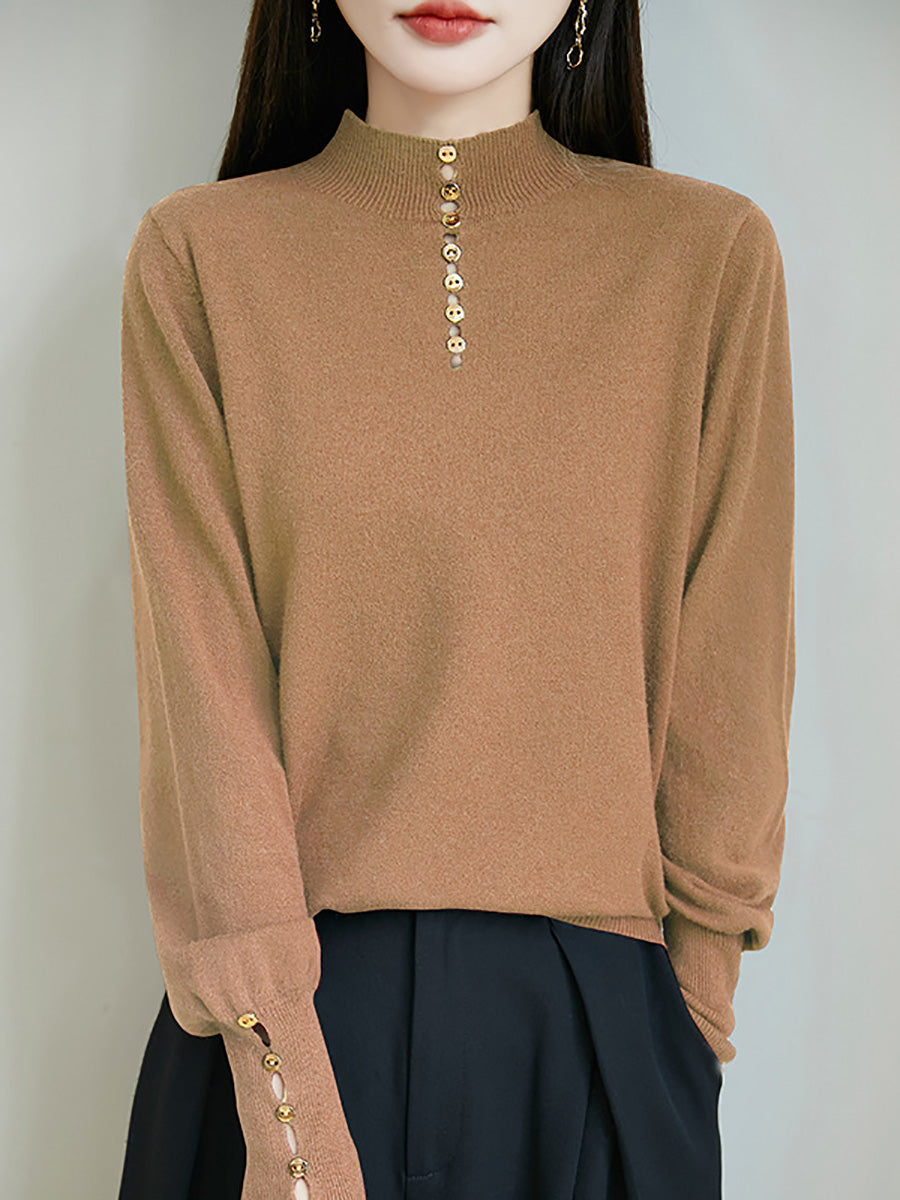 Women Autumn Artsy Pure Color Button Half-Turtleneck Sweater