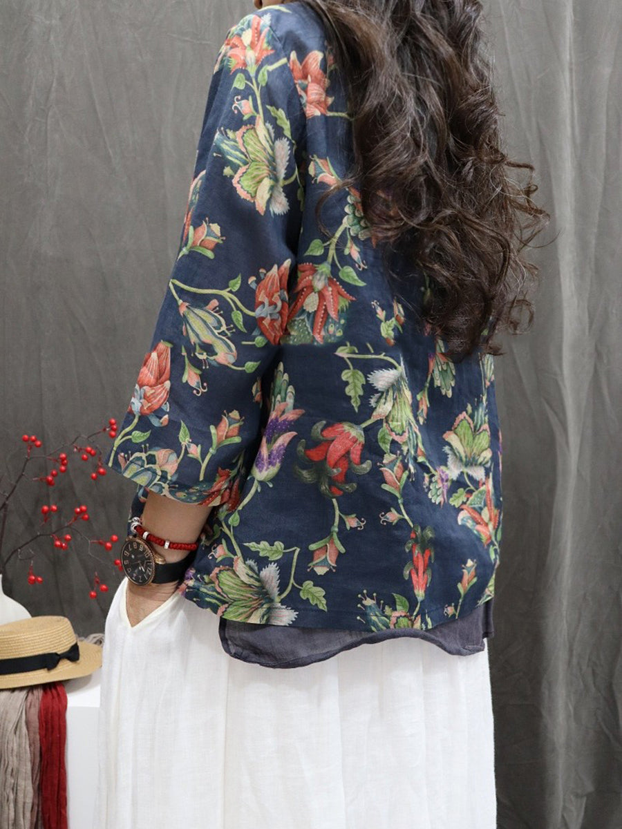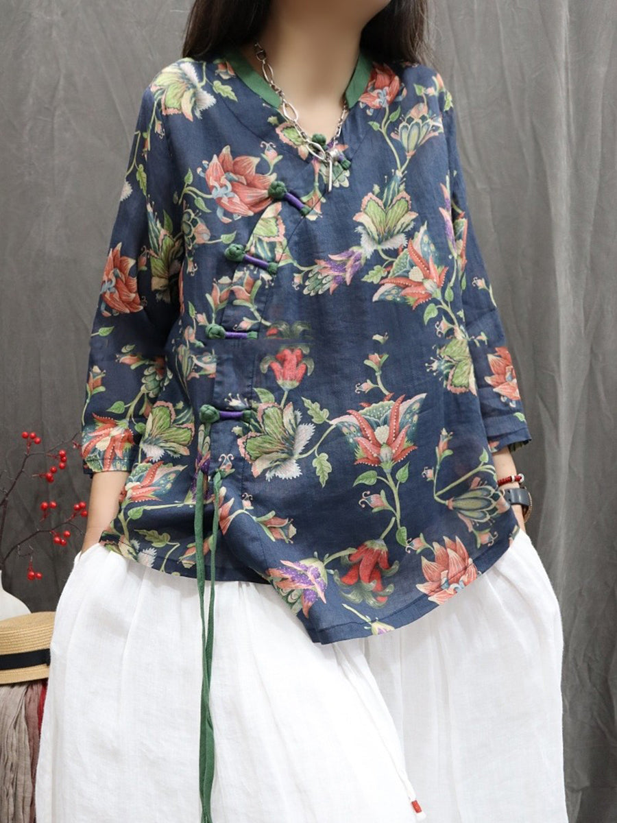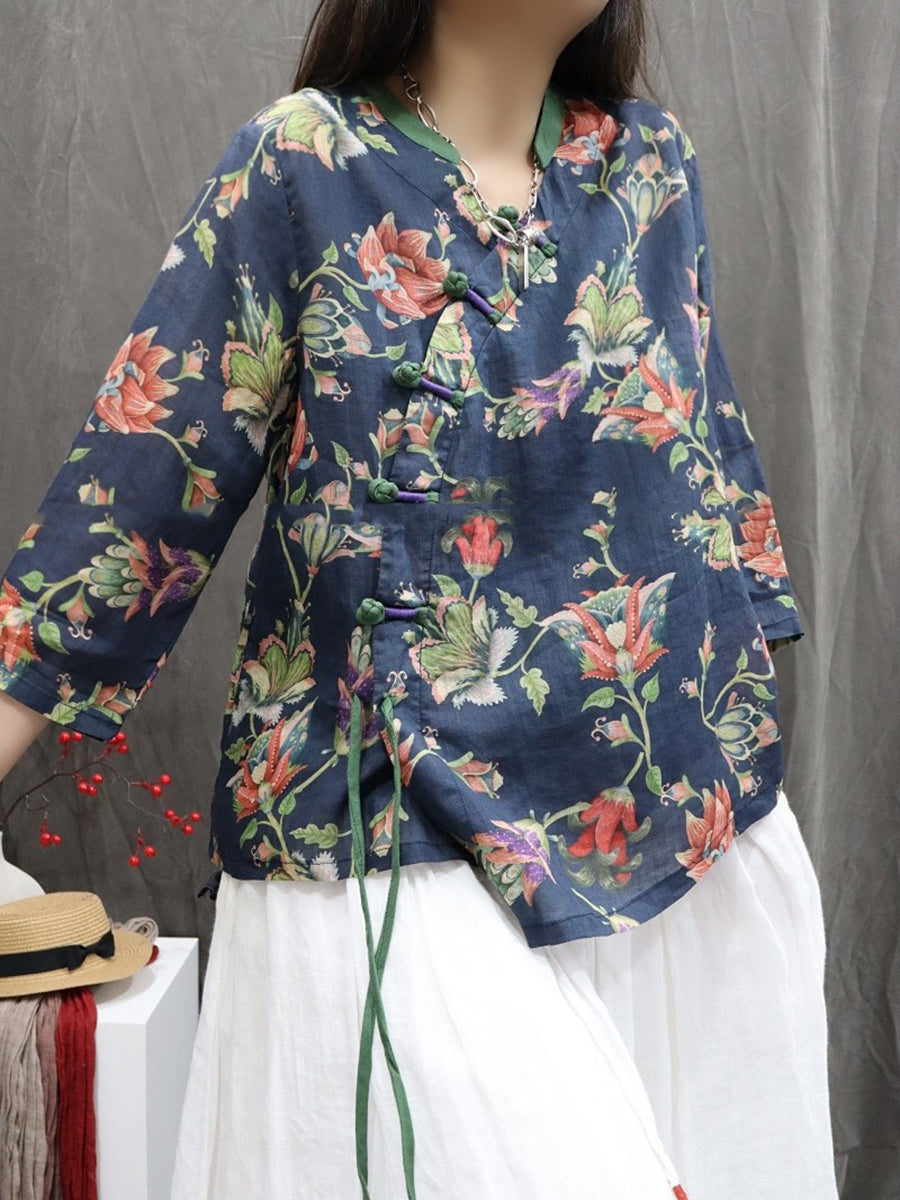 Women Ethnic Spring Flower V-Neck 100%Ramie Shirt