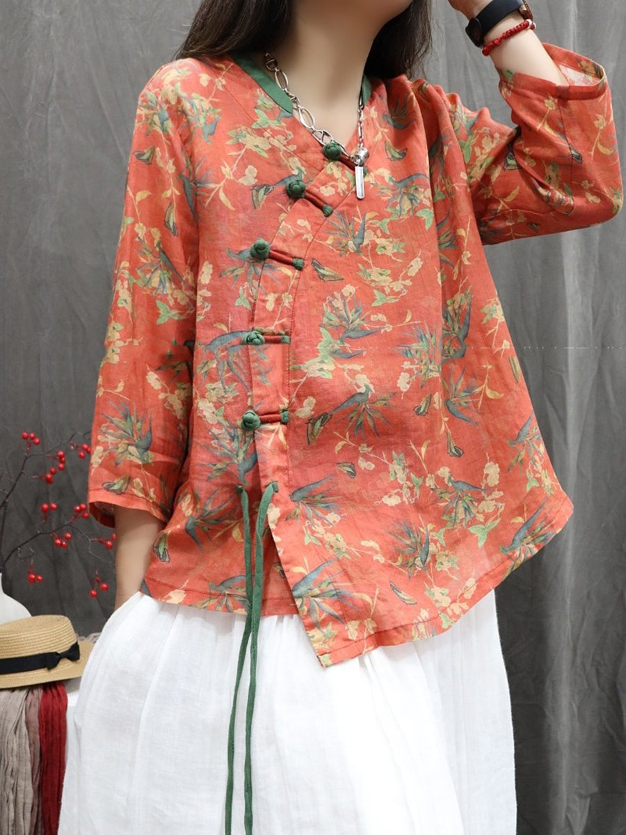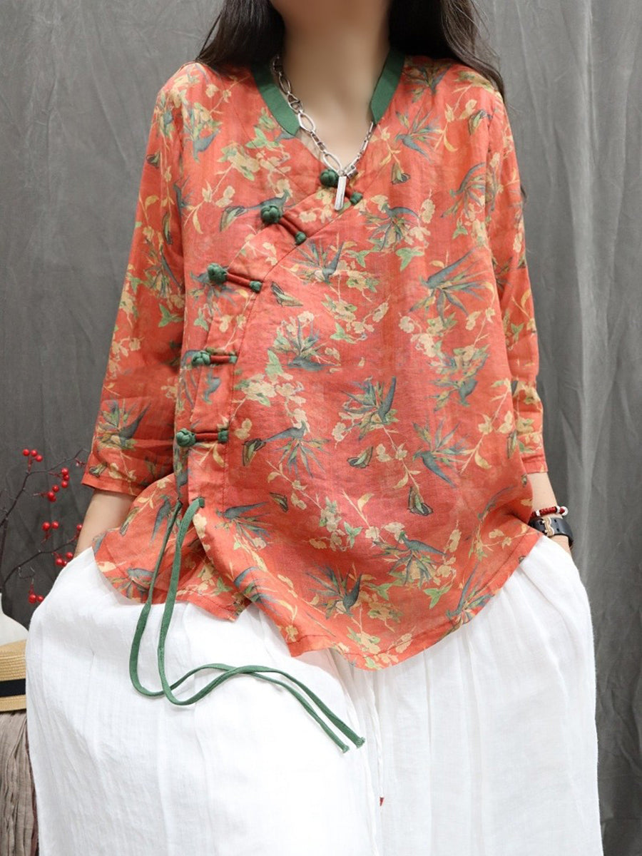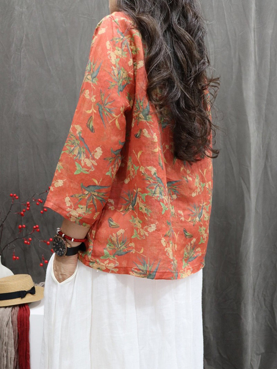 Women Ethnic Spring Flower V-Neck 100%Ramie Shirt