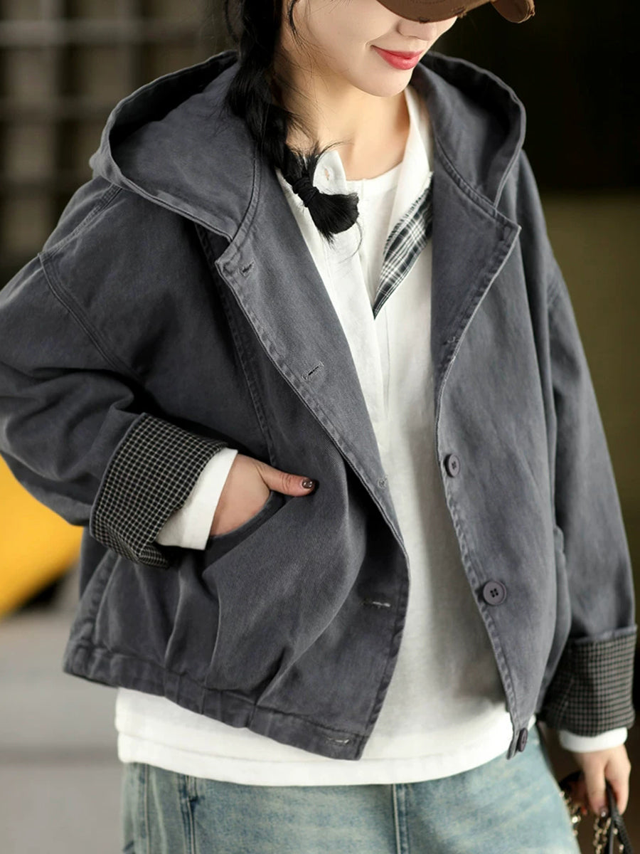Women Spring Casual Pure Color 100%Cotton Hooded Coat