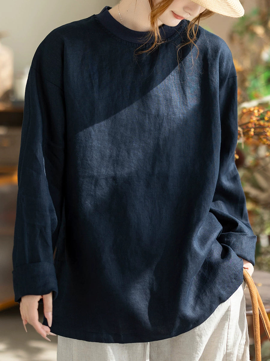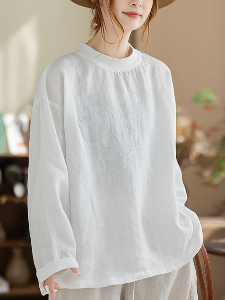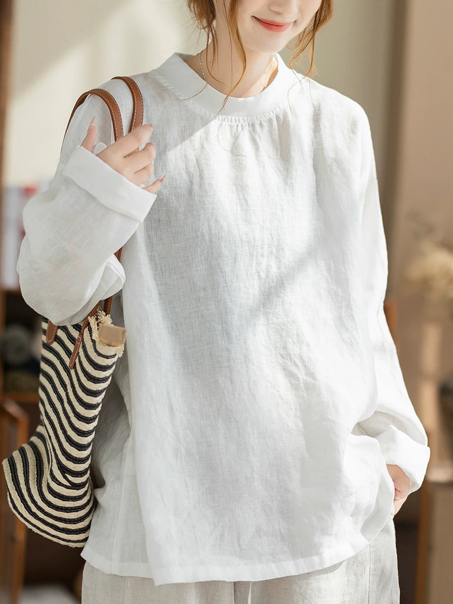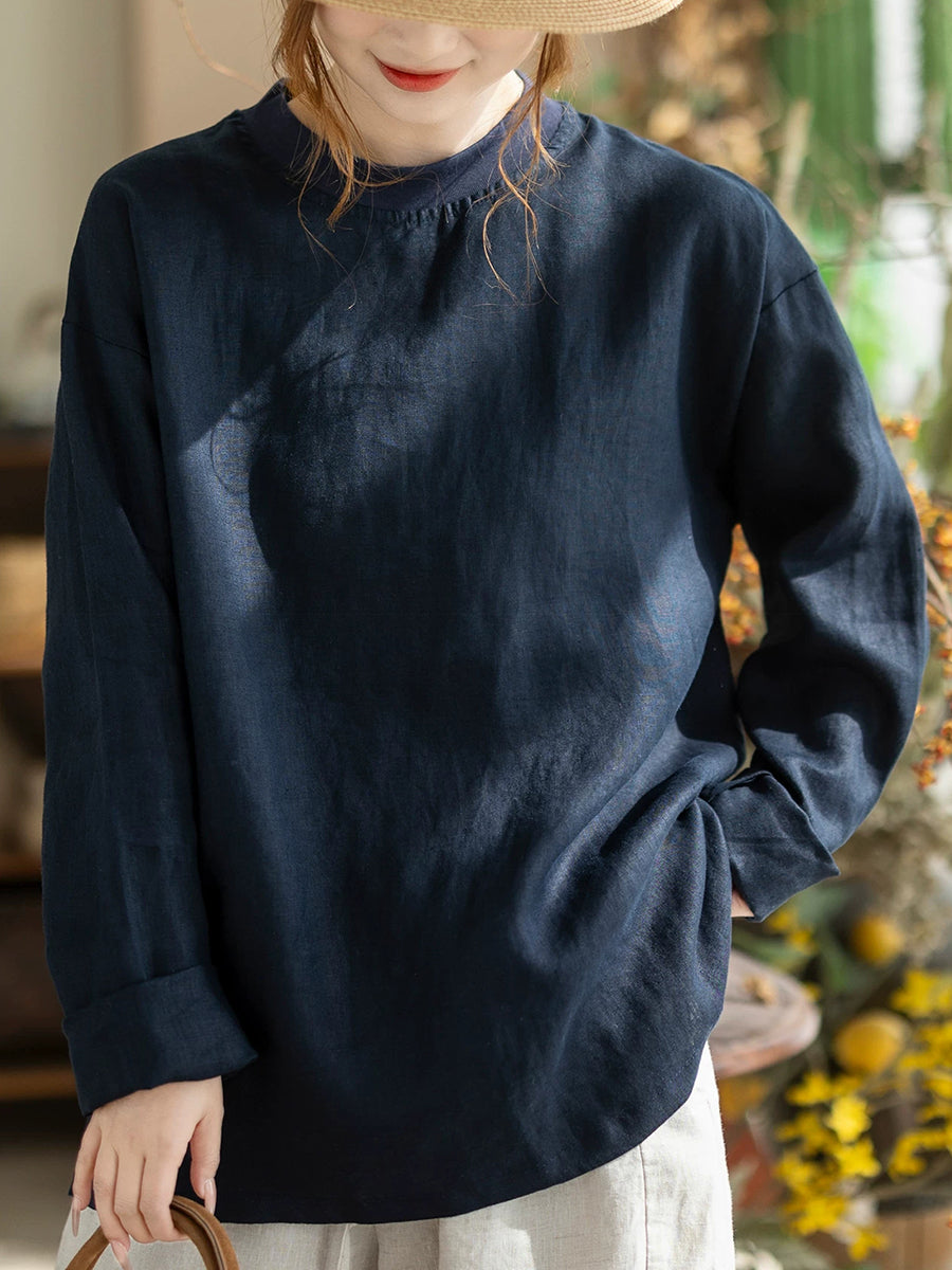 Women Spring Casual Pure Color Stand Collar Hemp Shirt