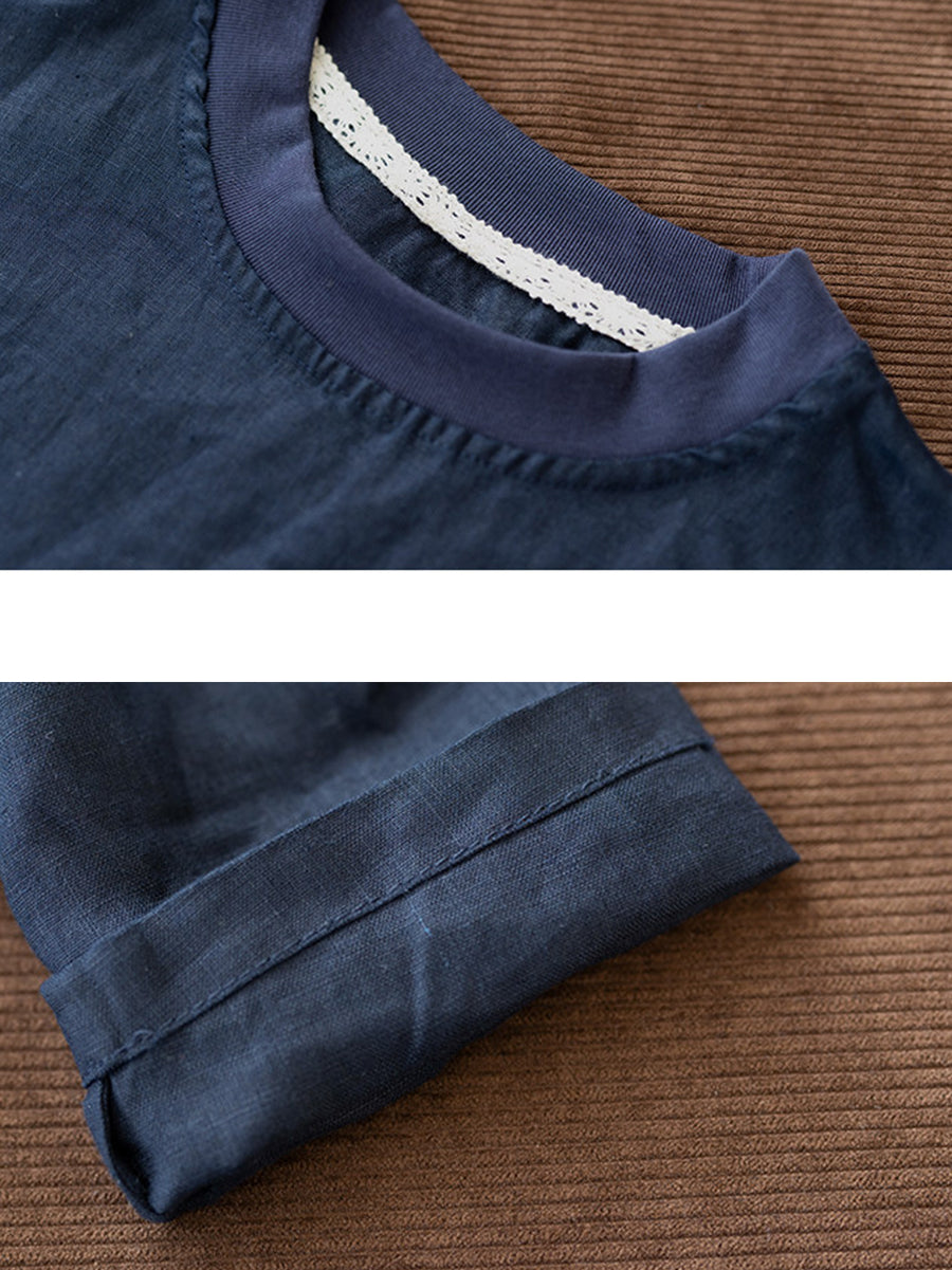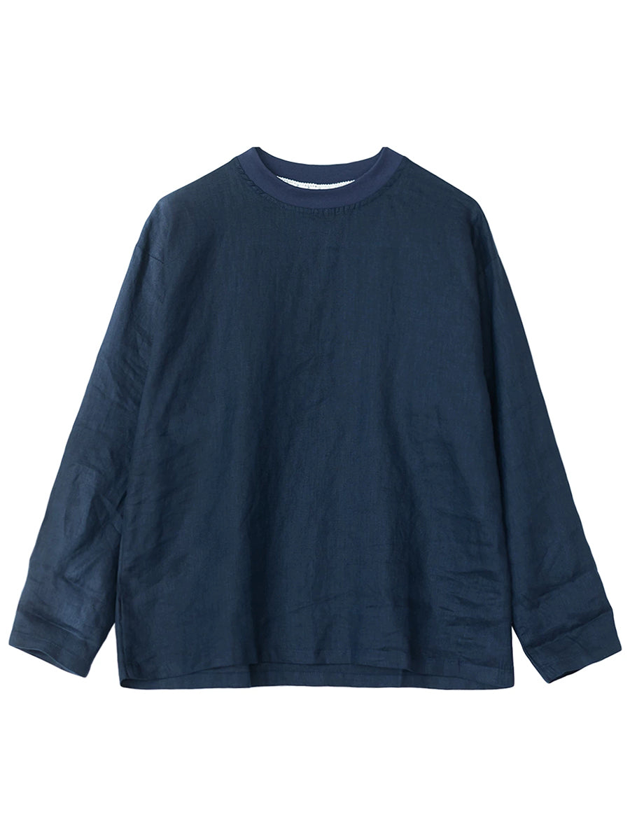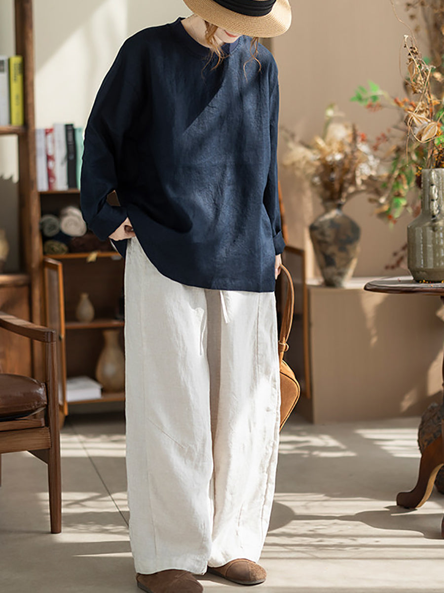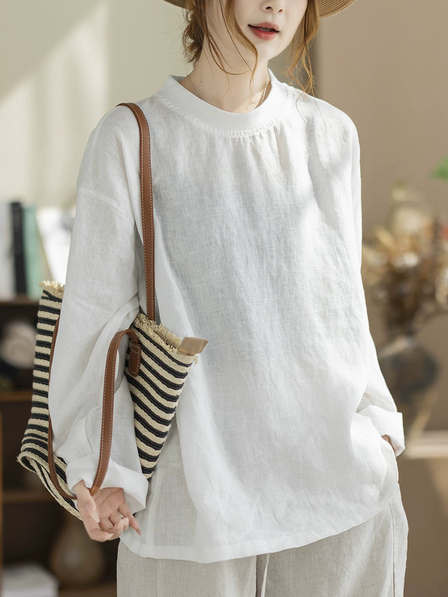 Women Spring Casual Pure Color Stand Collar Hemp Shirt