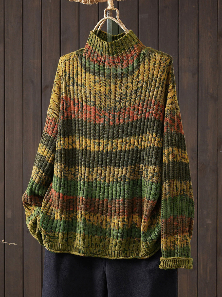 Women Autumn Colorblock Stripe Half-Turtleneck Sweater