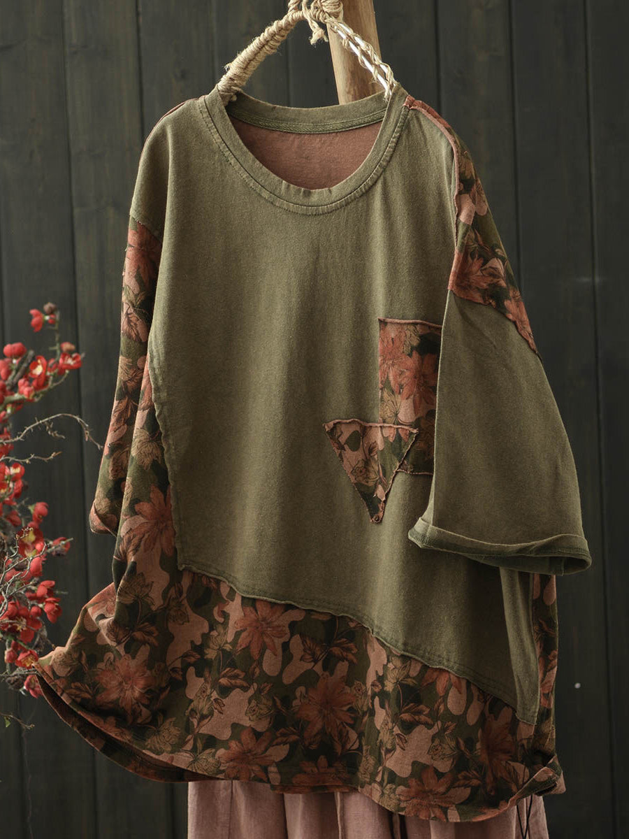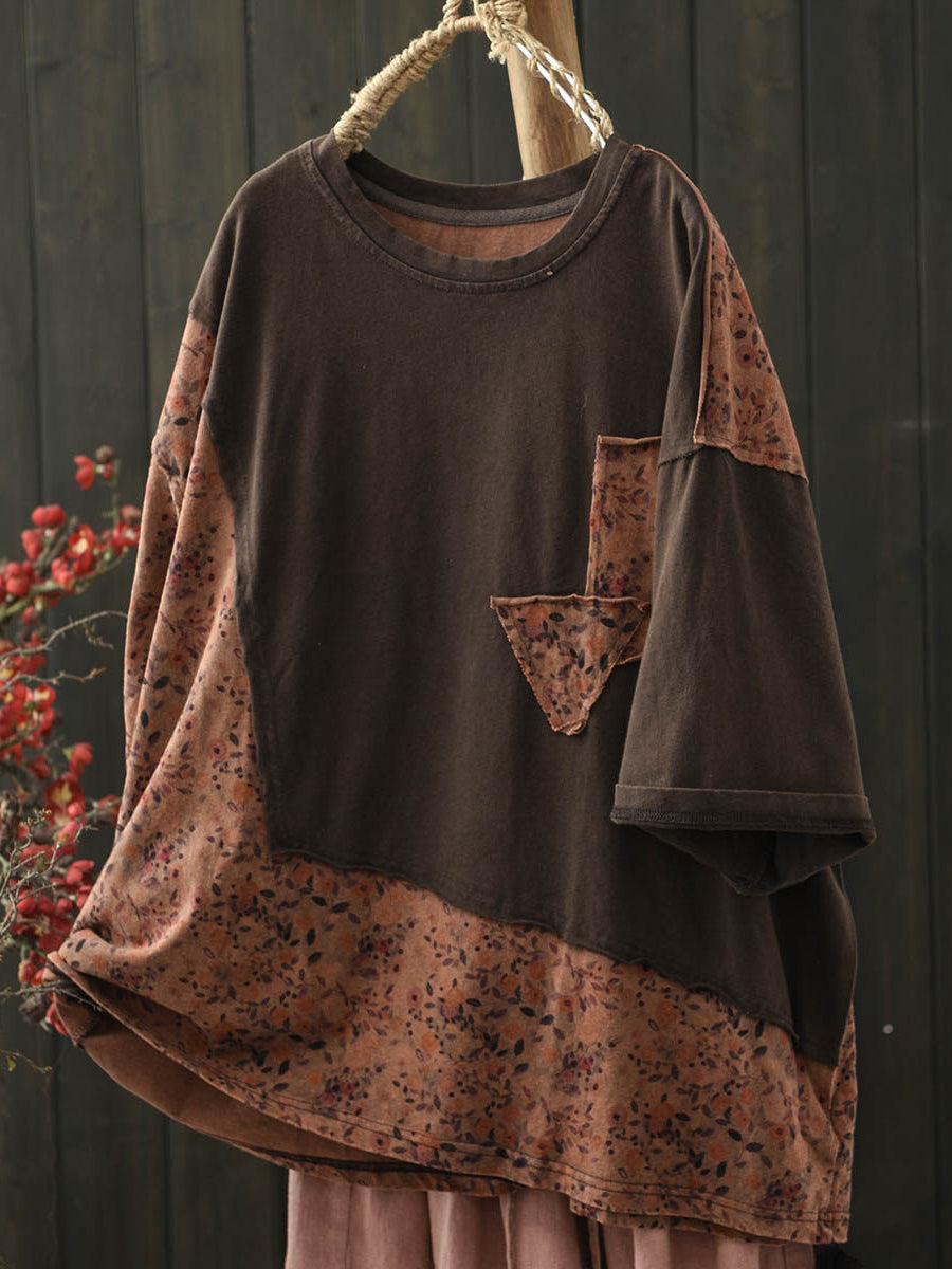 Women Summer Vintage Flower Spliced O-Neck Shirt