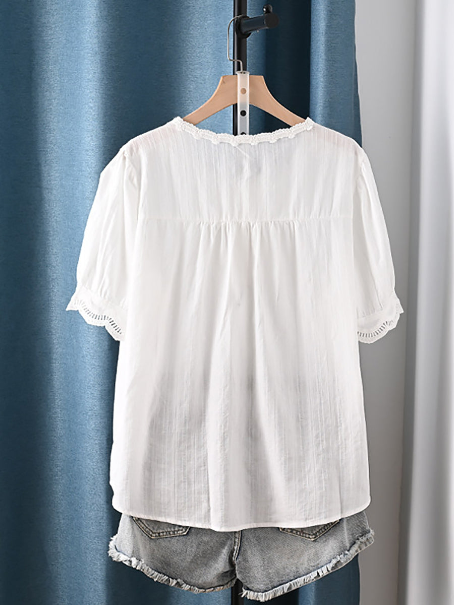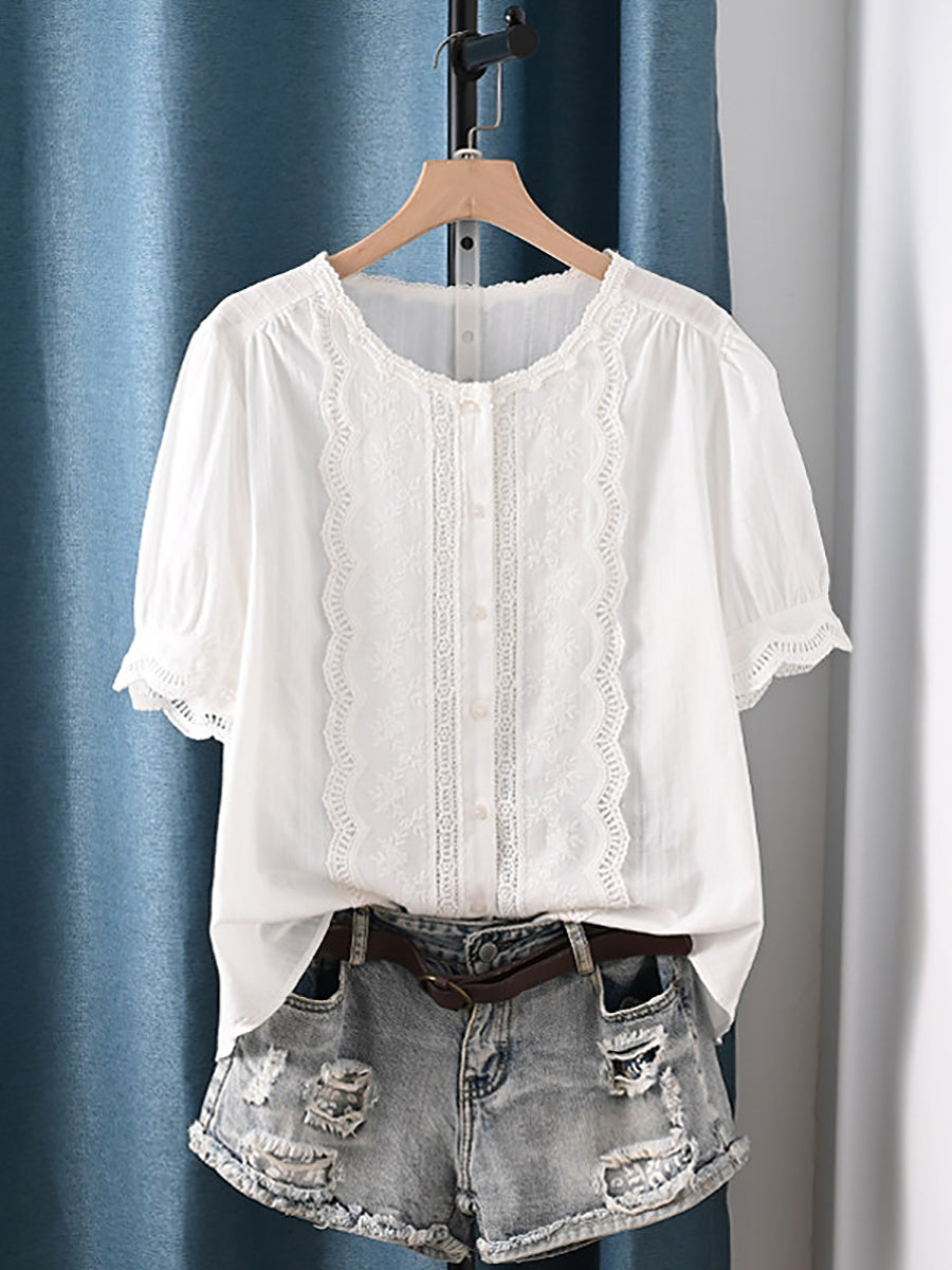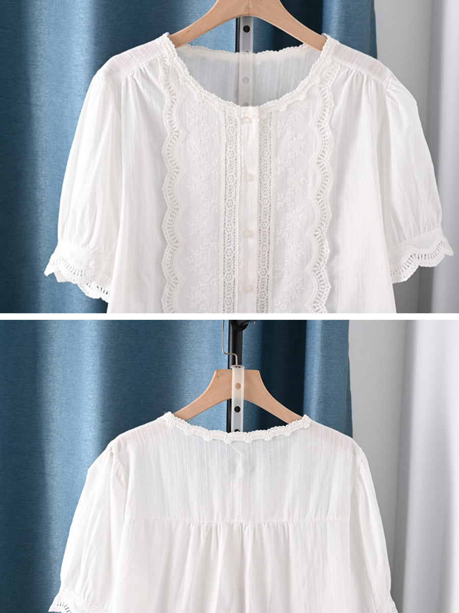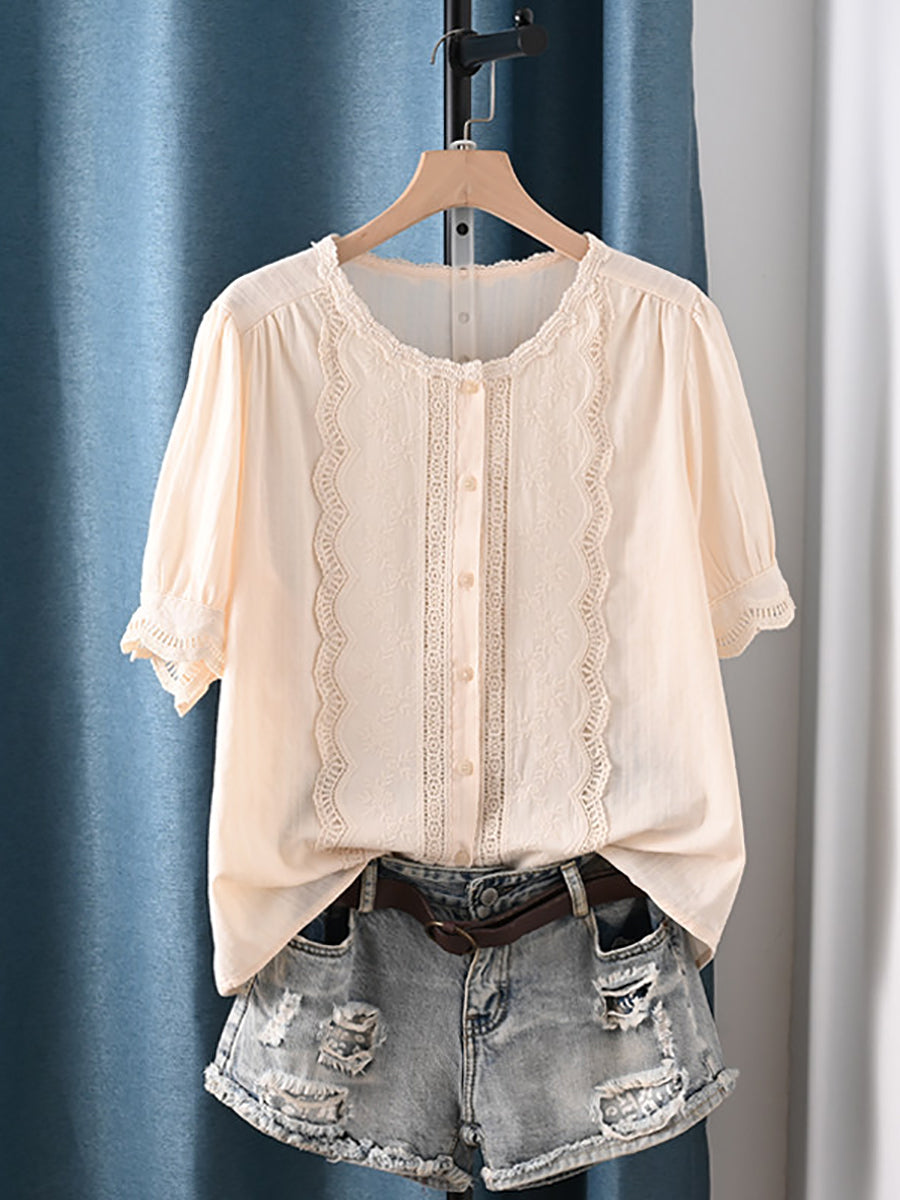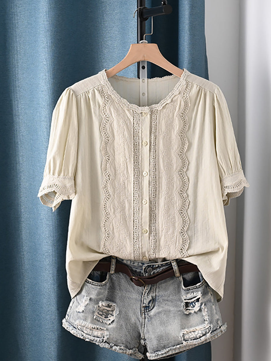 Women Summer Artsy O-Neck 100%Cotton Blouse