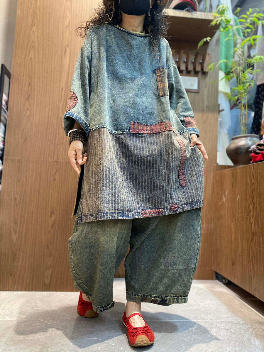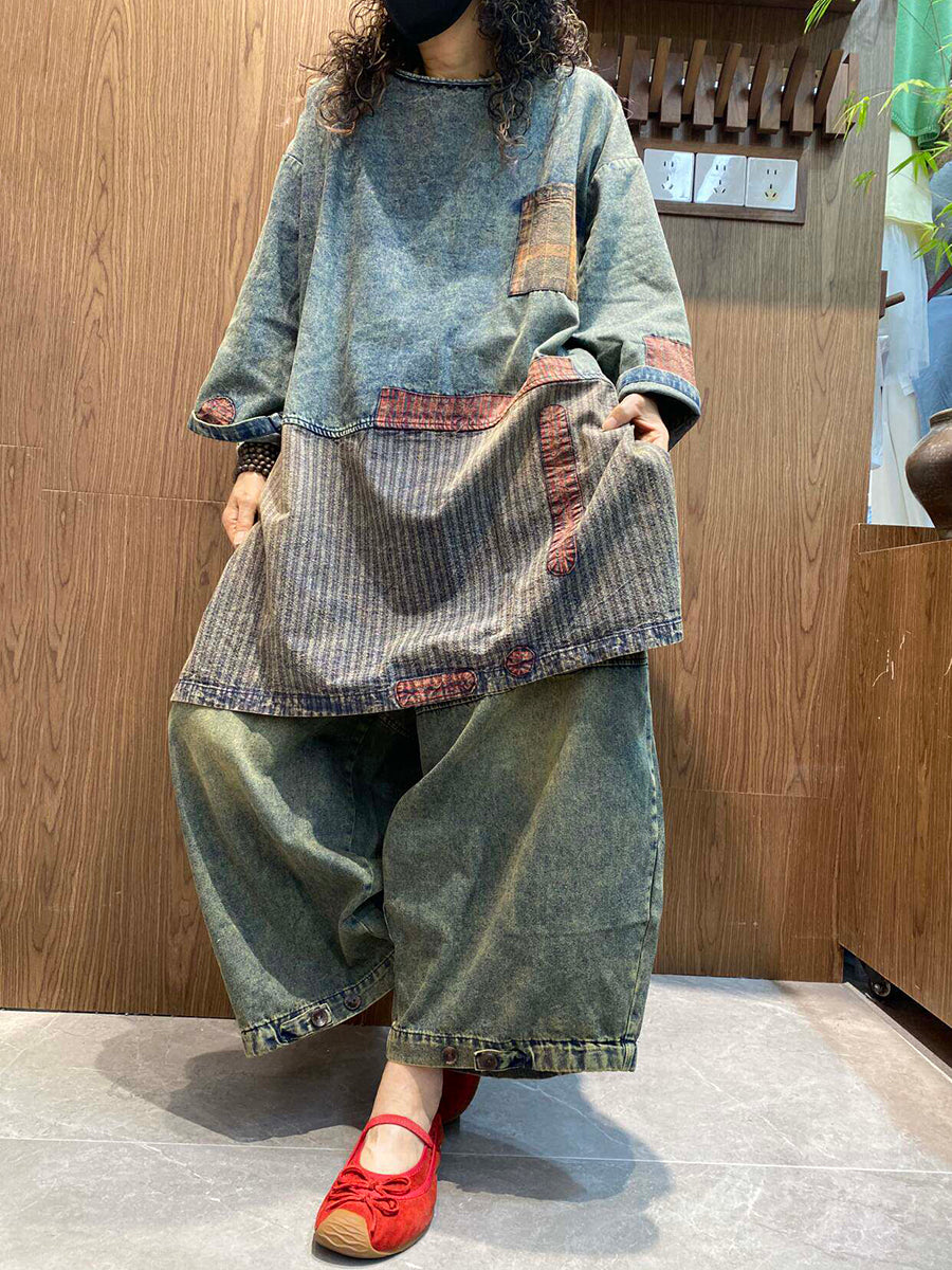 Women Spring Retro Patchwork Denim Blouse