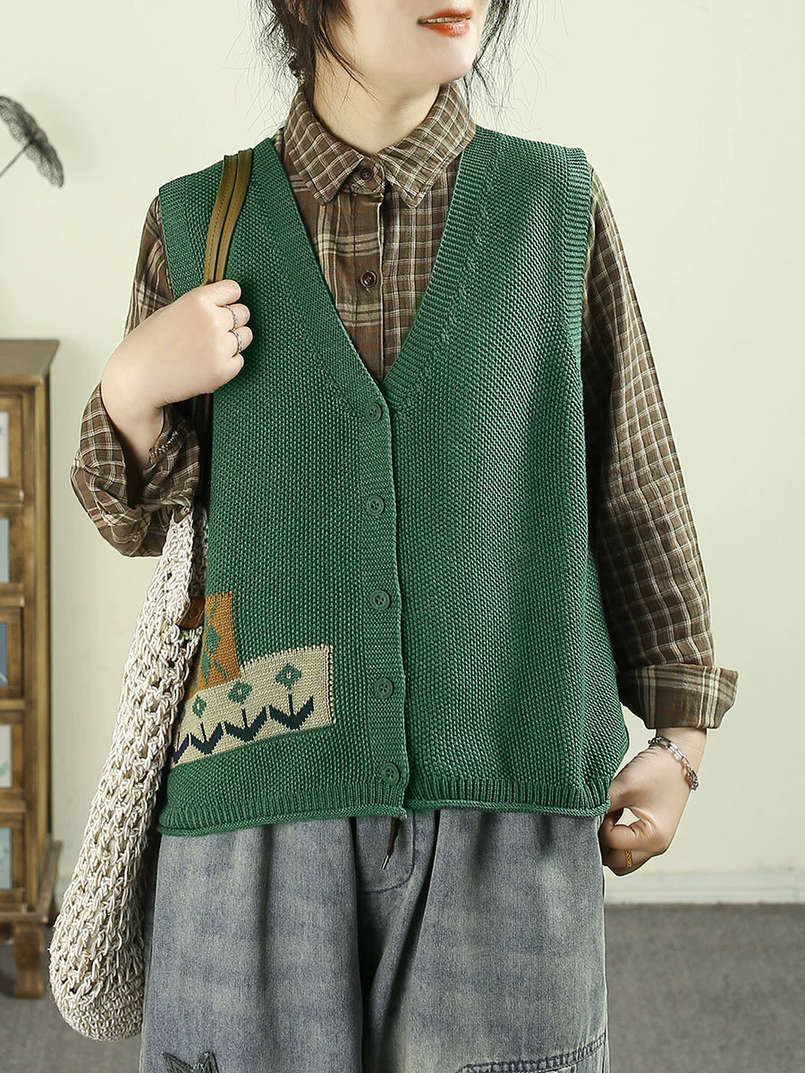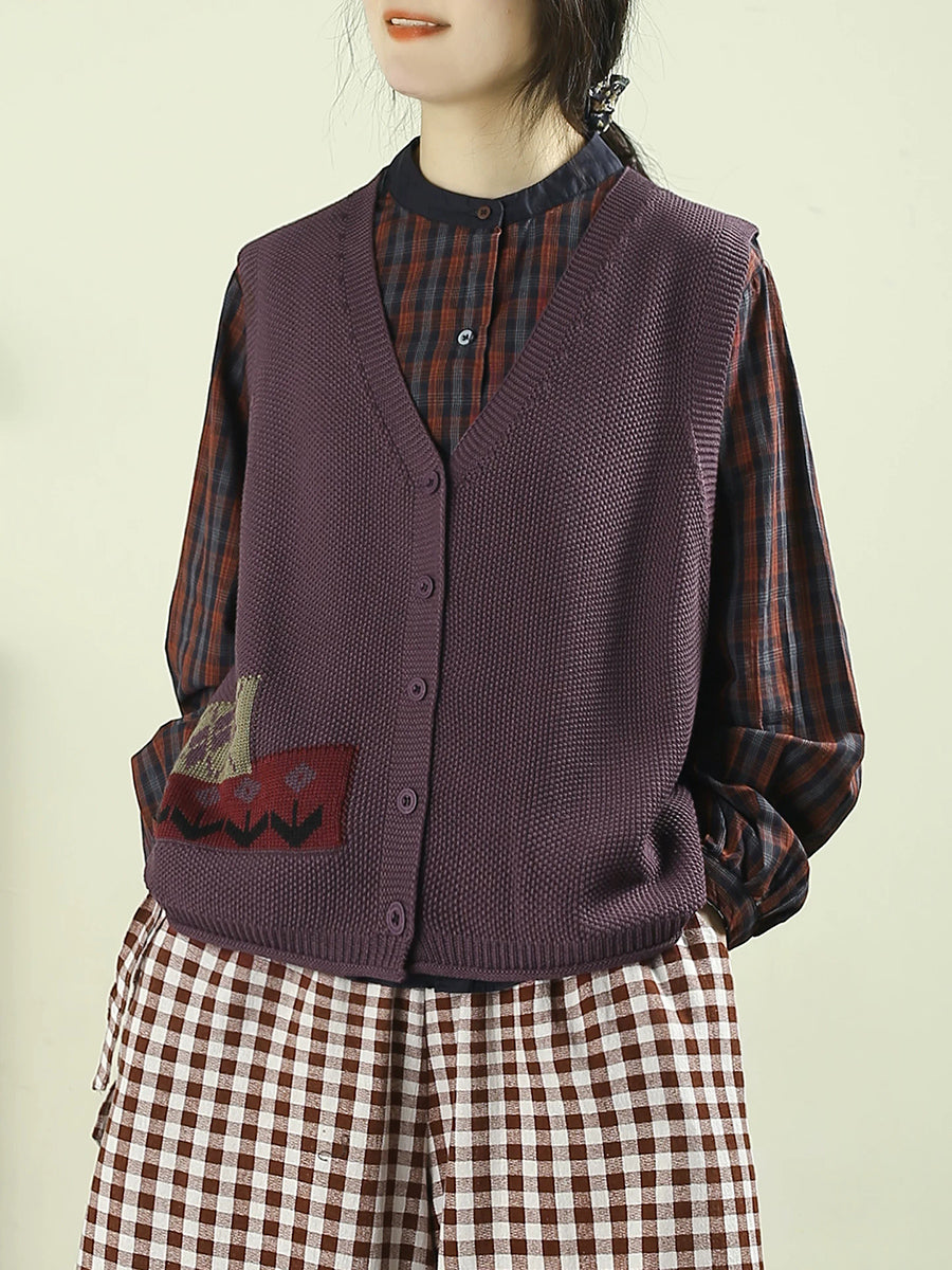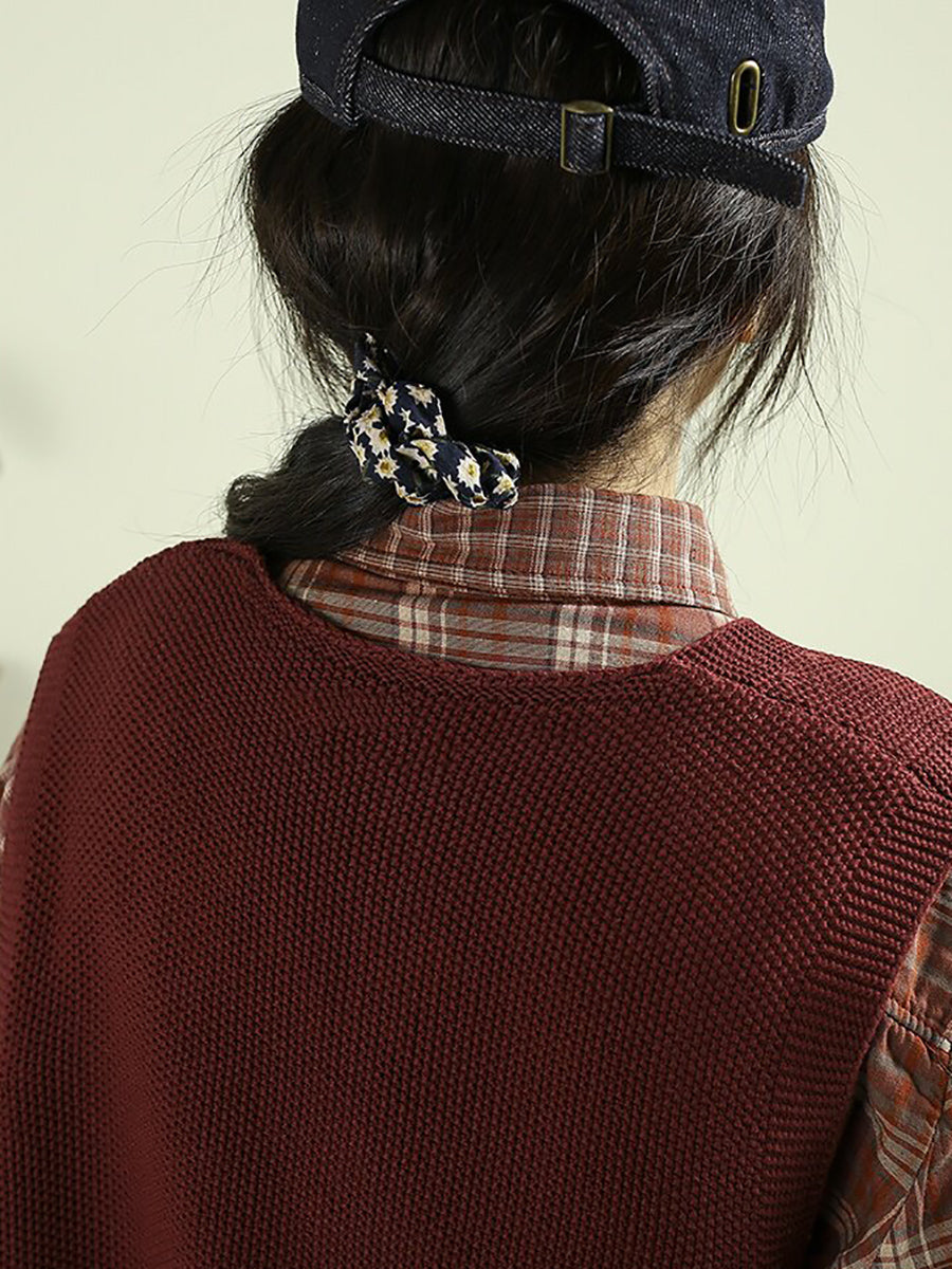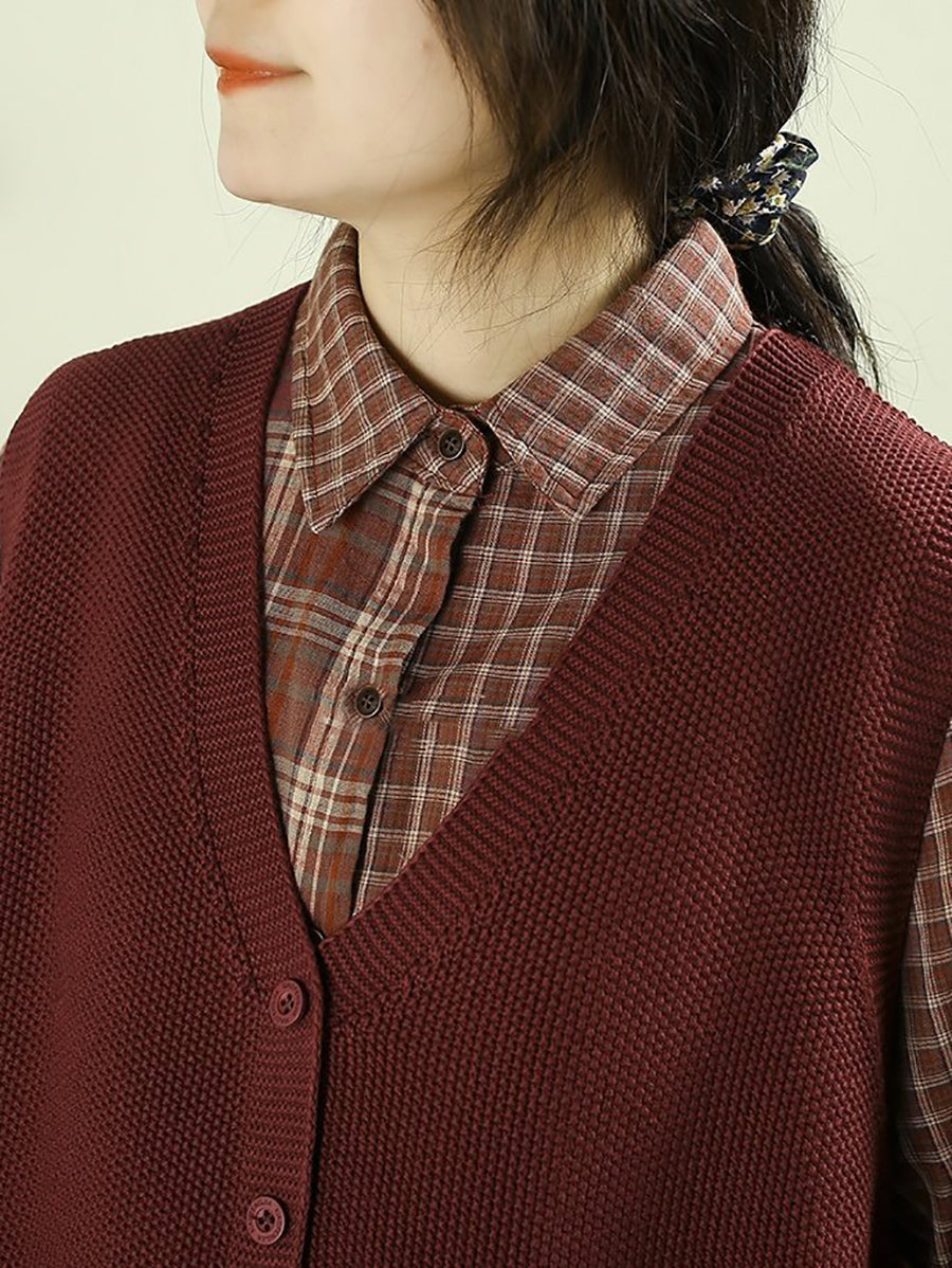 Women Spring Artsy Knitted 100%Cotton V-Neck Vest