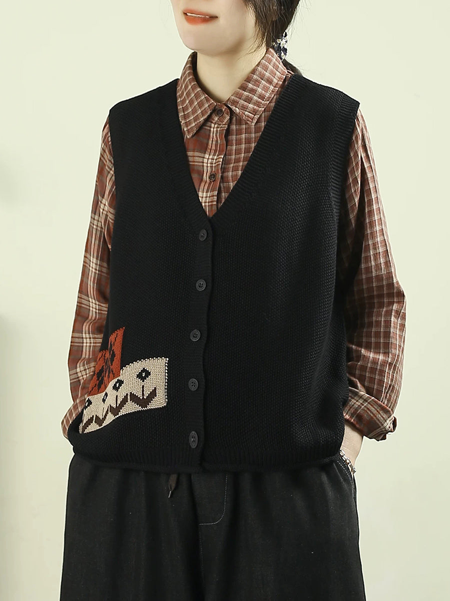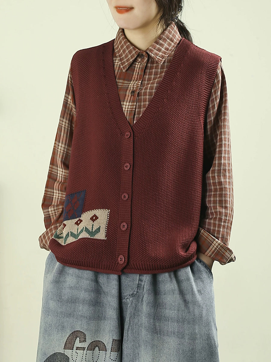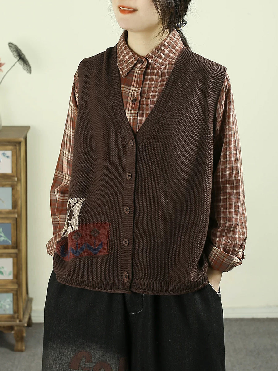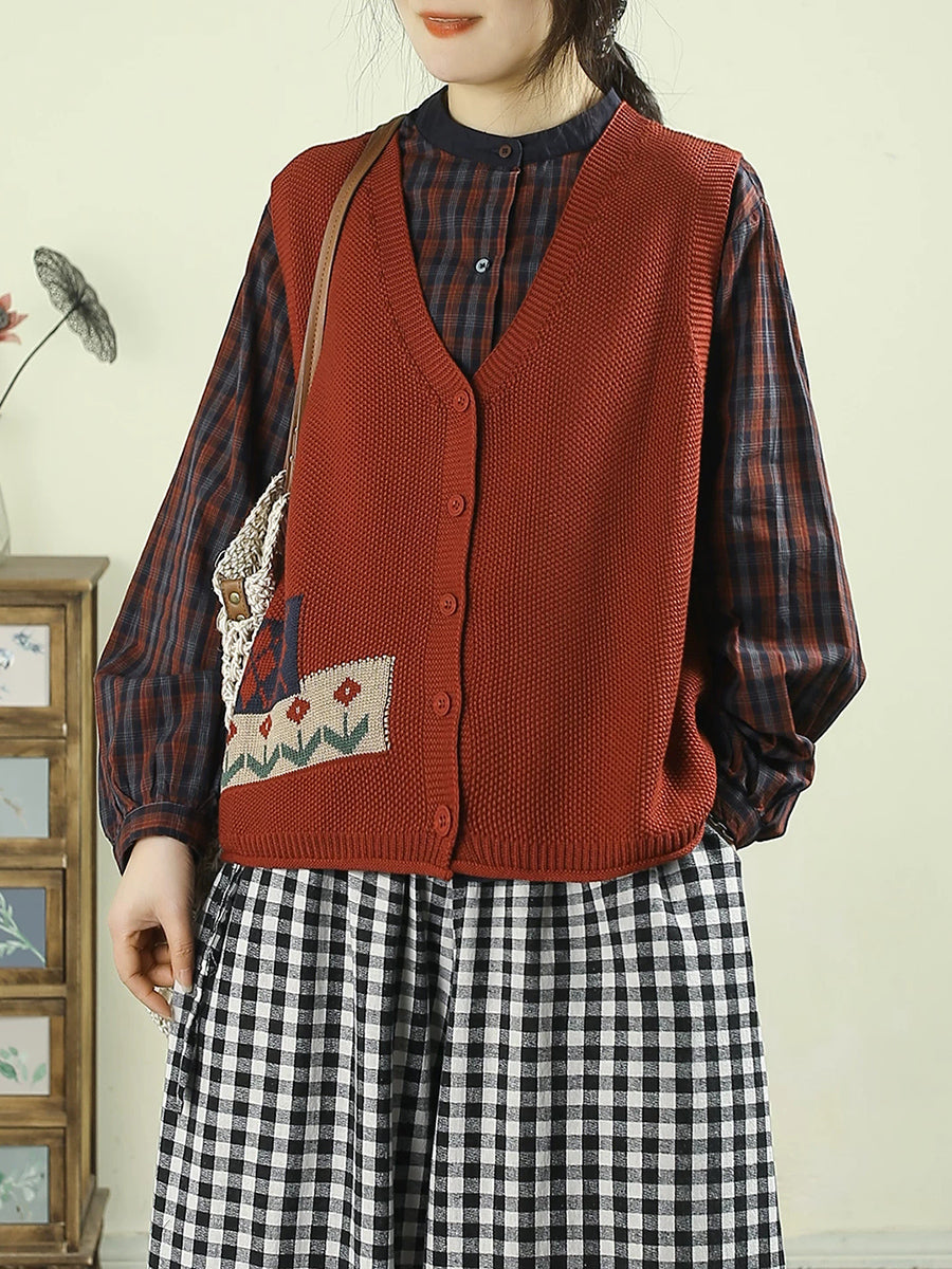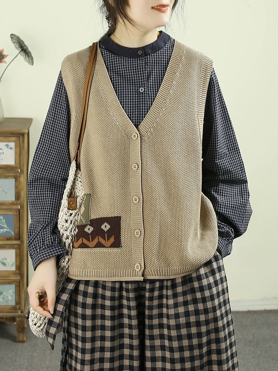 Women Spring Artsy Knitted 100%Cotton V-Neck Vest